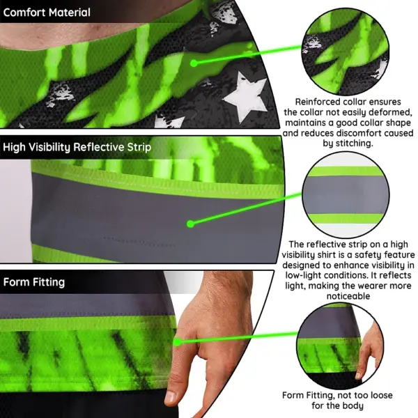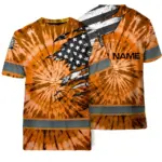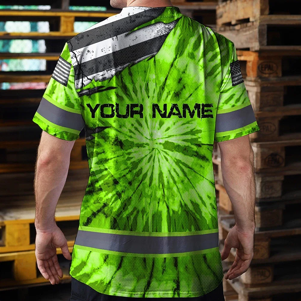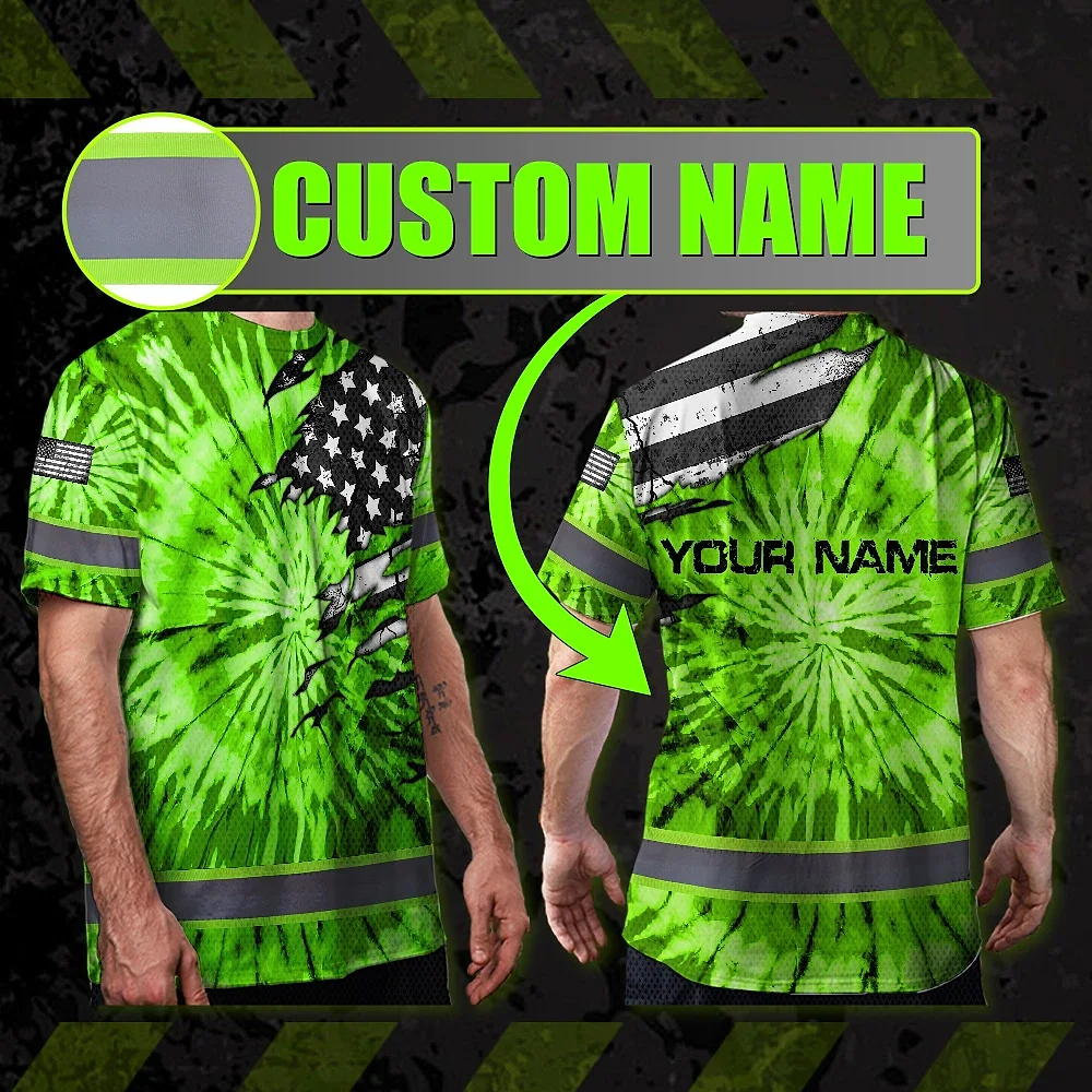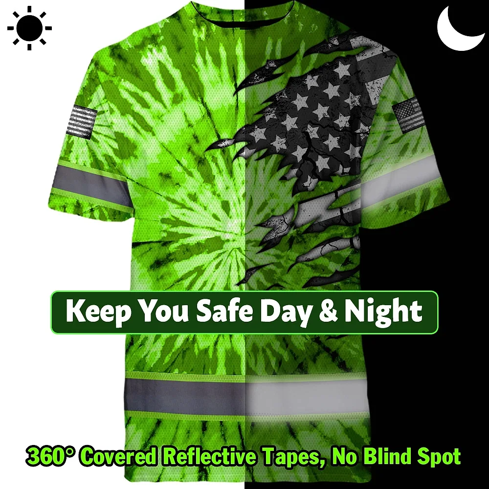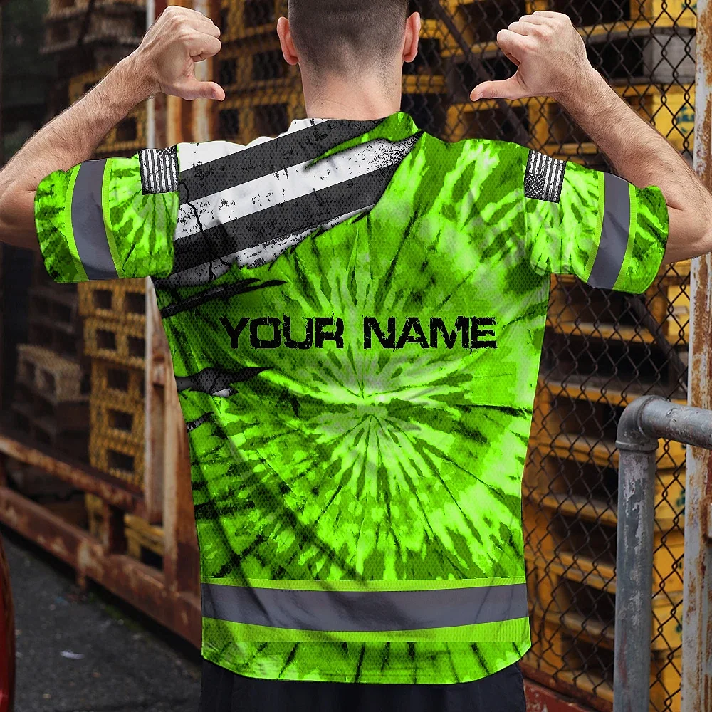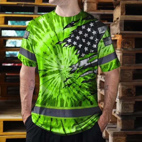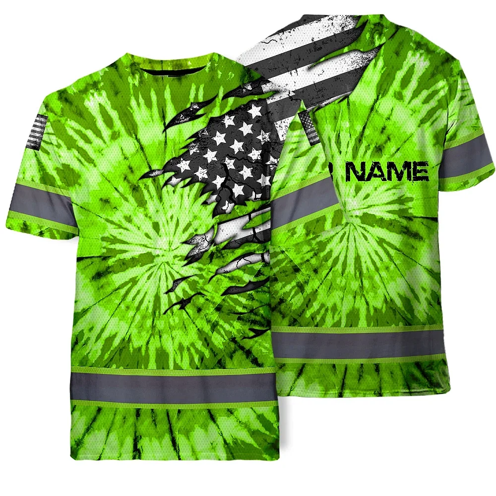 Hi Vis Shirt Reflective Tapes Green Tie Dye US Flag Scratch Custom Name Safety Workwear For Workers, Runners, Cyclists