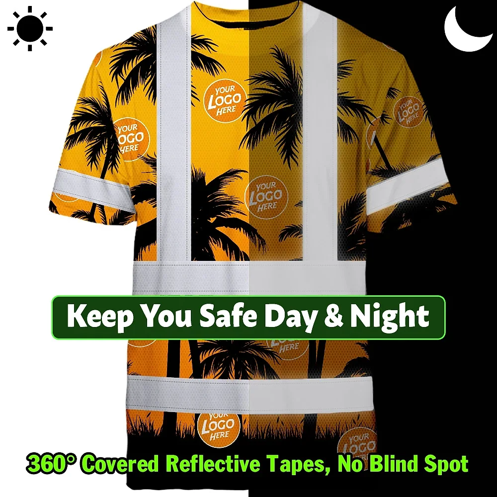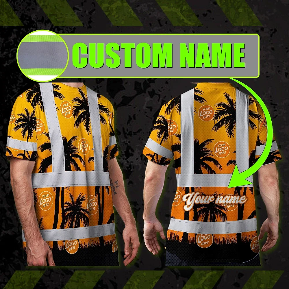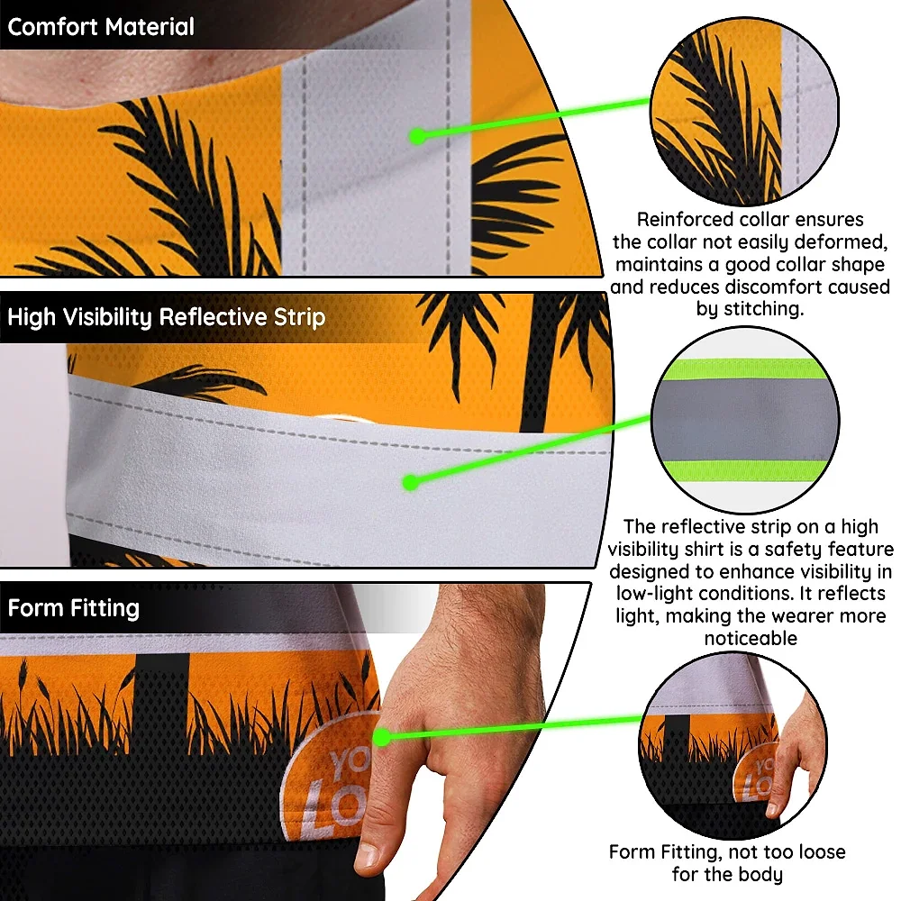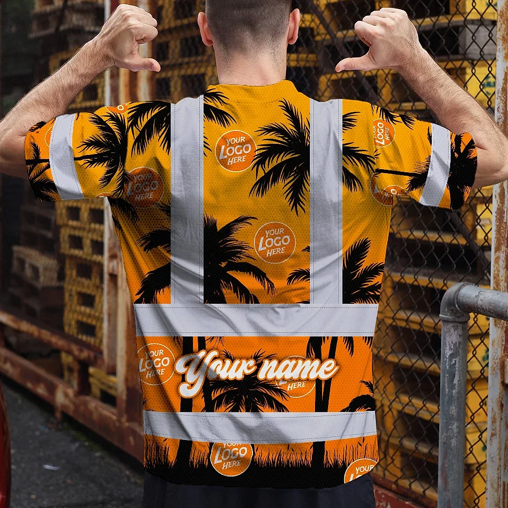 Hi Vis Shirt Reflective Tapes Orange And Black Flowers Custom Name And Logo Safety Workwear For Workers, Truckers, Operators, Company