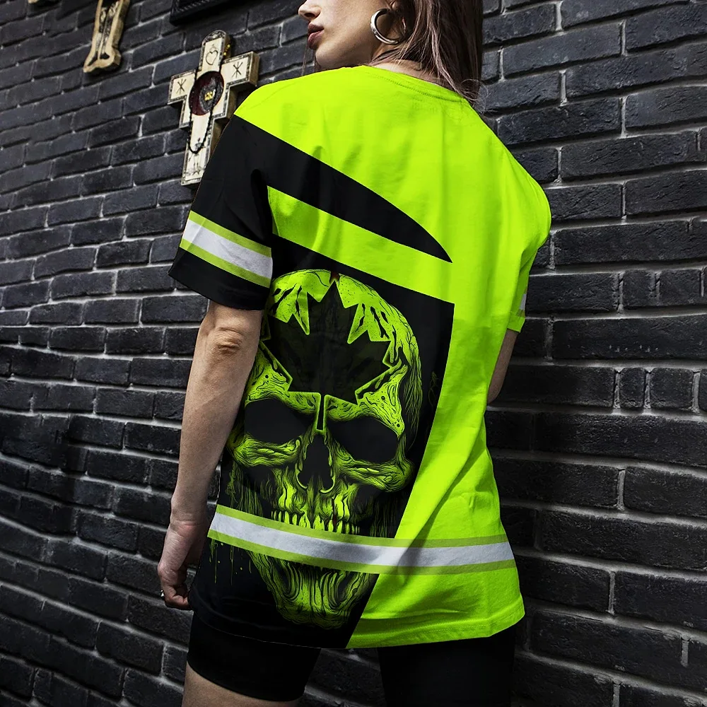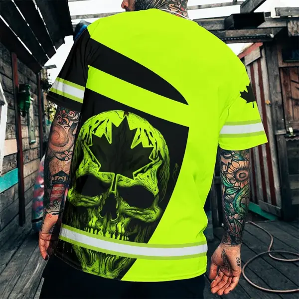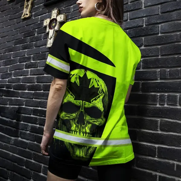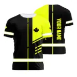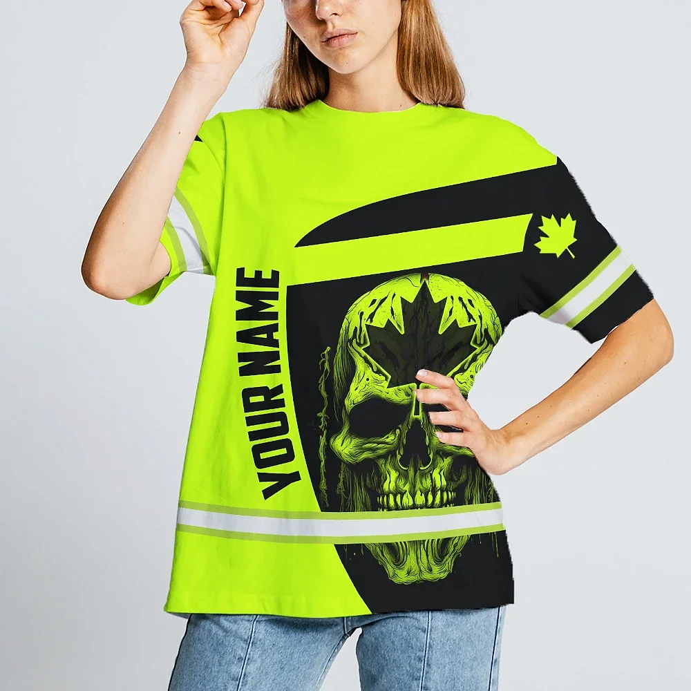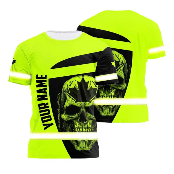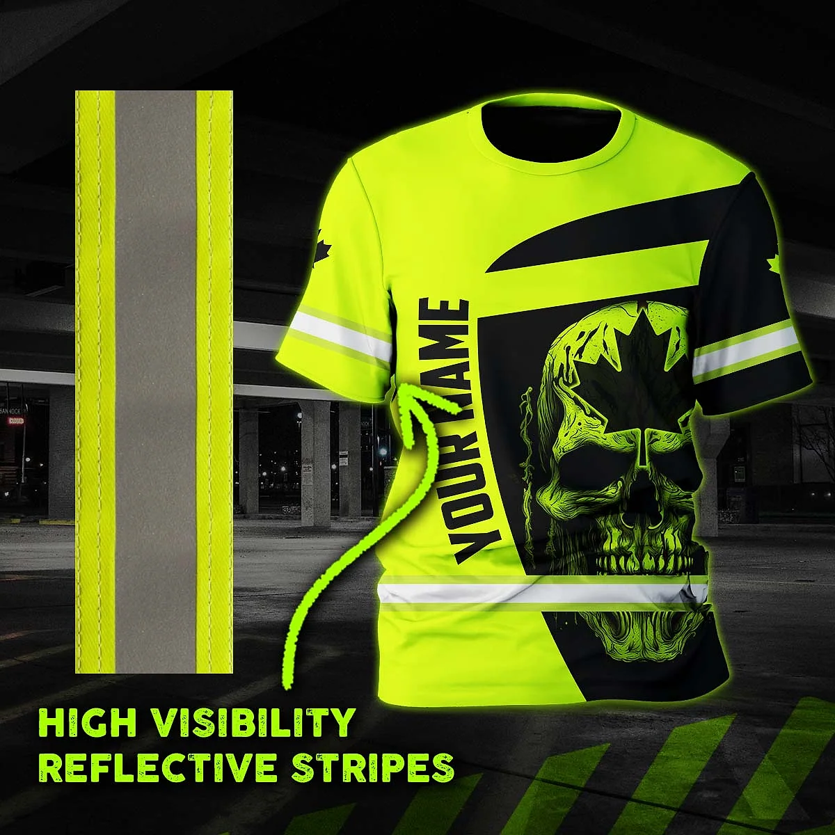 Hi Vis Shirt Reflective Tapes Orange Black Skull And Canada Flag Custom Name Safety Workwear For Worker, Operator, Patriotic