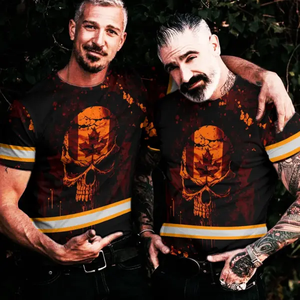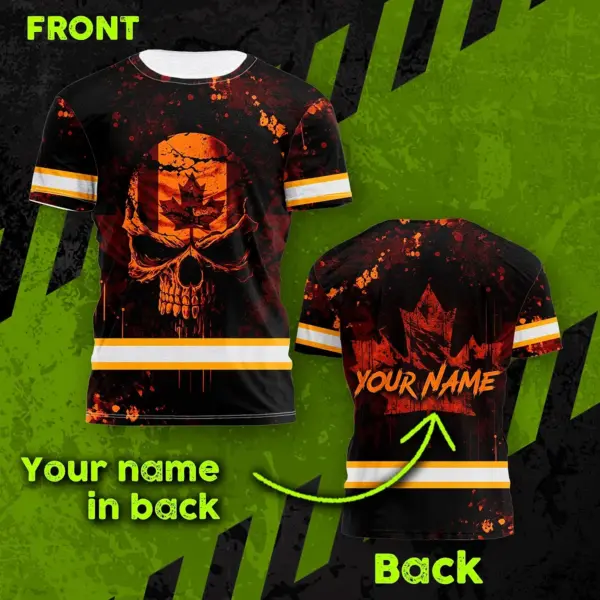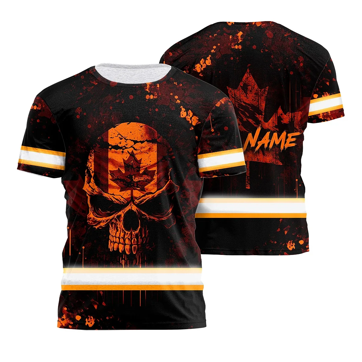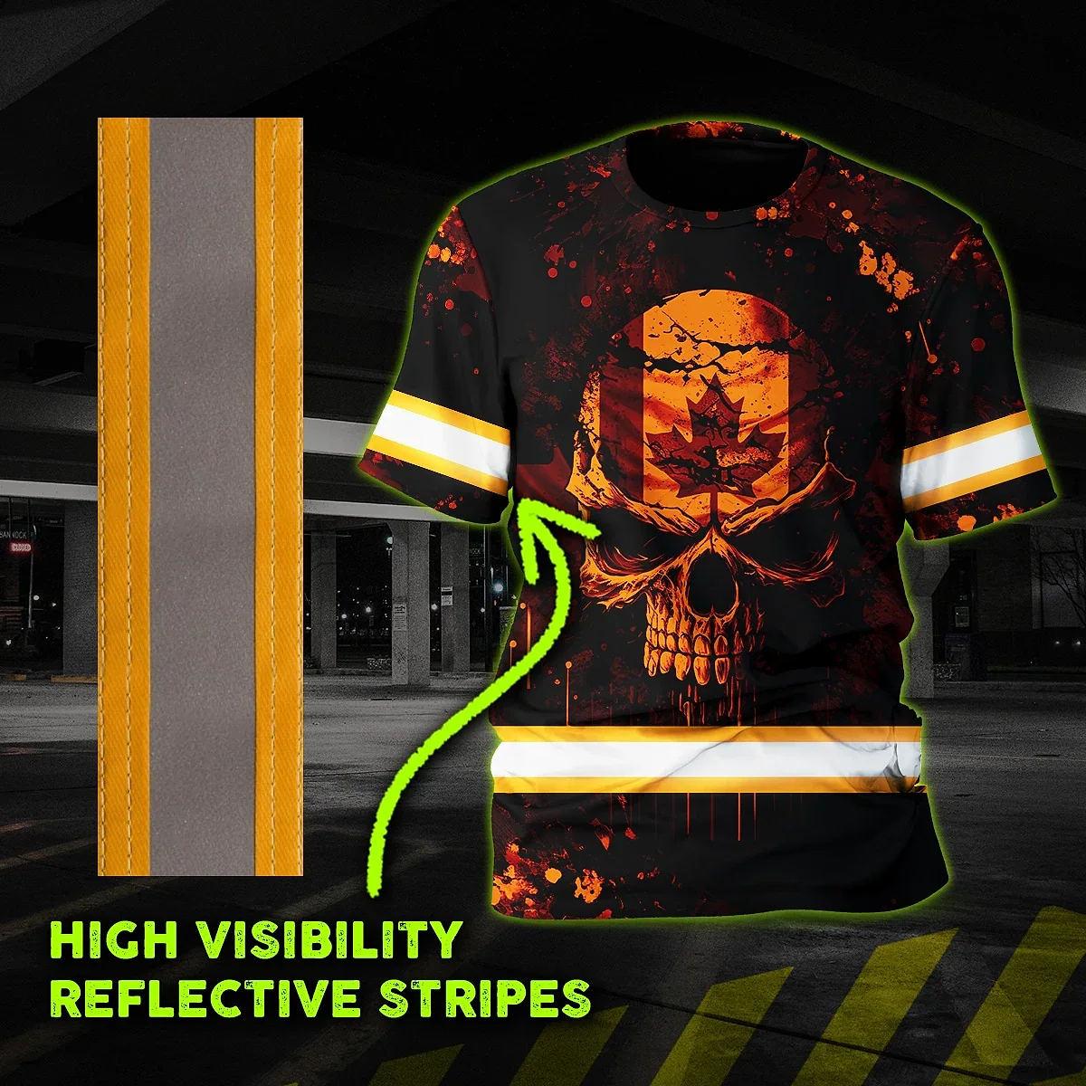 Hi Vis Shirt Reflective Tapes Orange Neon Skull With Canada Flag Custom Name Safety Workwear For Worker, Operator, Patriotic