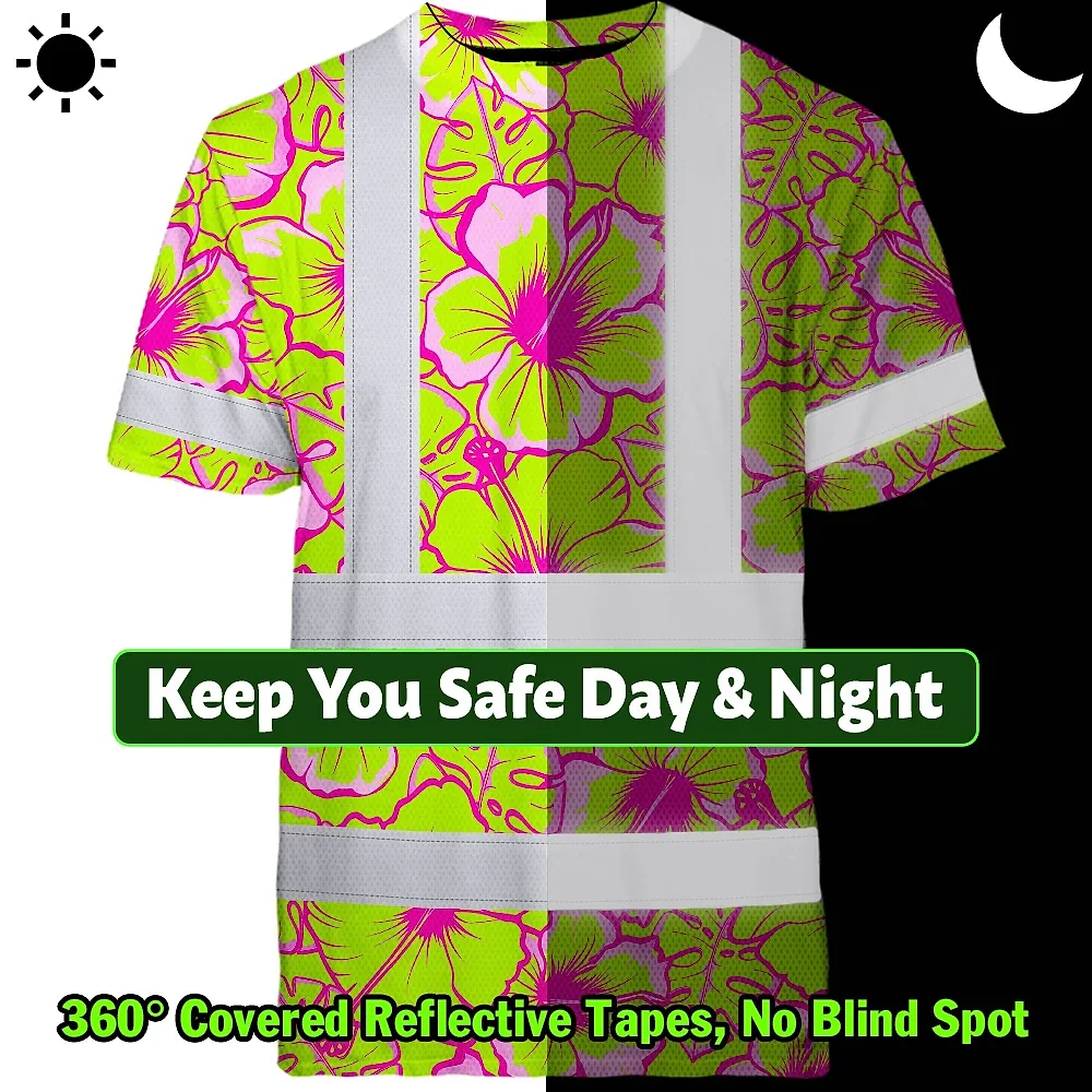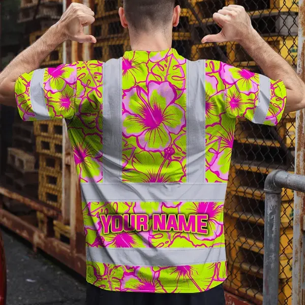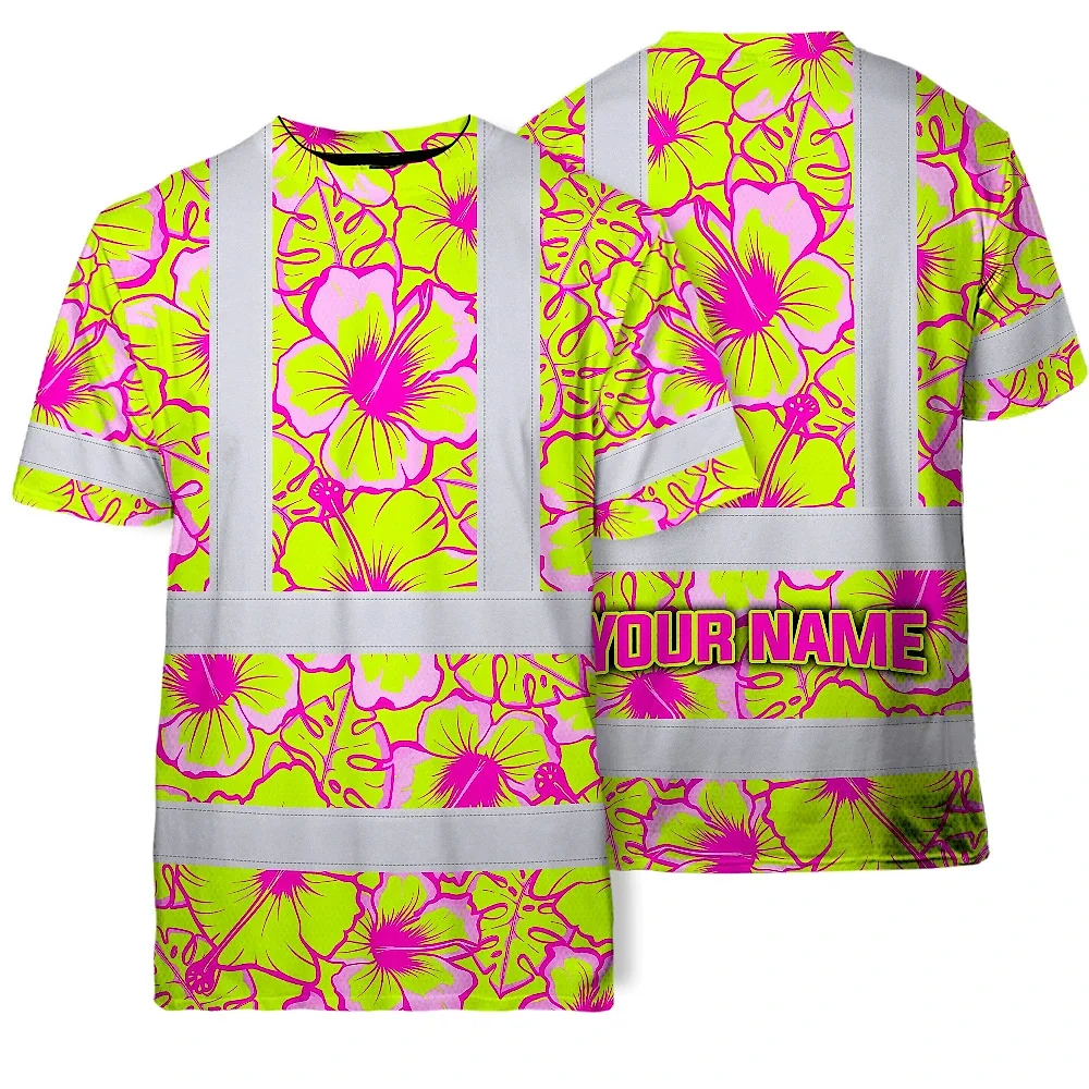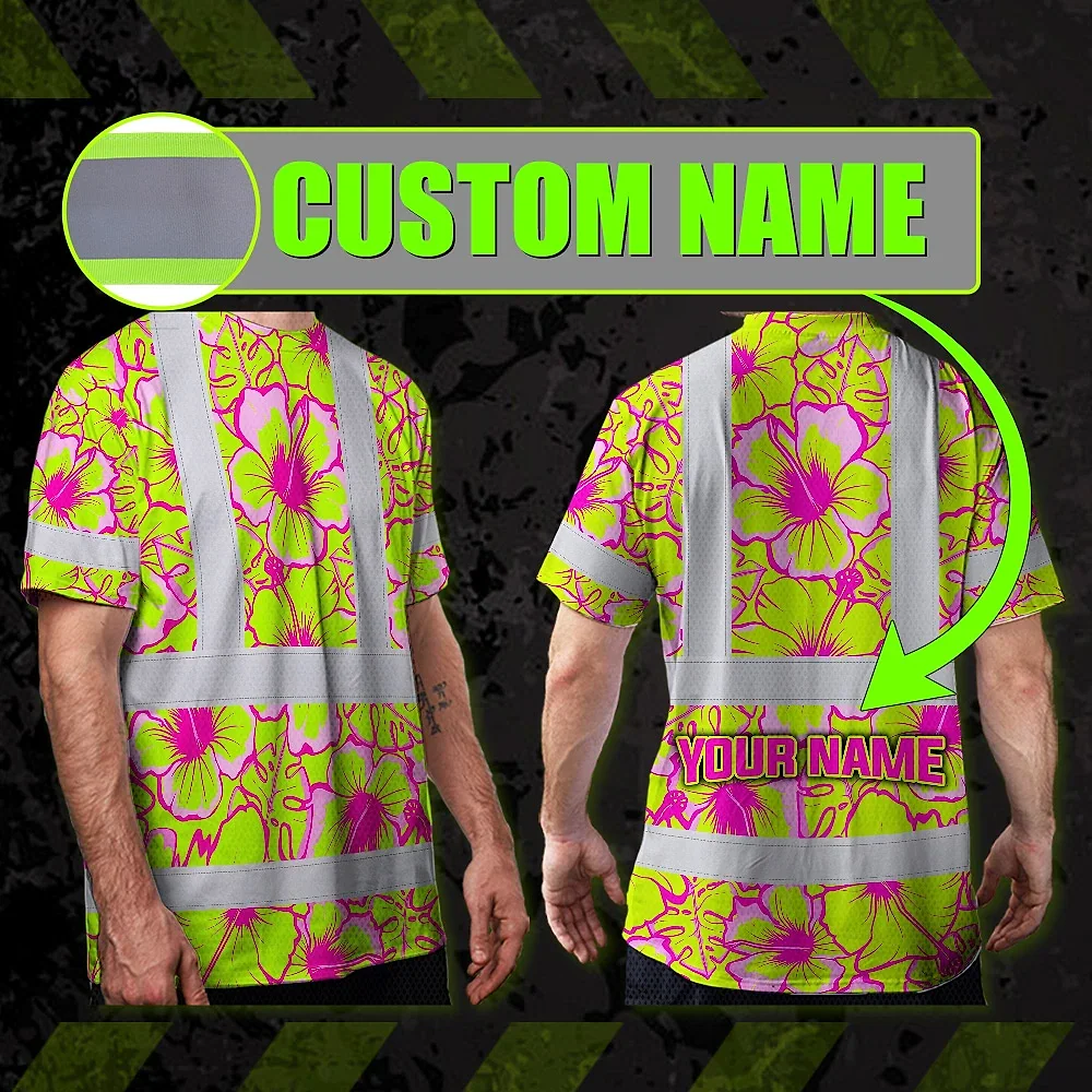 Hi Vis Shirt Reflective Tapes Pink Neon And Lime Flowers Custom Name Safety Workwear For Workers, Truckers, Operators
