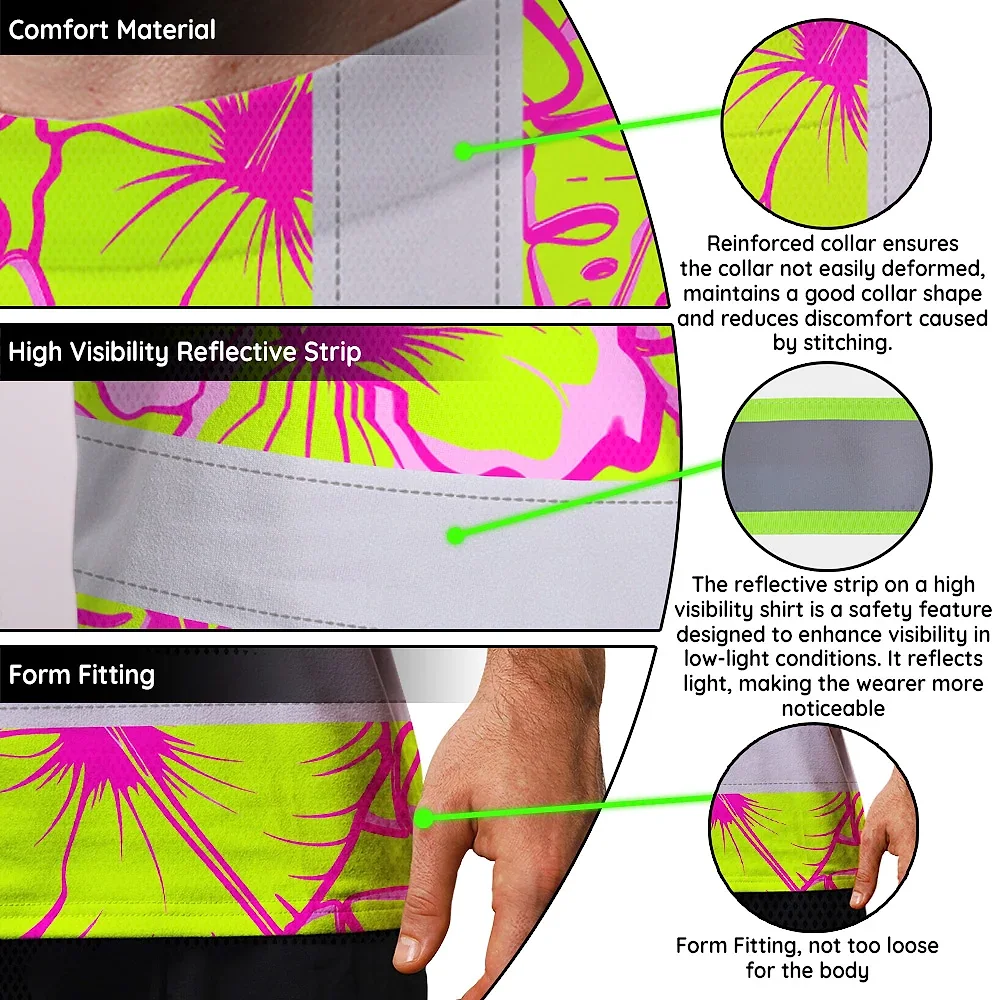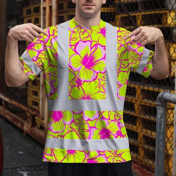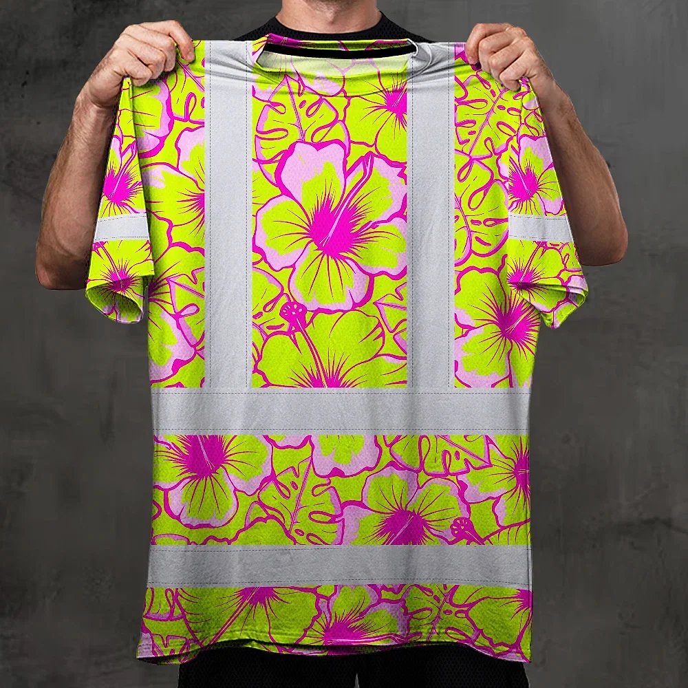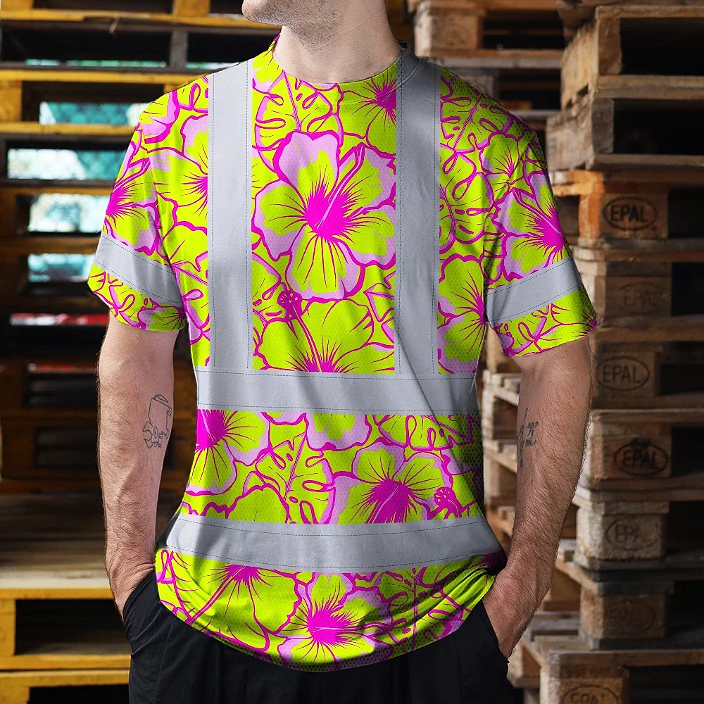 Hi Vis Shirt Reflective Tapes Pink Neon And Lime Flowers Custom Name Safety Workwear For Workers, Truckers, Operators