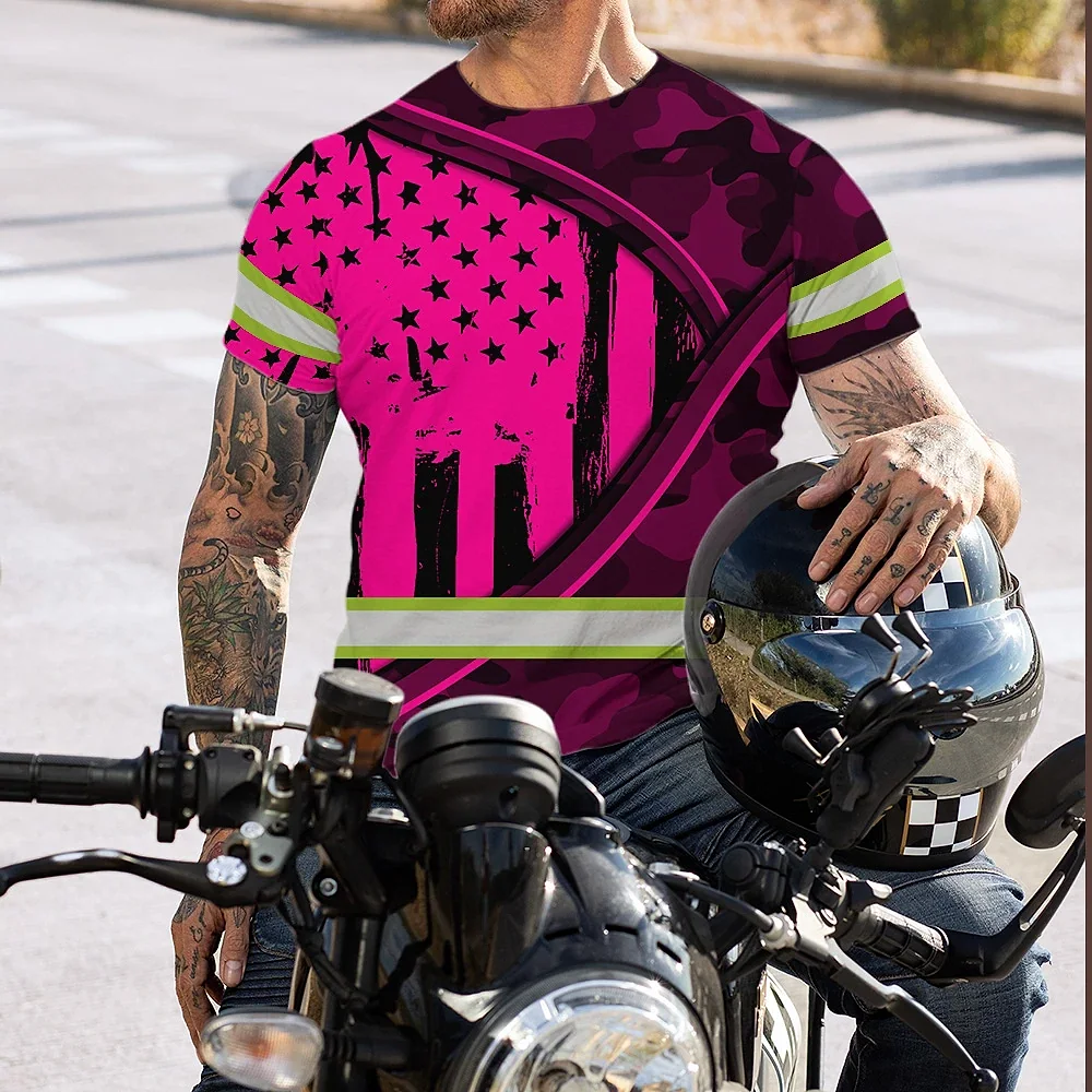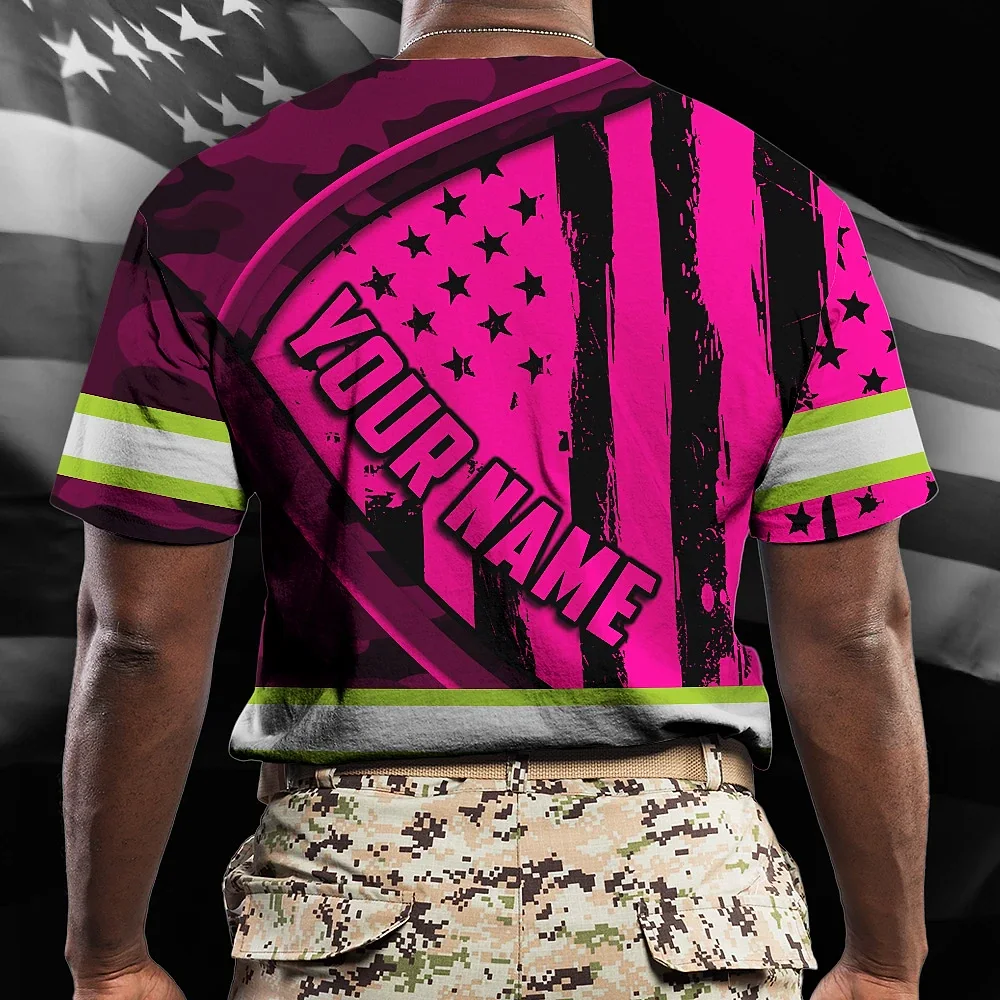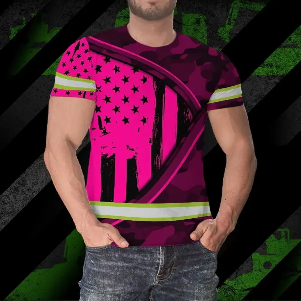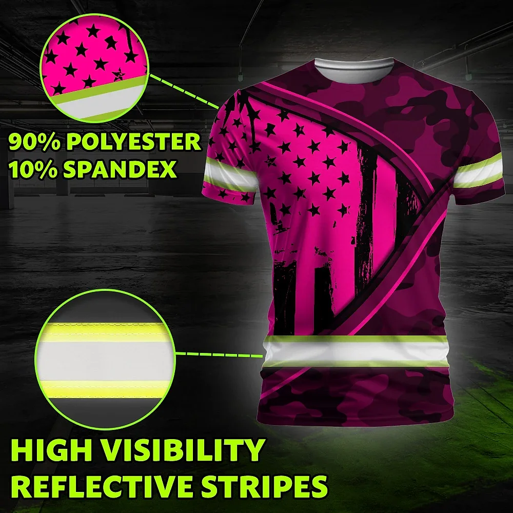 Hi Vis Shirt Reflective Tapes Pink Neon US Flag Wave Custom Name Safety Workwear For Workers, Runners, Cyclists