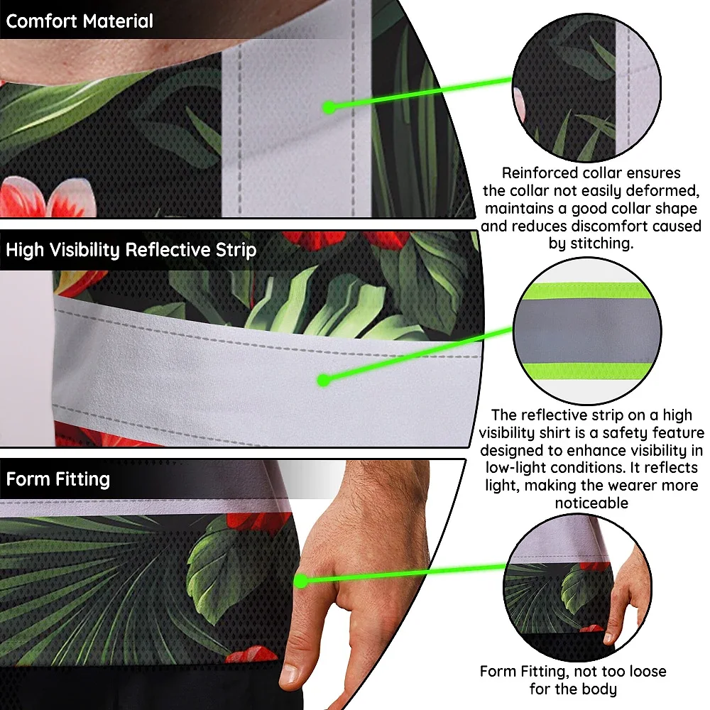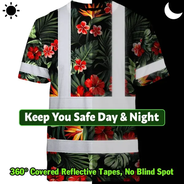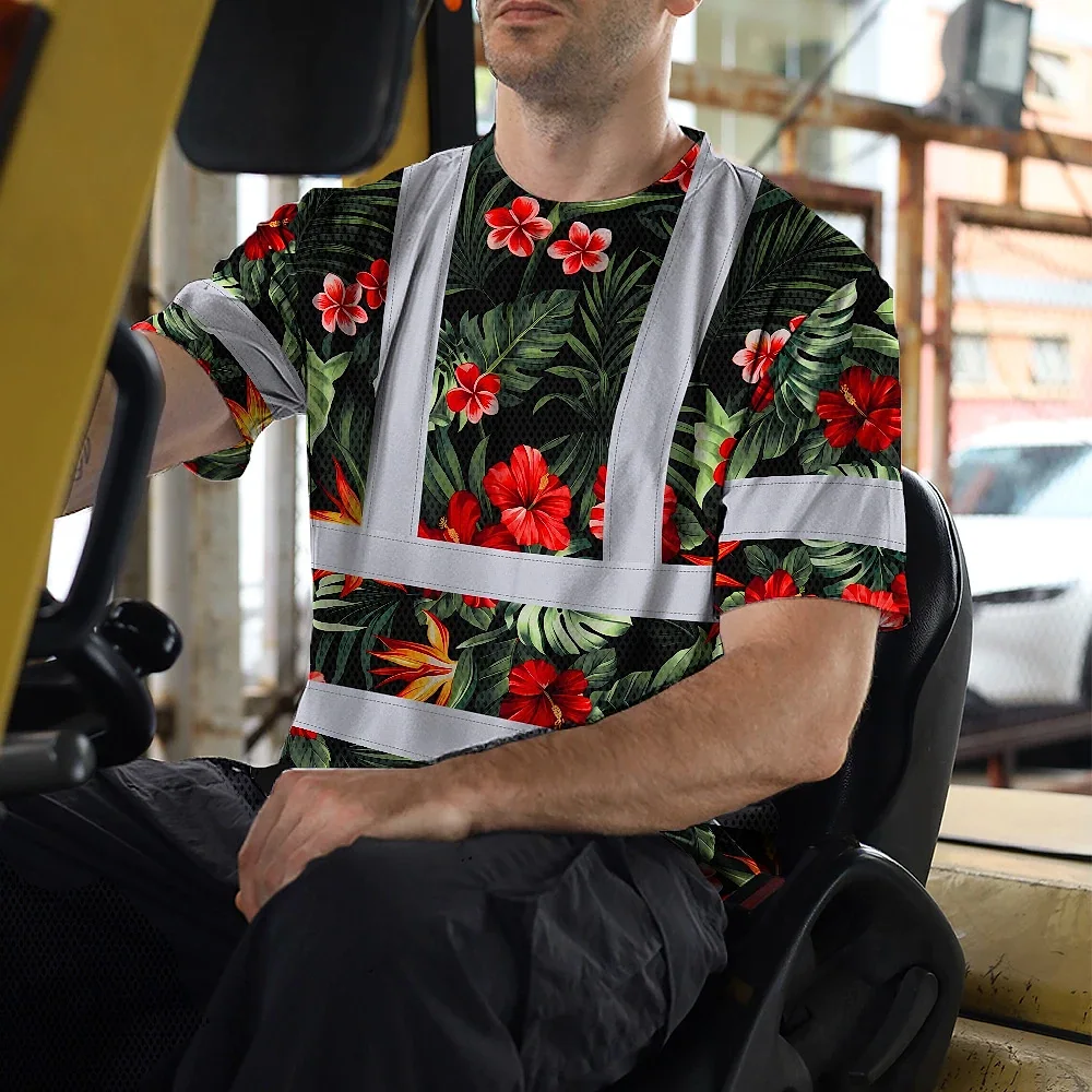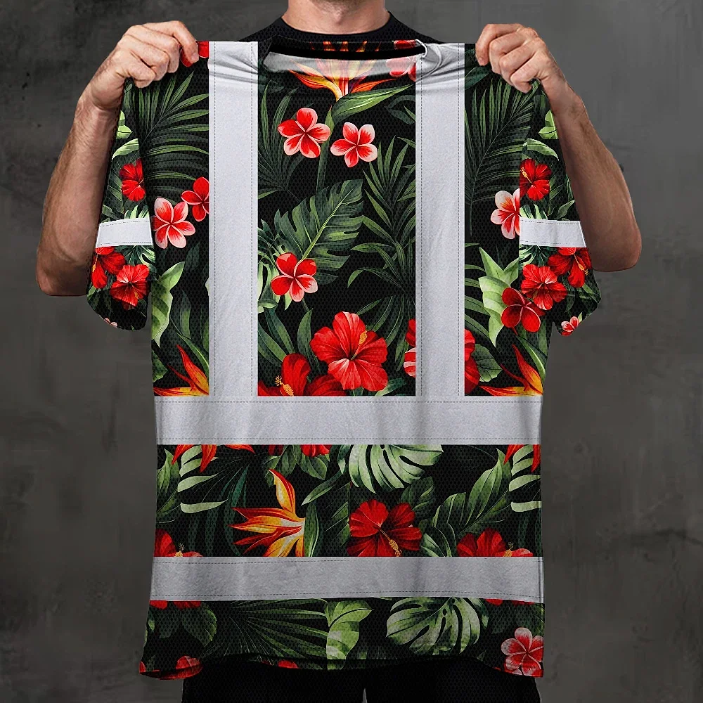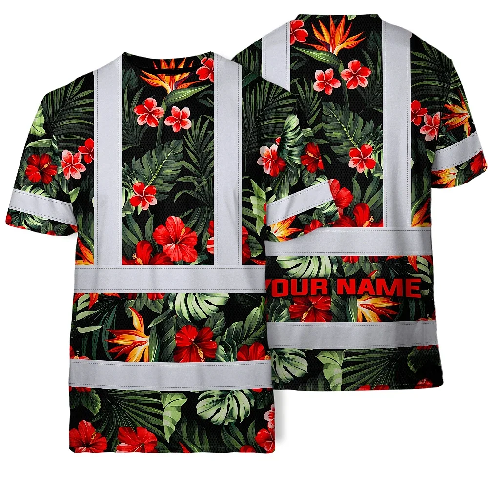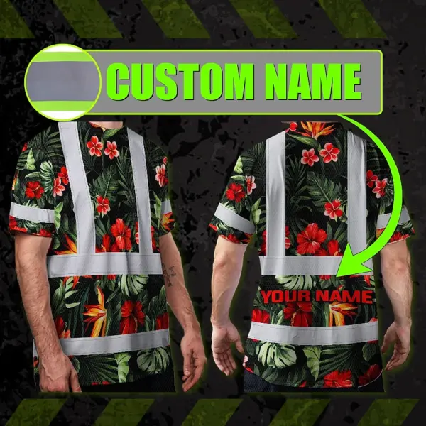 Hi Vis Shirt Reflective Tapes Red Neon Flowers Custom Name Safety Workwear For Workers, Truckers, Operators