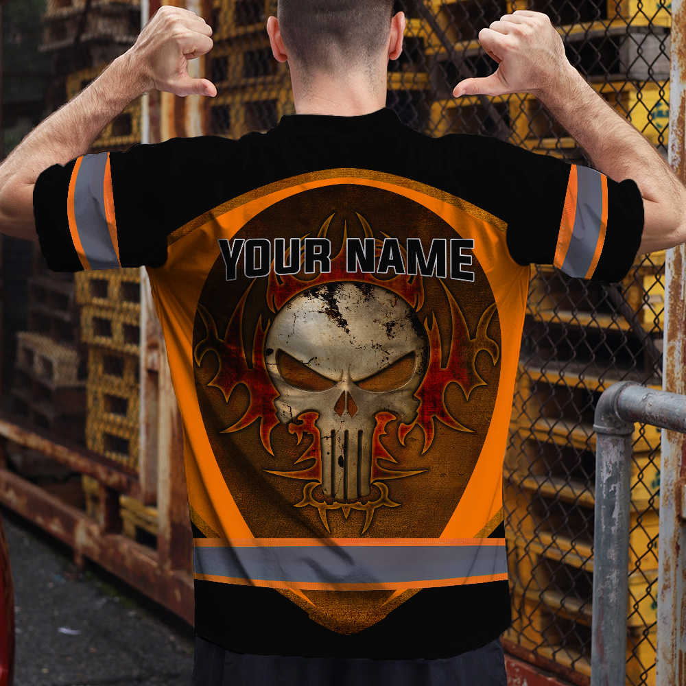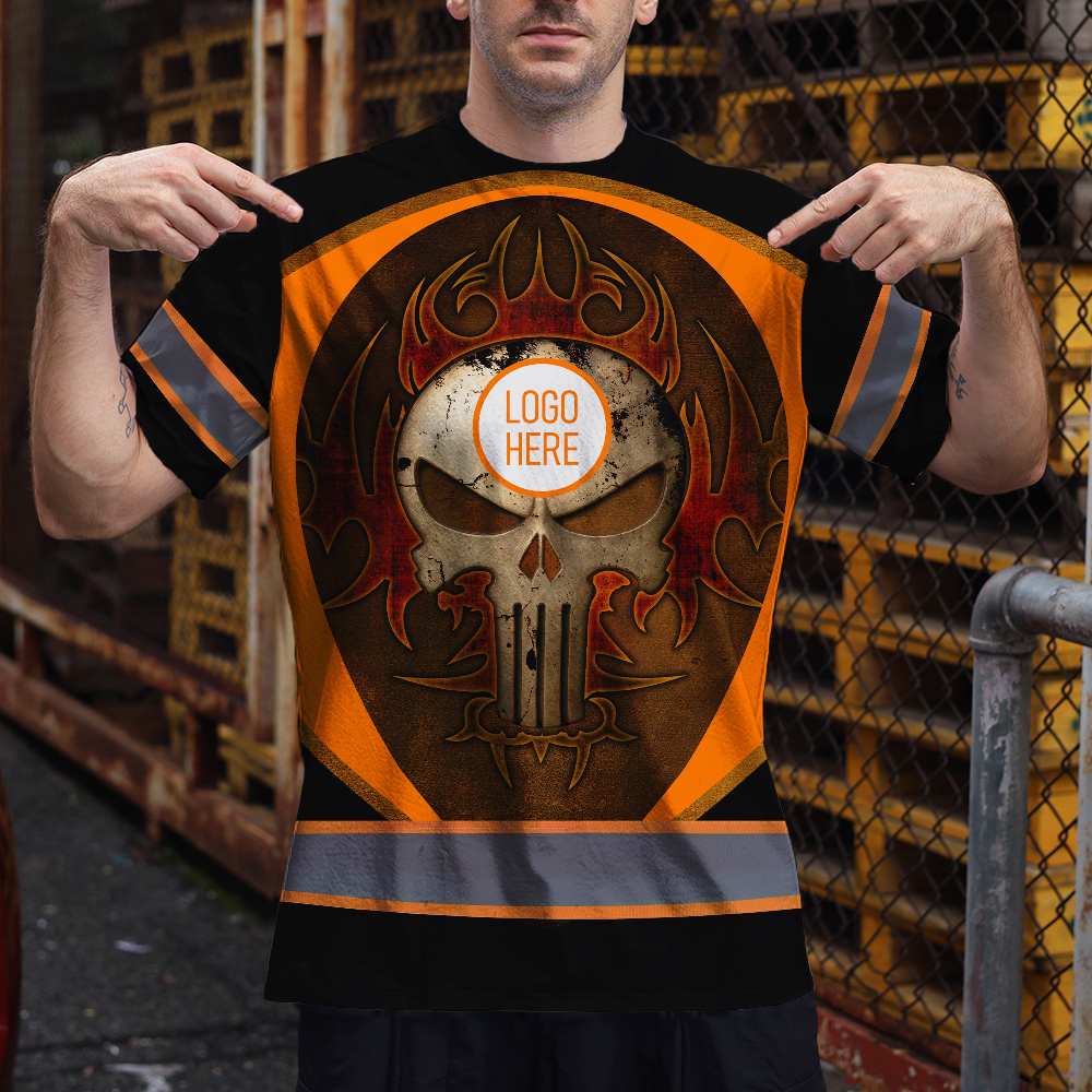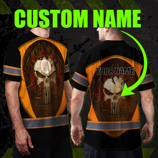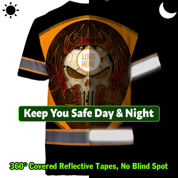 • Hi Vis Shirt Reflective Tapes Uniform Black Orange Neon Skull Custom Name And Logo Safety Workwear For Workers, Teams, Group, Company