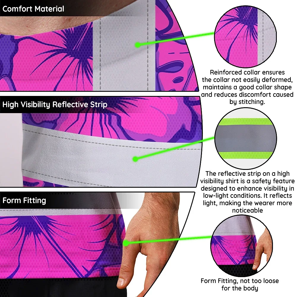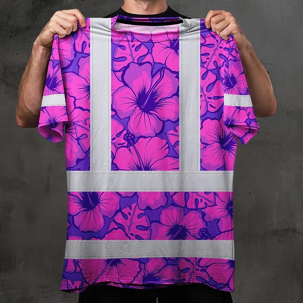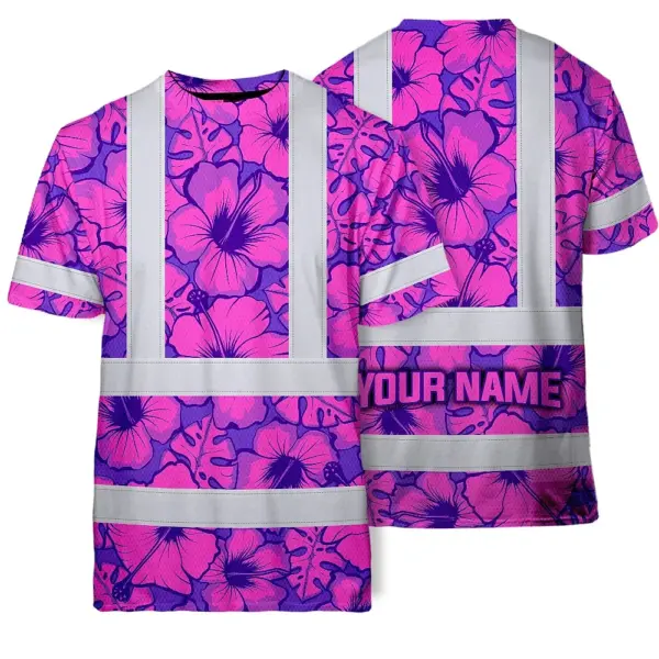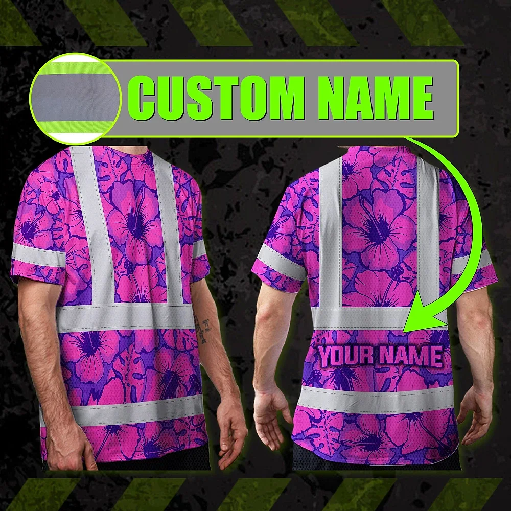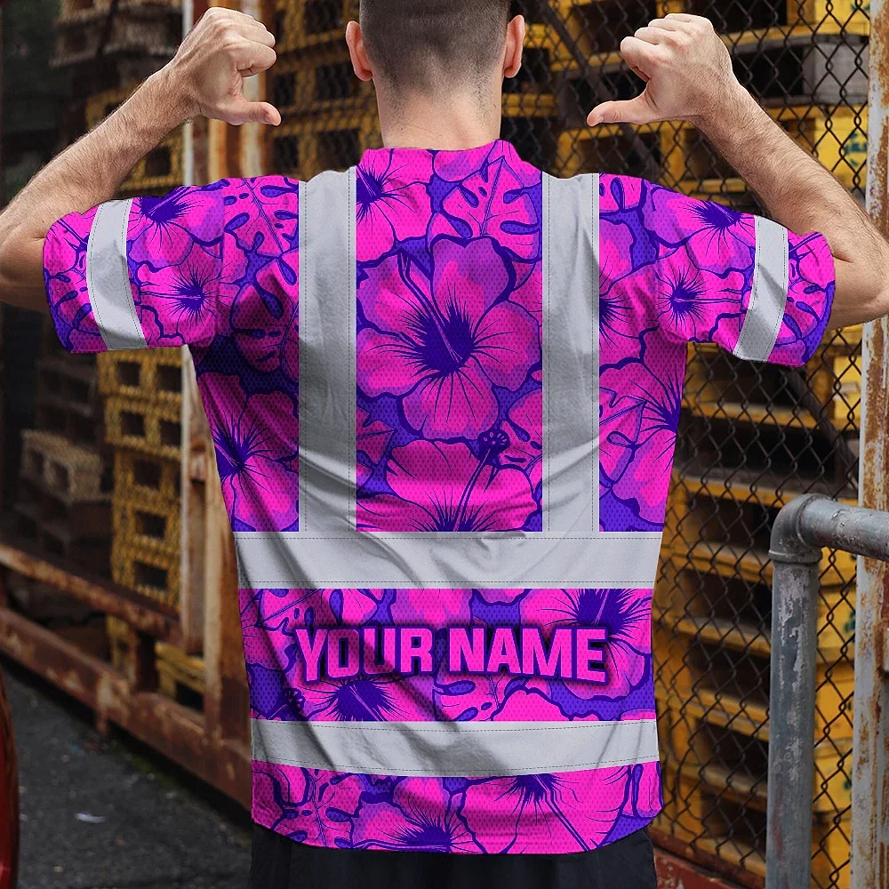Hi Vis Shirt Reflective Tapes Violet Neon And Pink Flowers Custom Name Safety Workwear For Workers, Truckers, Operators