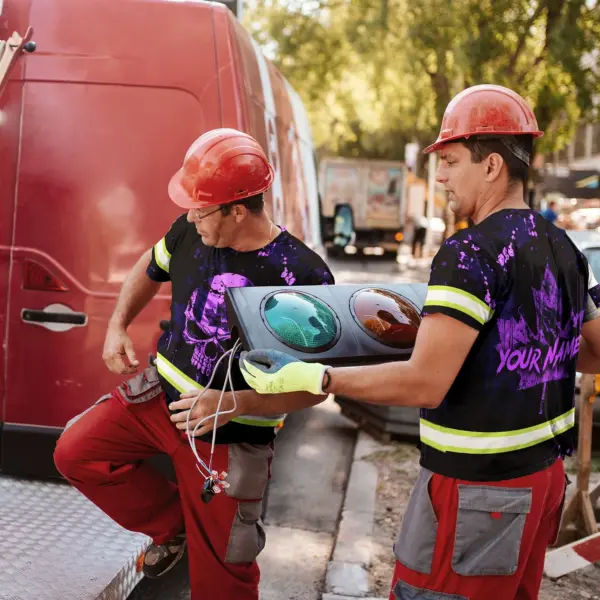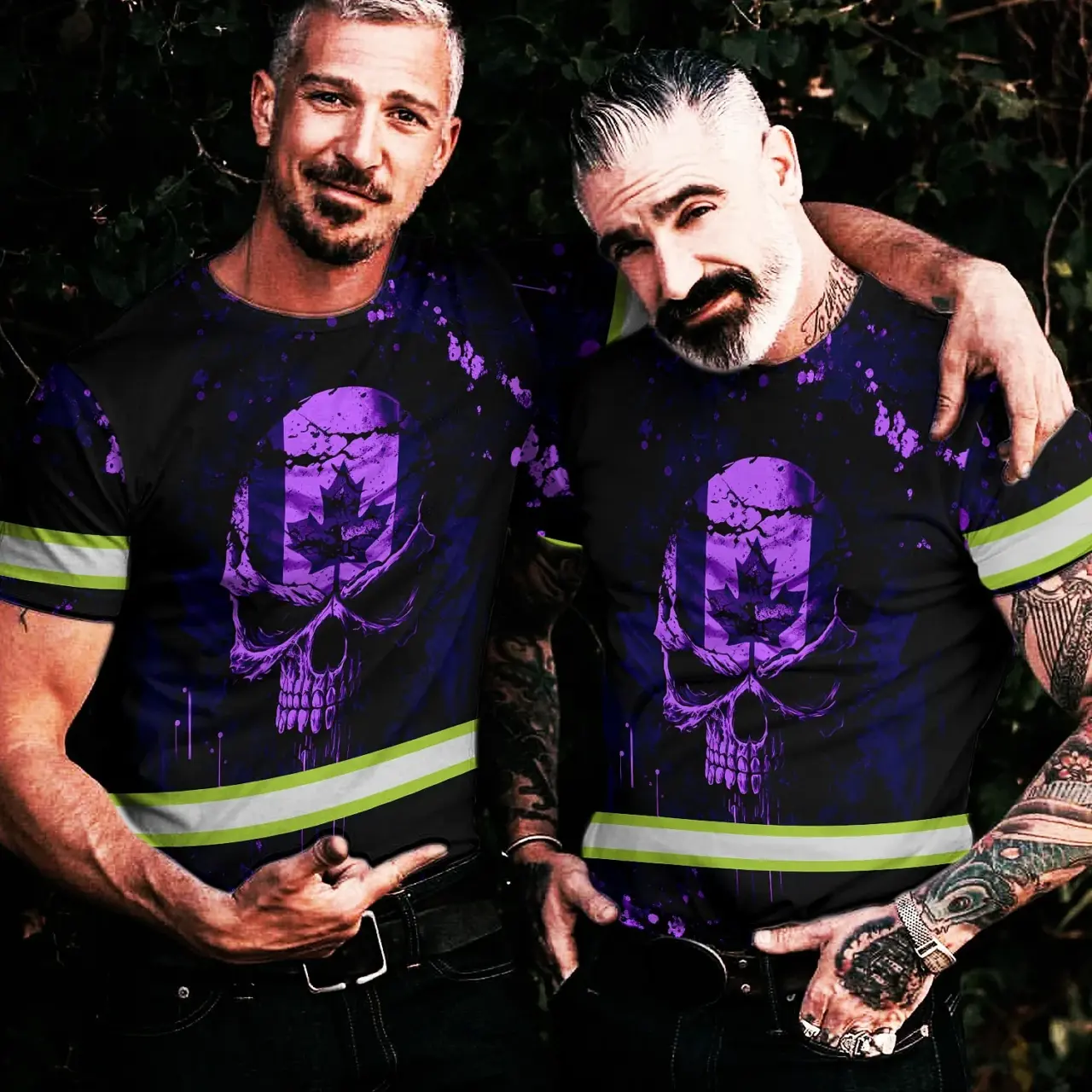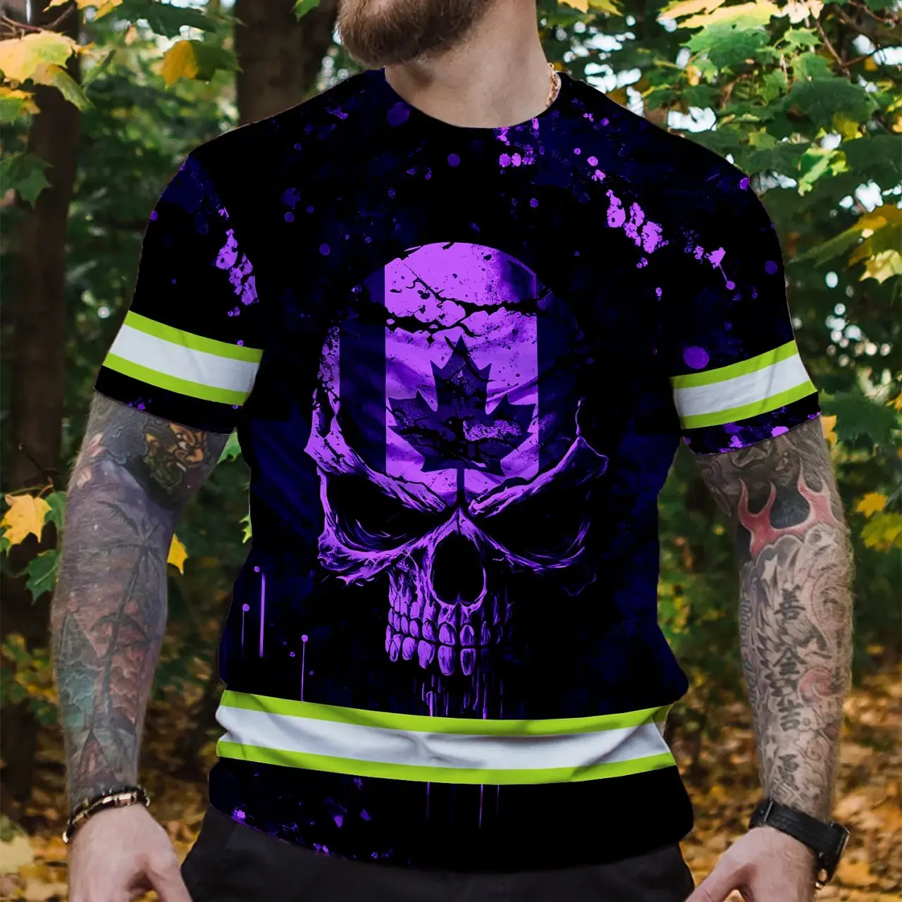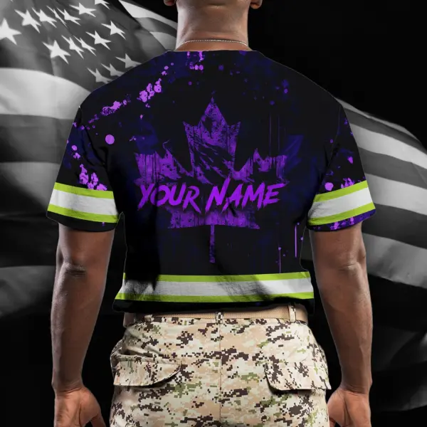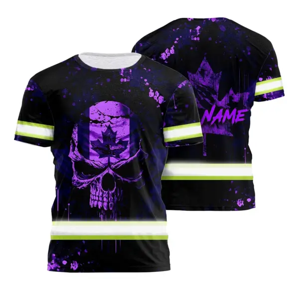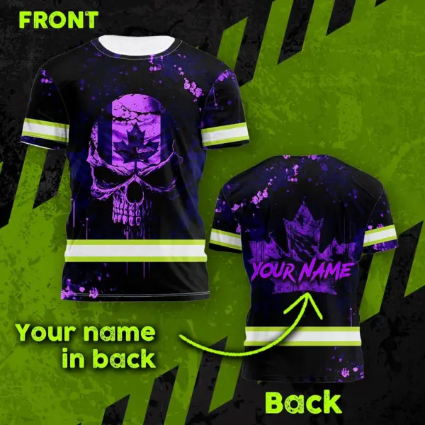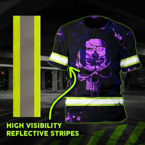Hi Vis Shirt Reflective Tapes Violet Neon Skull With Canada Flag Custom Name Safety Workwear For Worker, Operator, Patriotic