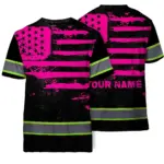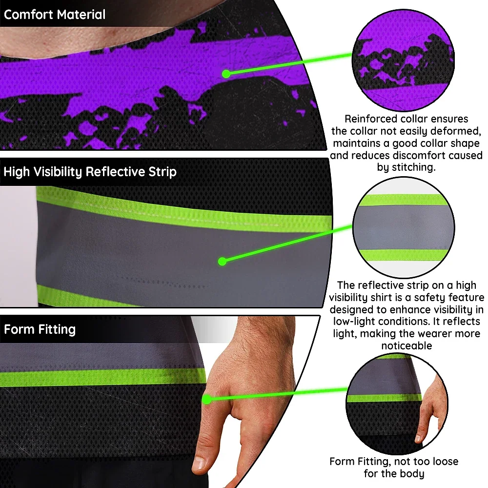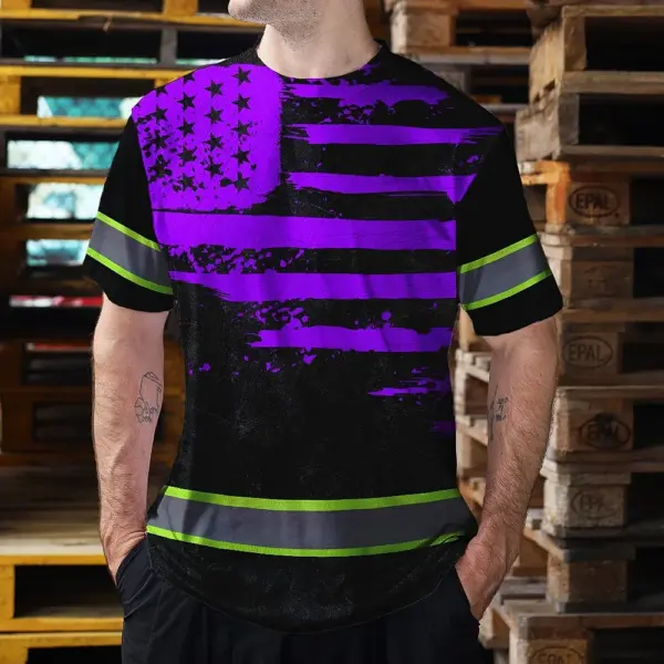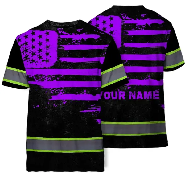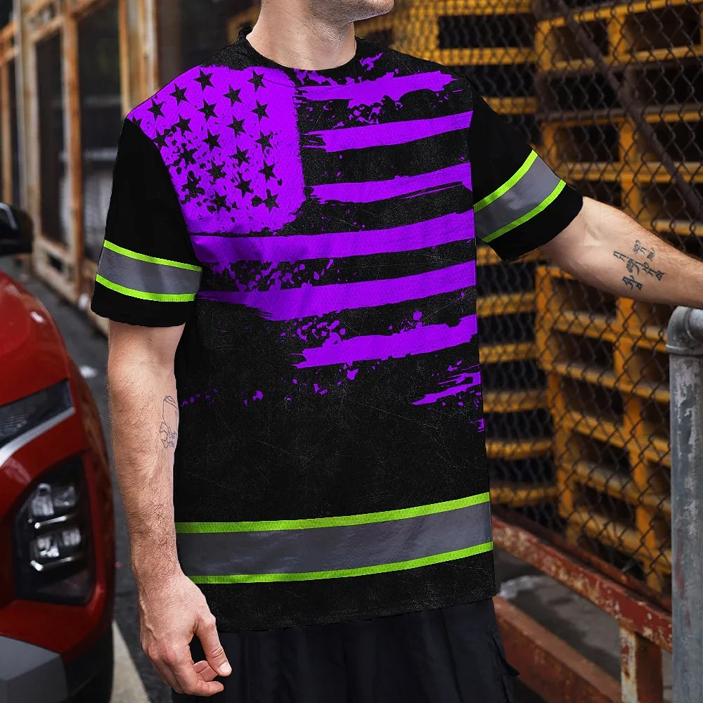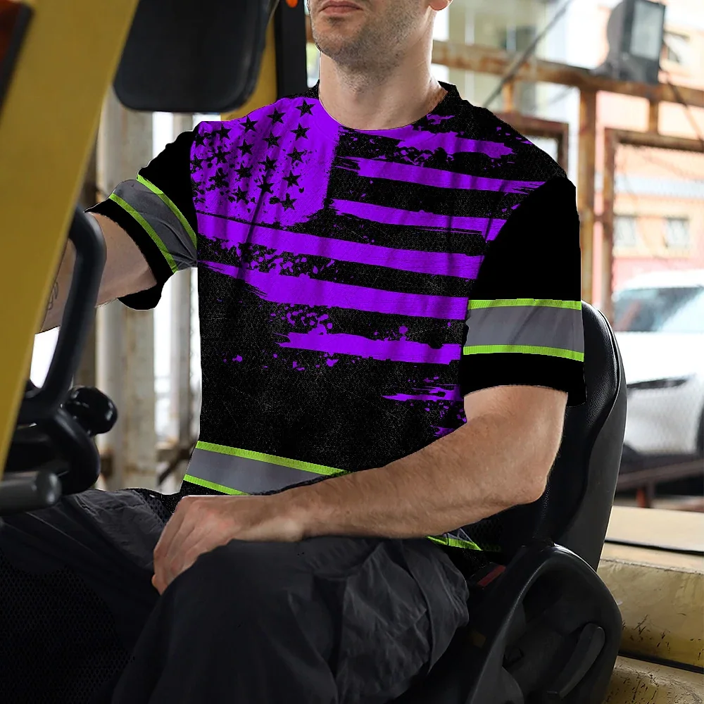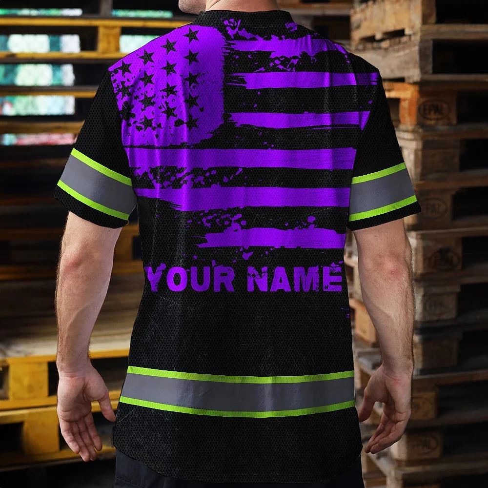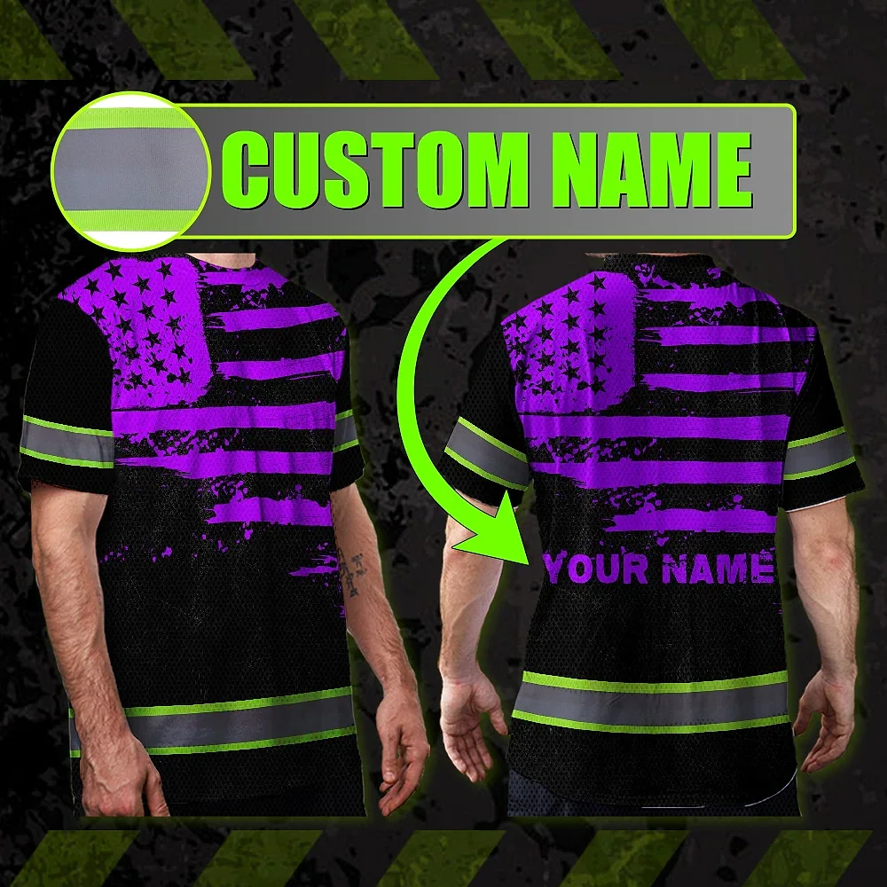 Hi Vis Shirt Reflective Tapes Violet Neon US Flag Custom Name Safety Workwear For Workers, Runners, Cyclists