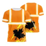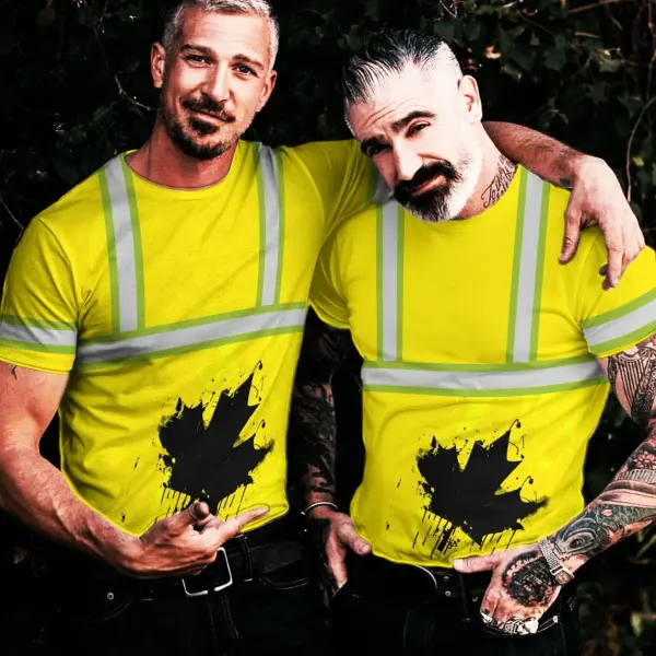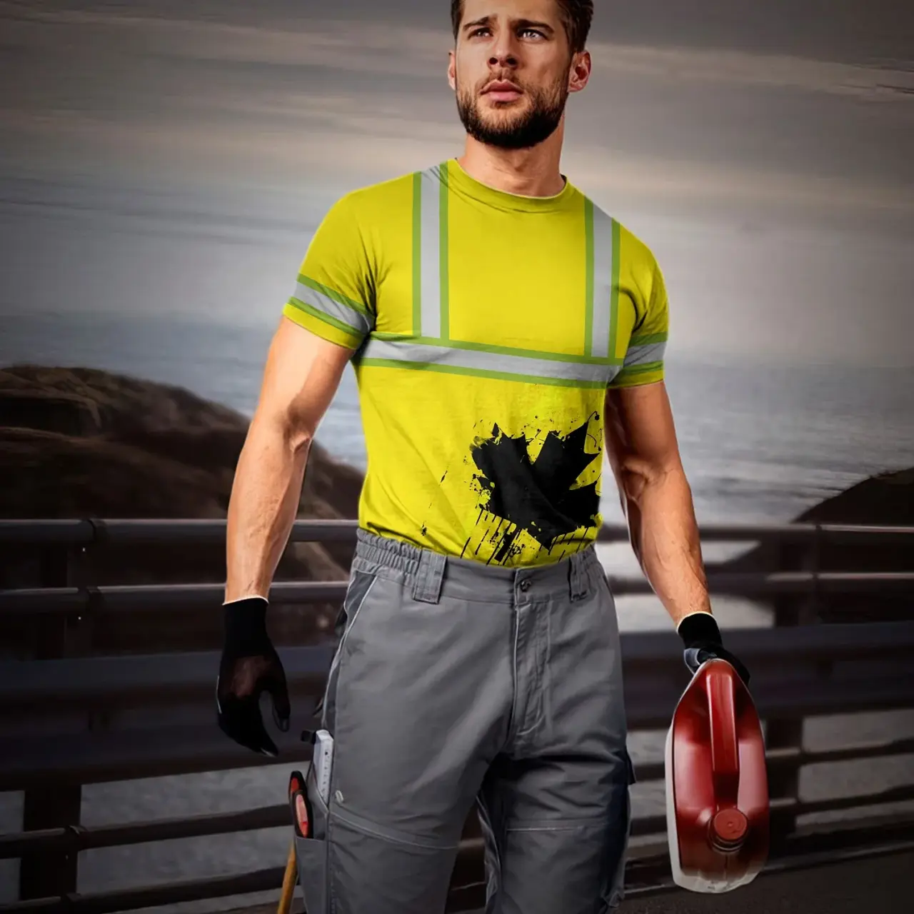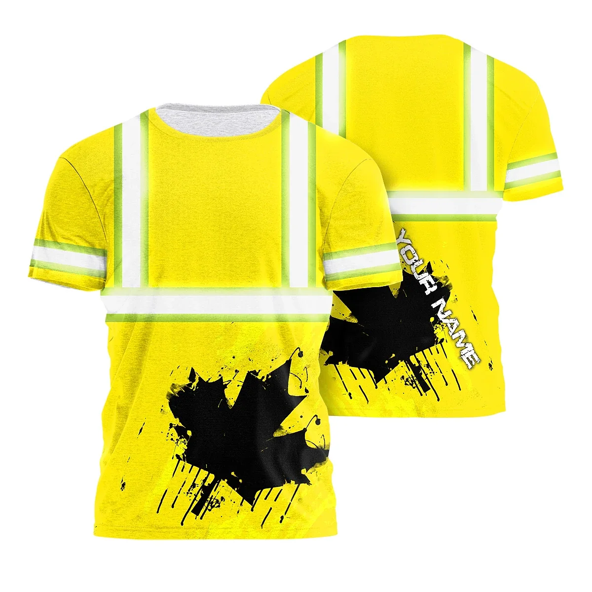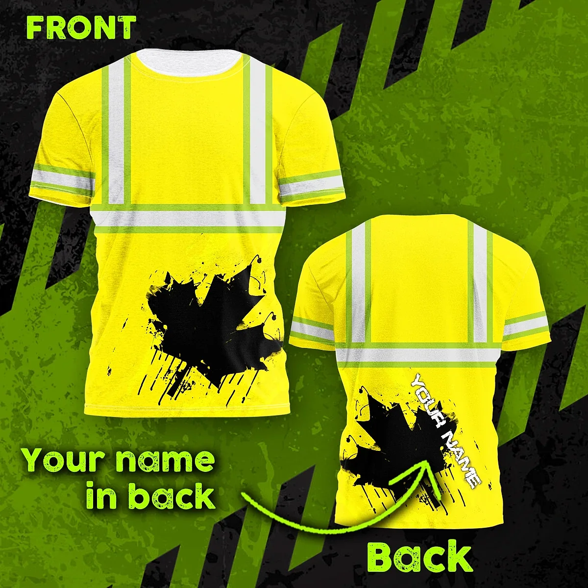 Hi Vis Shirt Reflective Tapes Yellow Neon Canada Flag Custom Name Safety Workwear For Worker, Operator, Patriotic