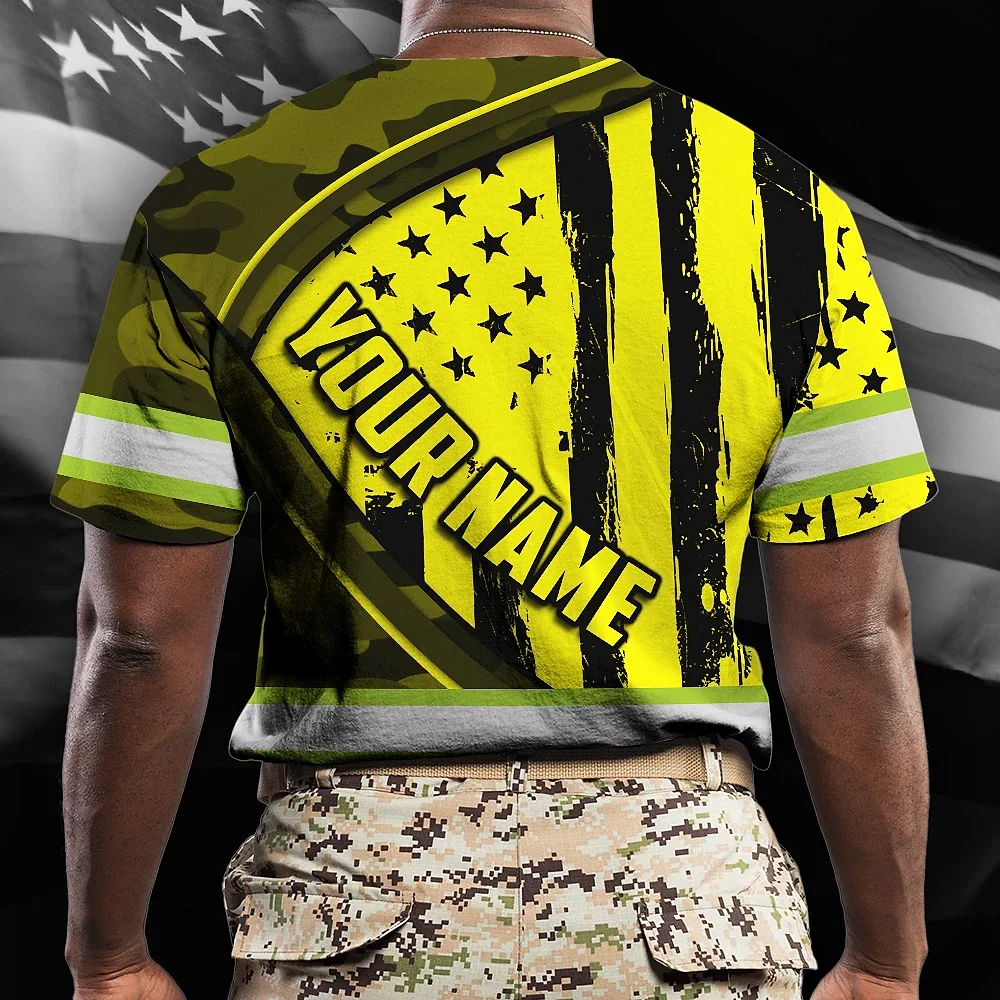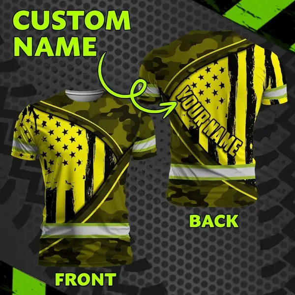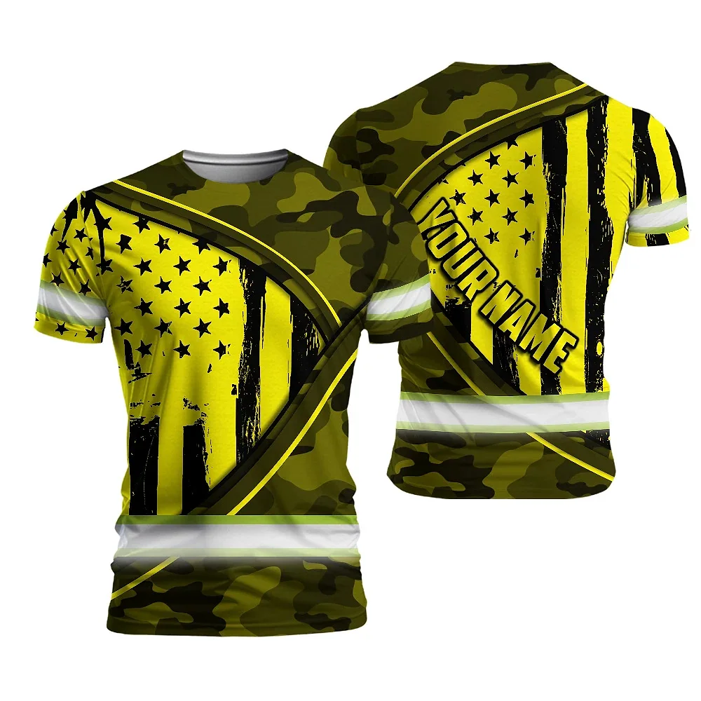 Hi Vis Shirt Reflective Tapes Yellow Neon US Flag Wave Custom Name Safety Workwear For Workers, Runners, Cyclists