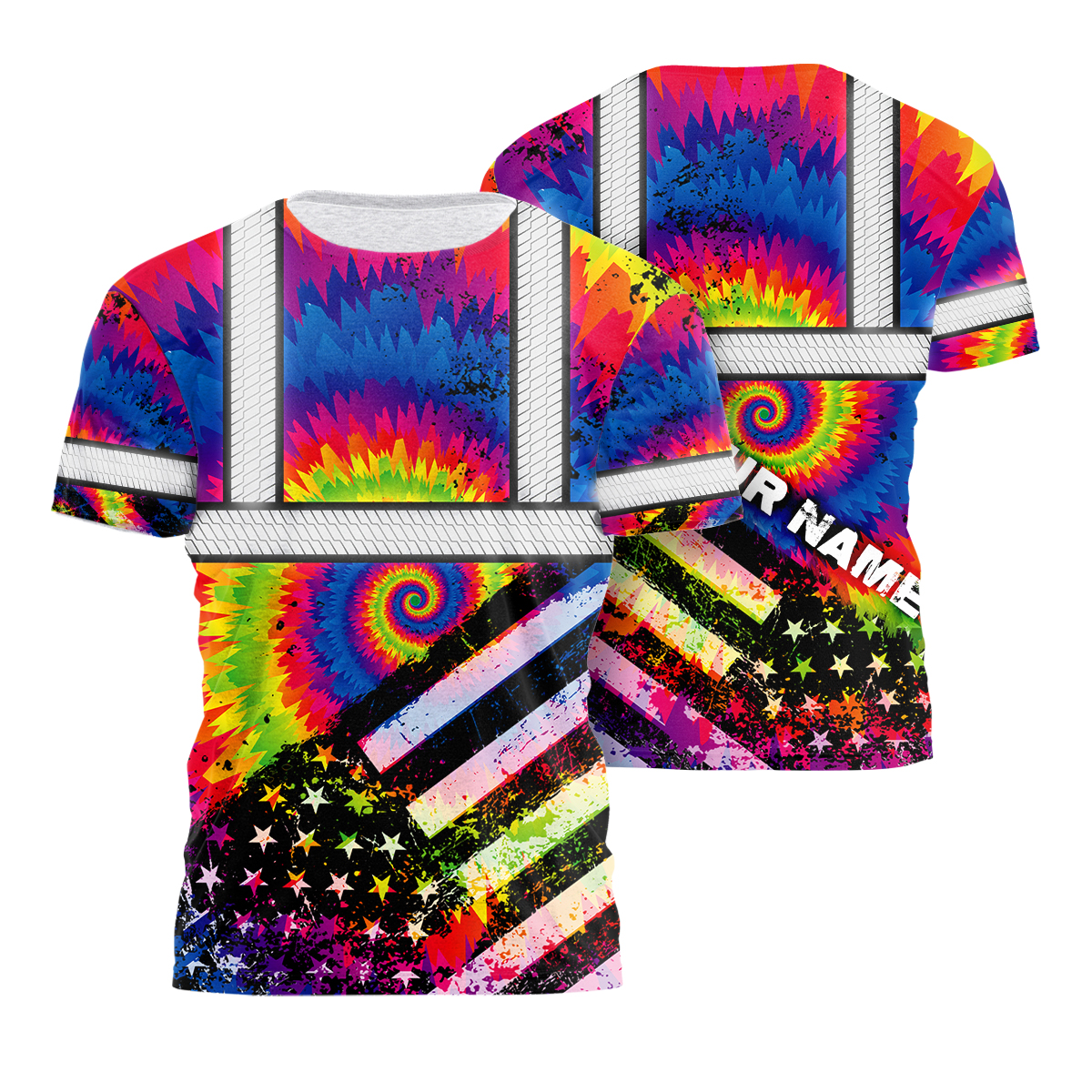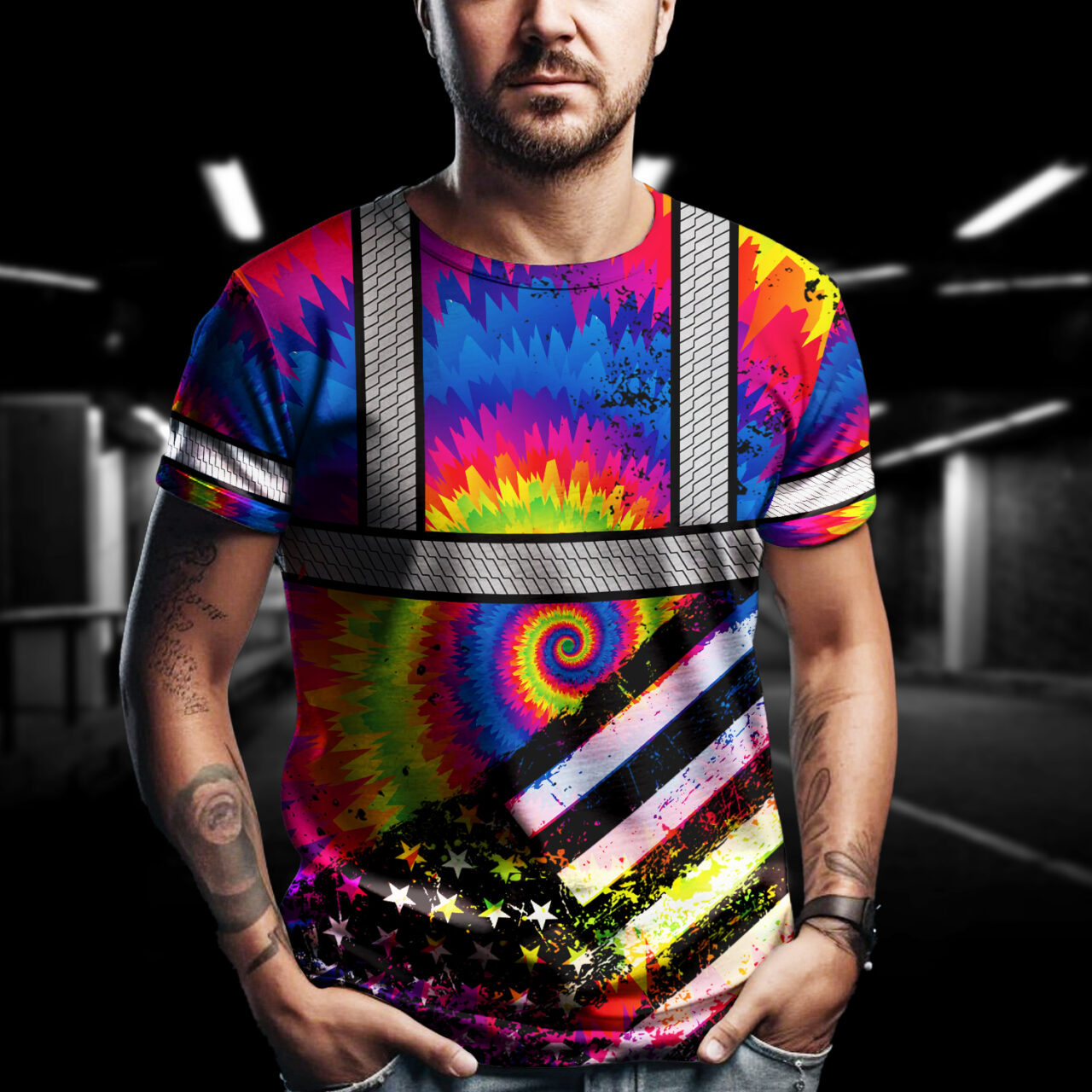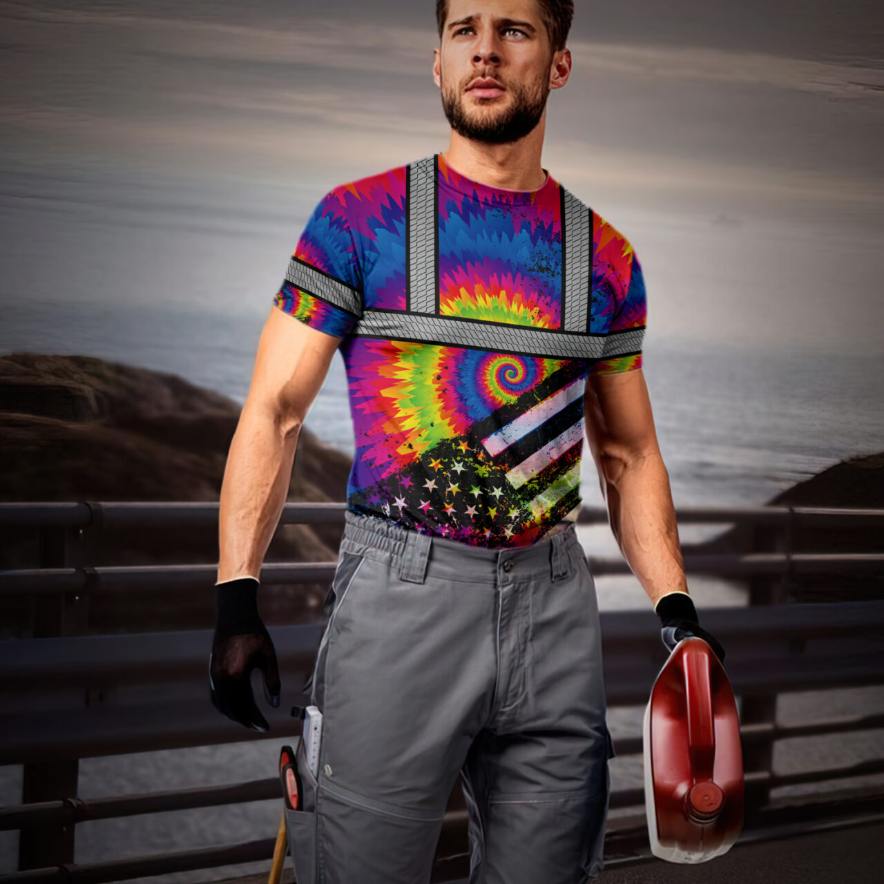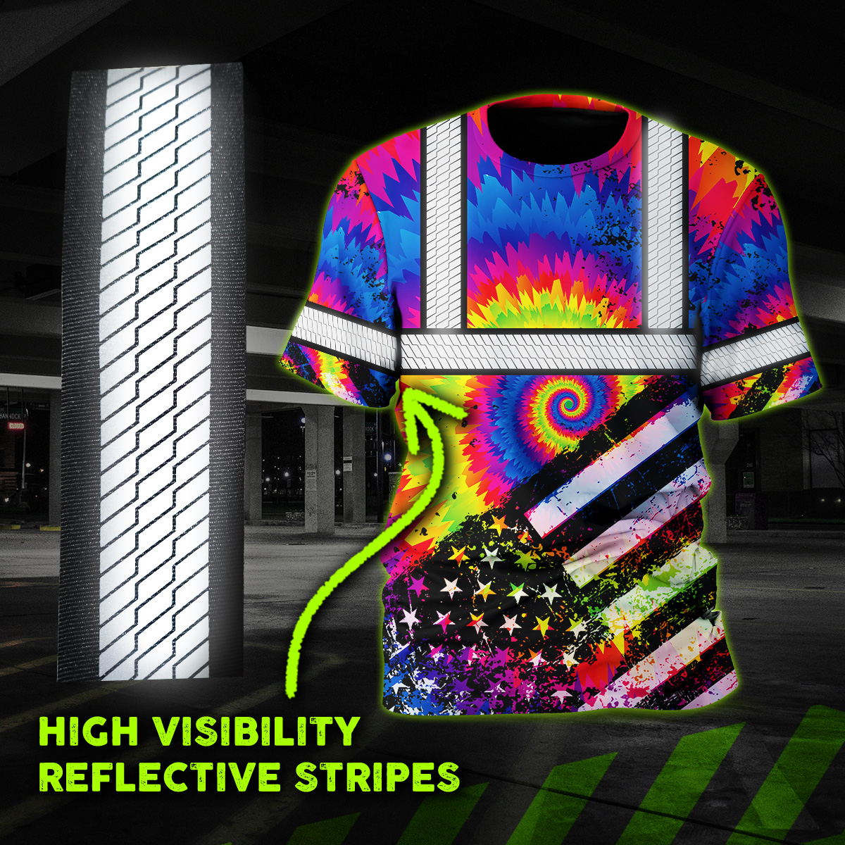 Hi Vis Shirt Reflective Tie Dye 2 US Flag Paint Safety Workwear For Motorcycle Bicycle, Runner