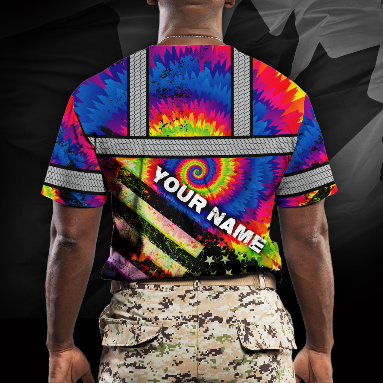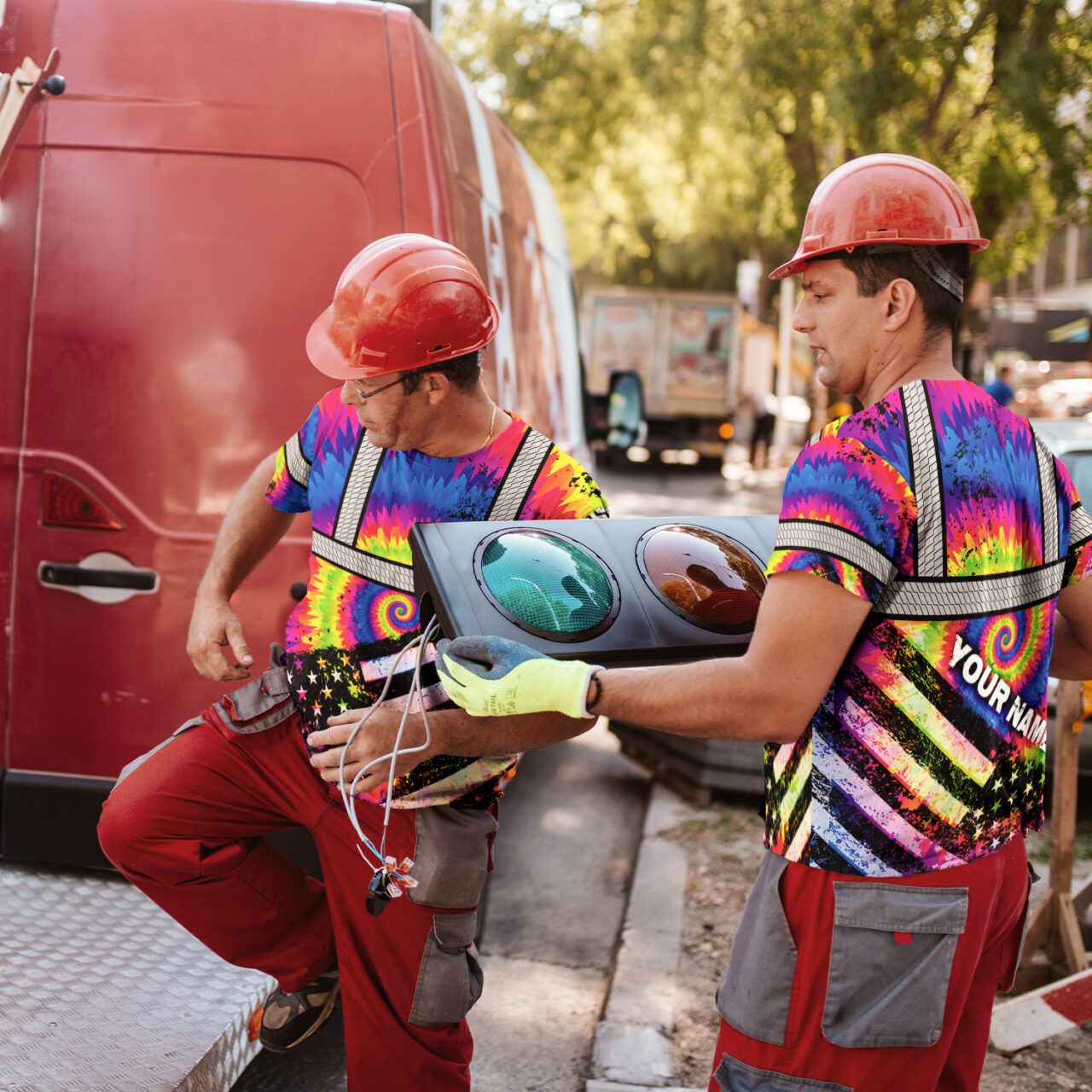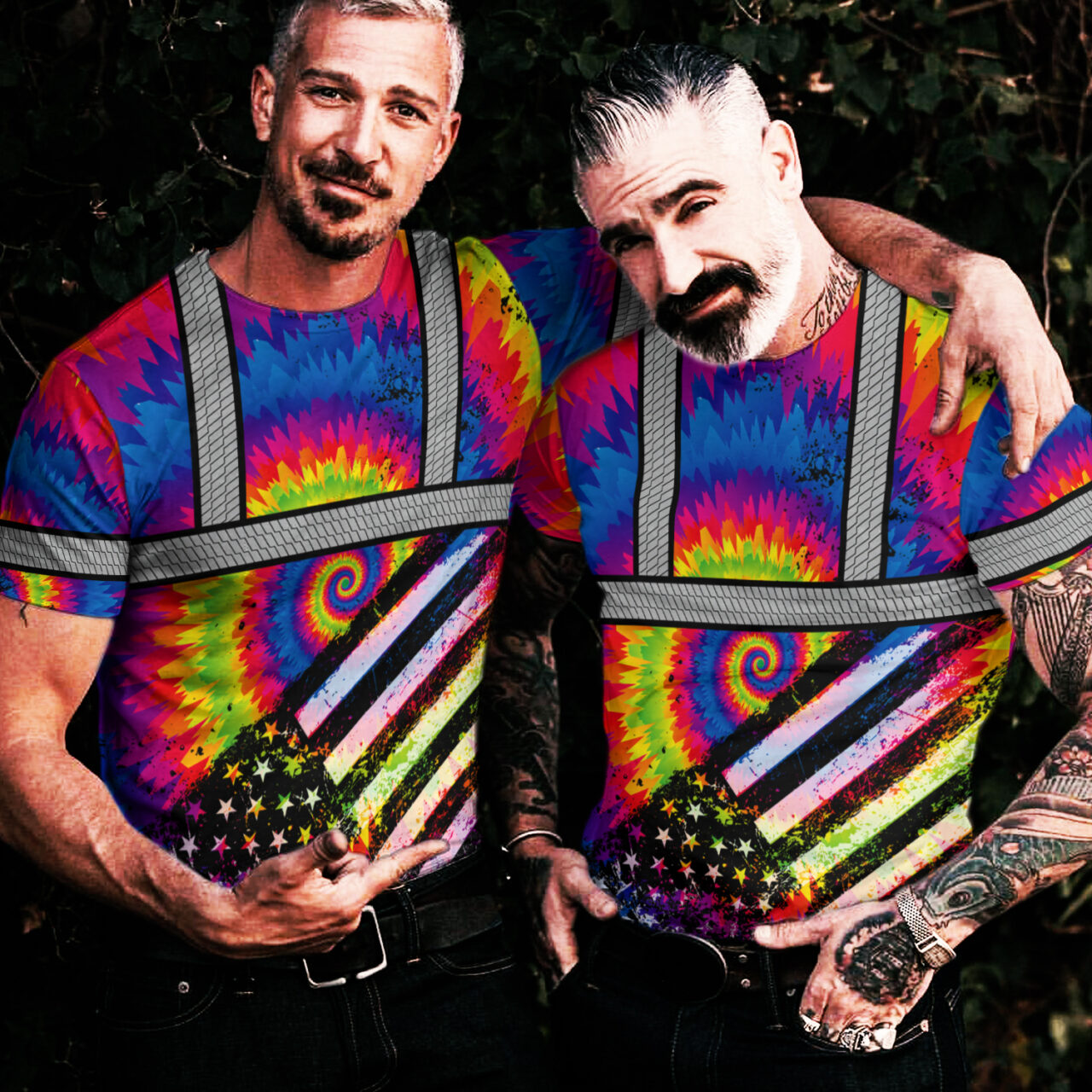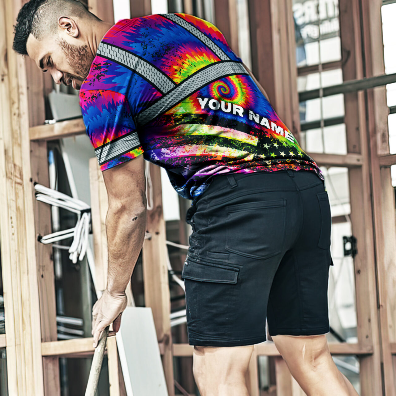 Hi Vis Shirt Reflective Tie Dye 2 US Flag Paint Safety Workwear For Motorcycle Bicycle, Runner