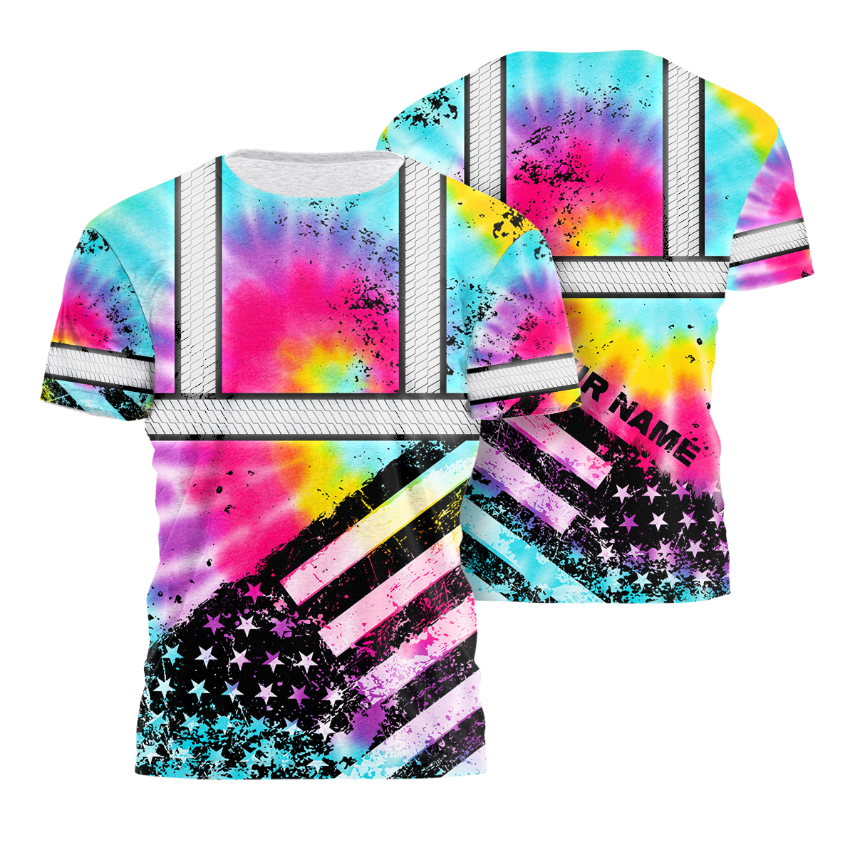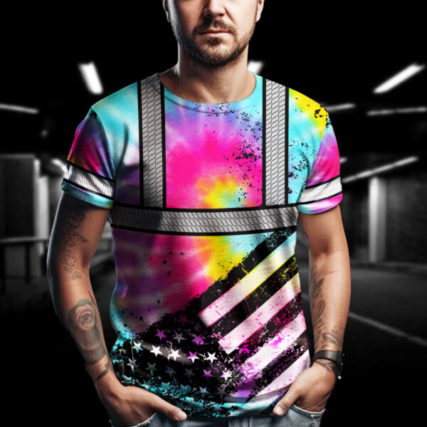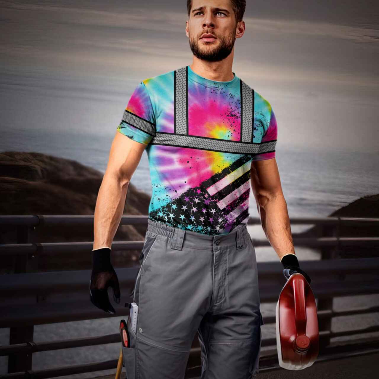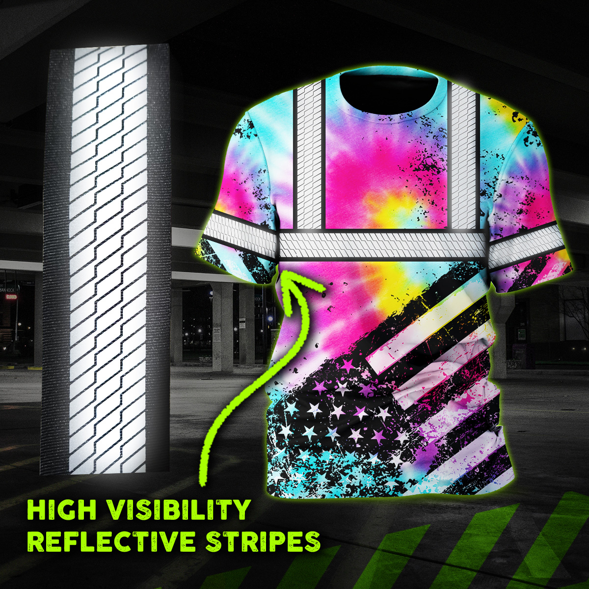 Hi Vis Shirt Reflective Tie Dye US Flag Paint Safety Workwear For Motorcycle Bicycle, Runner, Patriotic