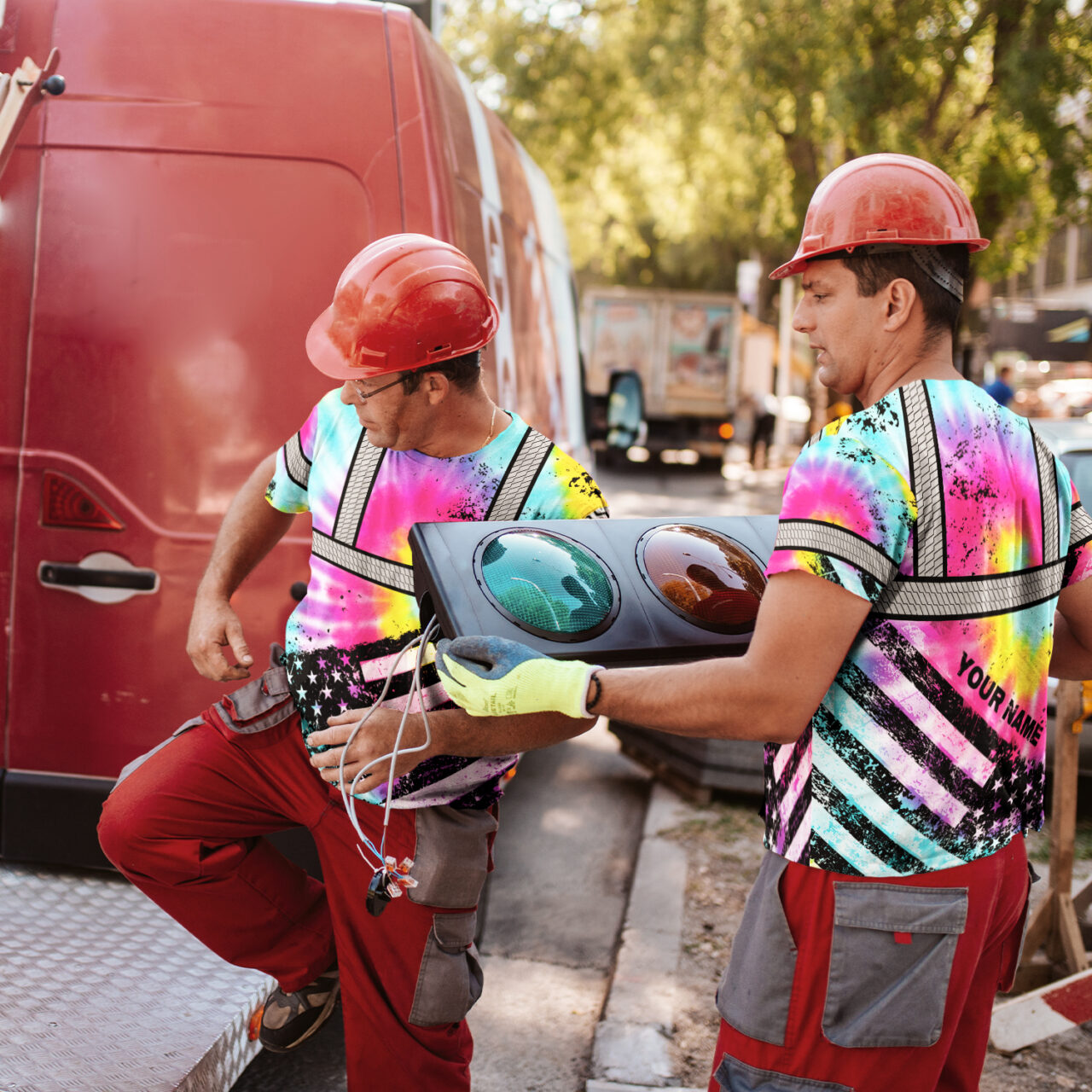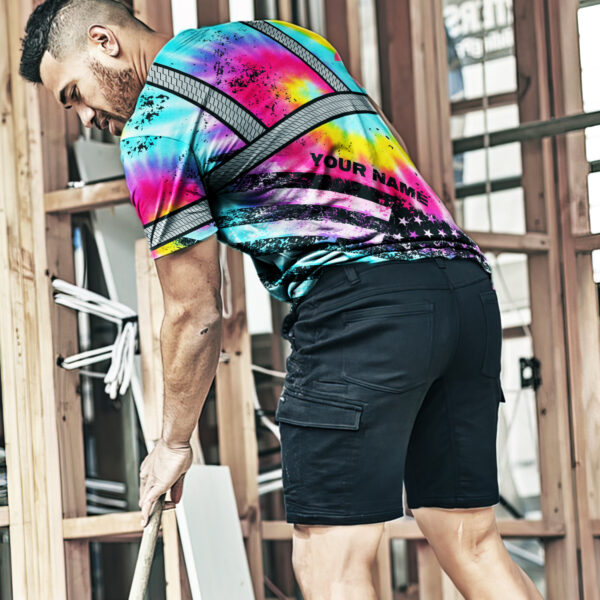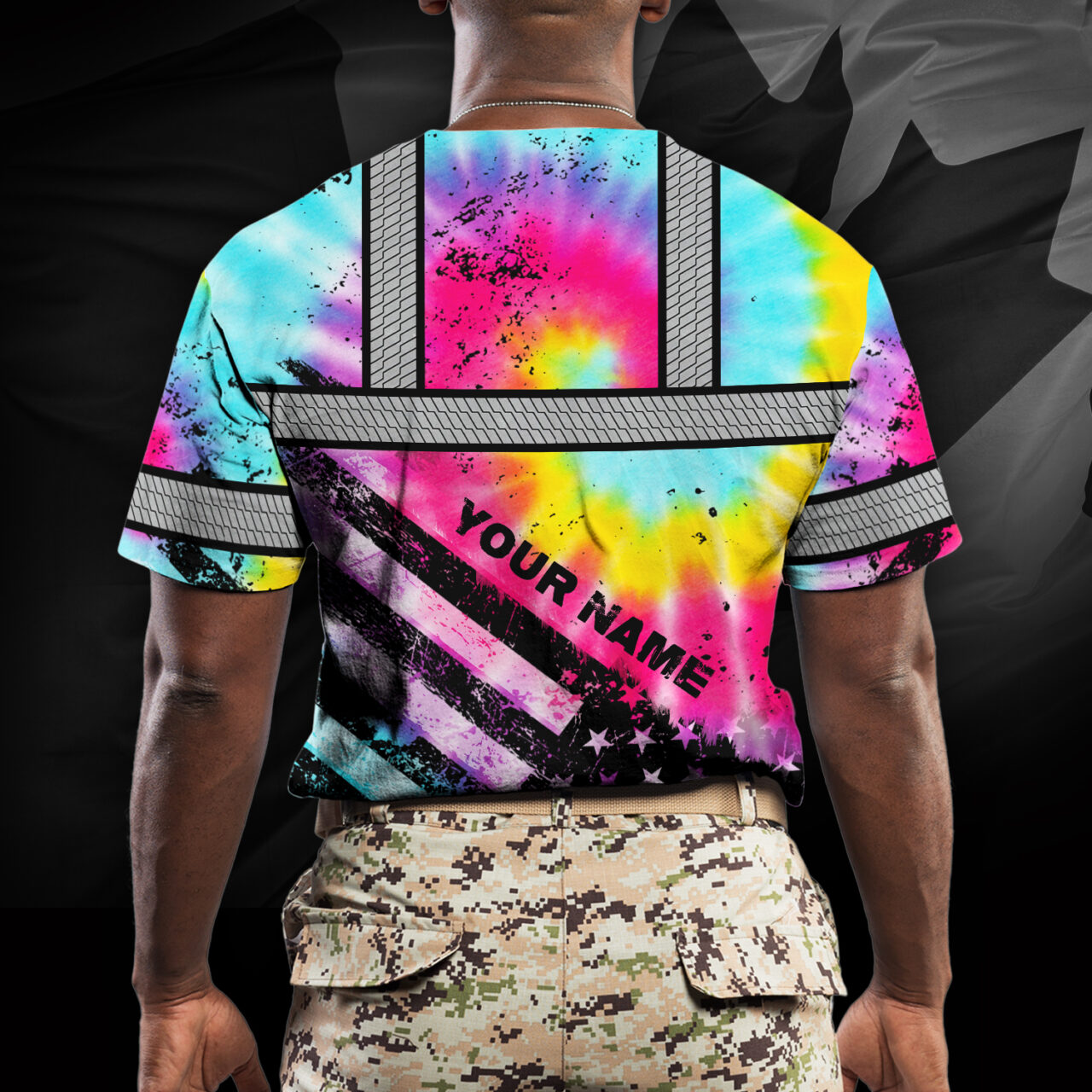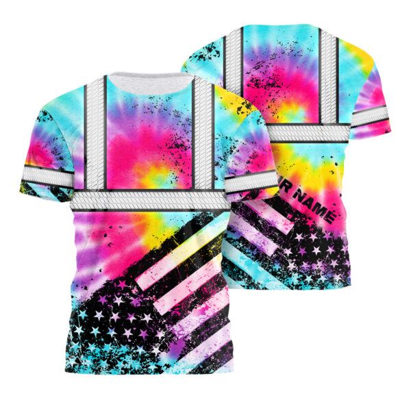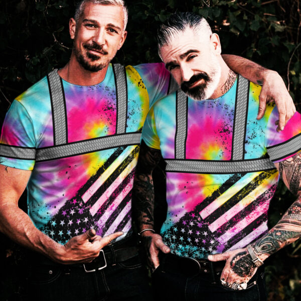Hi Vis Shirt Reflective Tie Dye US Flag Paint Safety Workwear For Motorcycle Bicycle, Runner, Patriotic