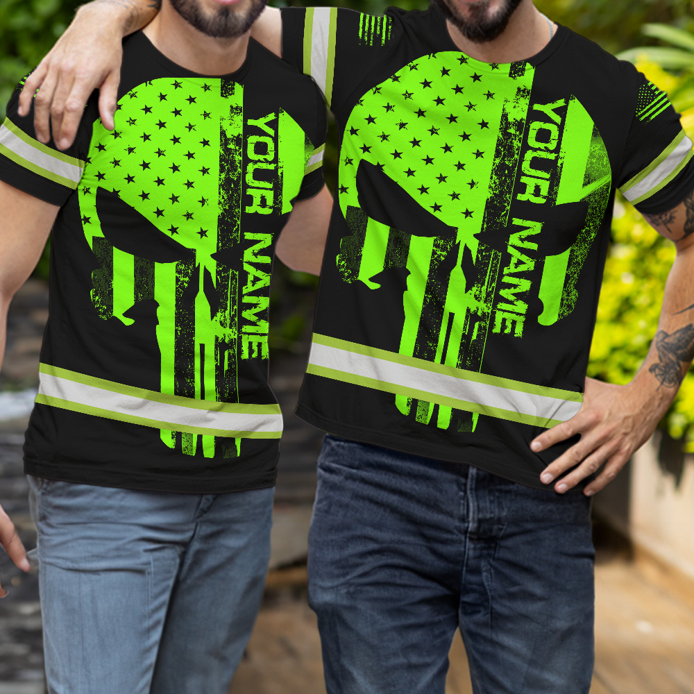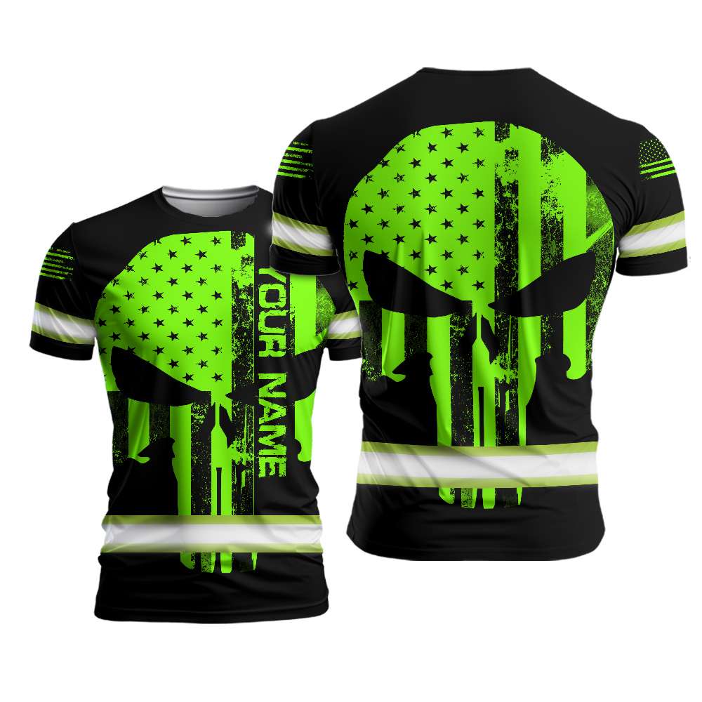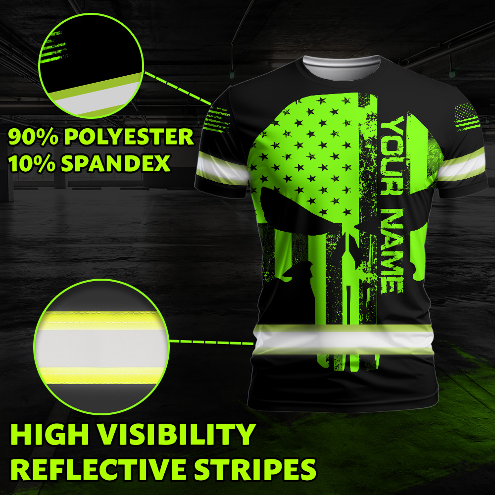Hi Vis Shirt Skull US Flag Neon Purple Reflective Custom Name Safety Workwear For Workers, Skull Lovers