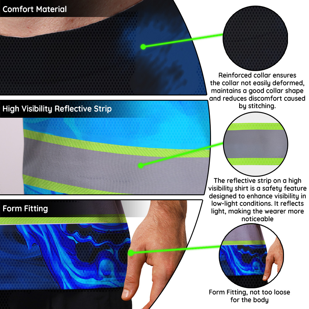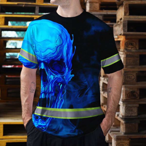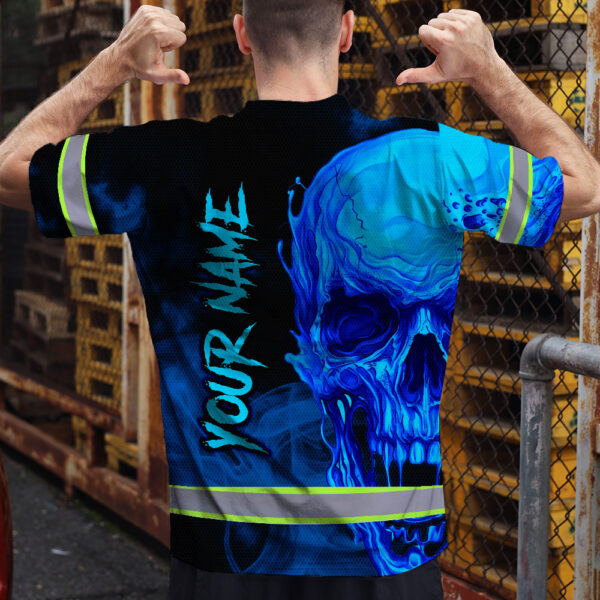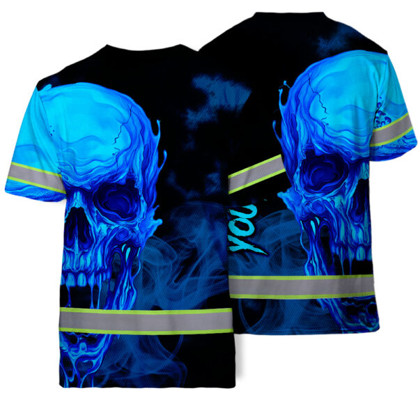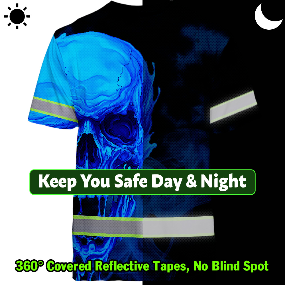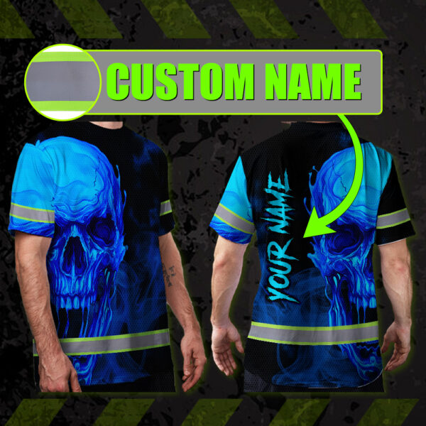 Hi Vis T Shirt Reflective Tapes Black And Blue Skull Custom Name Safety Workwear For Workers, Truckers, Operators