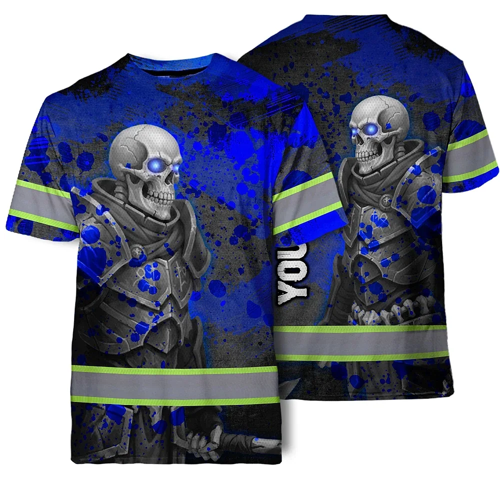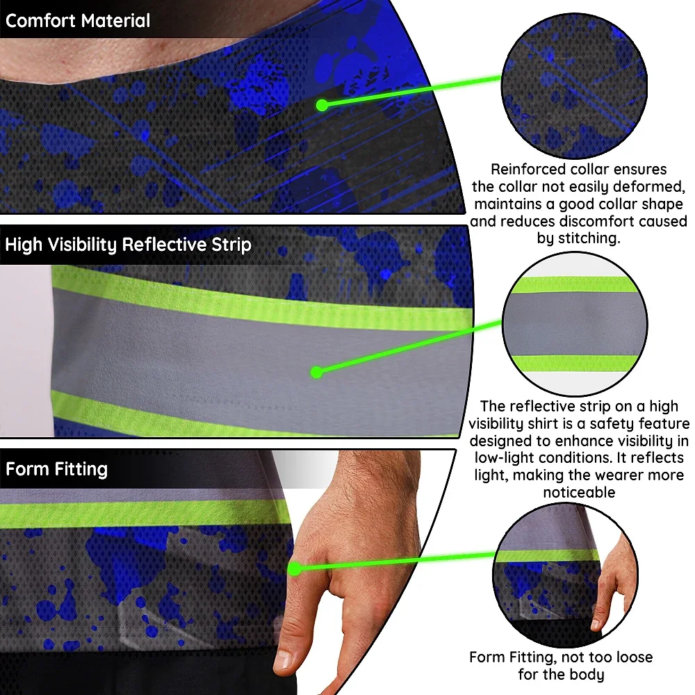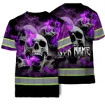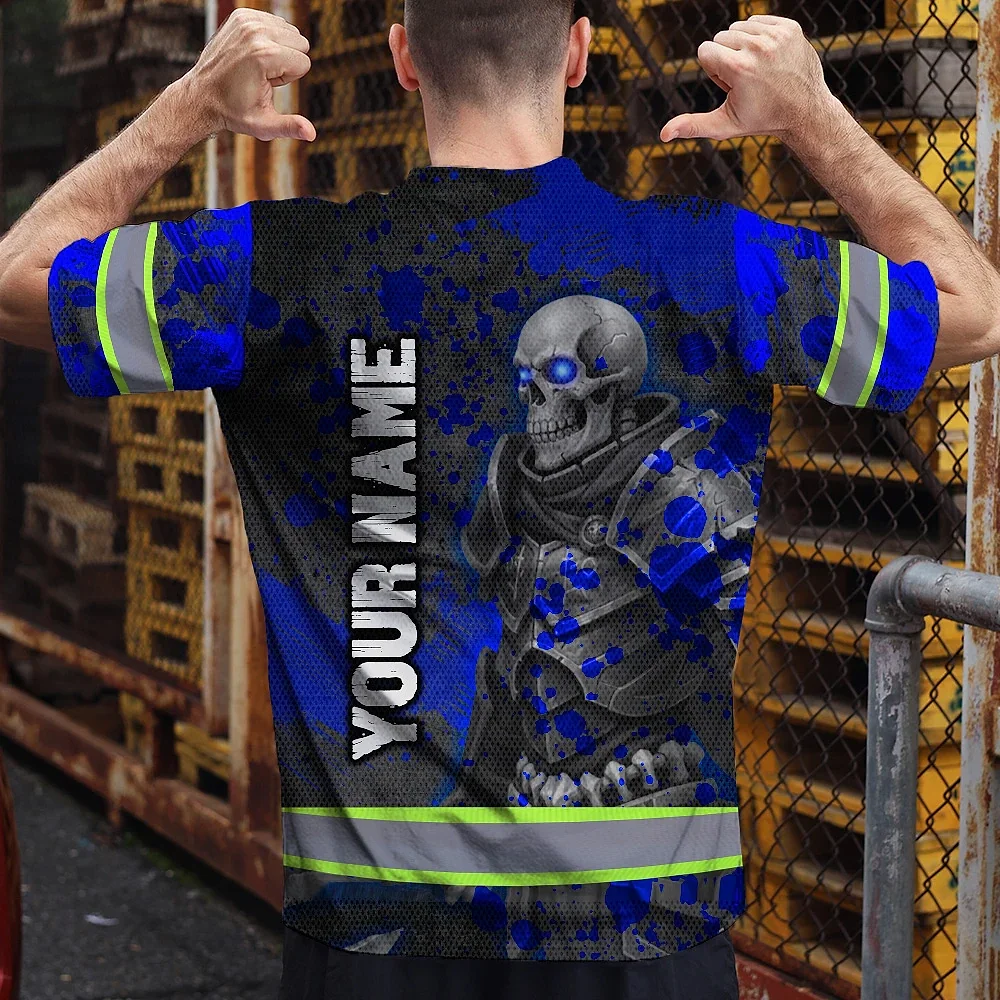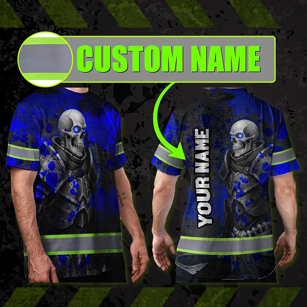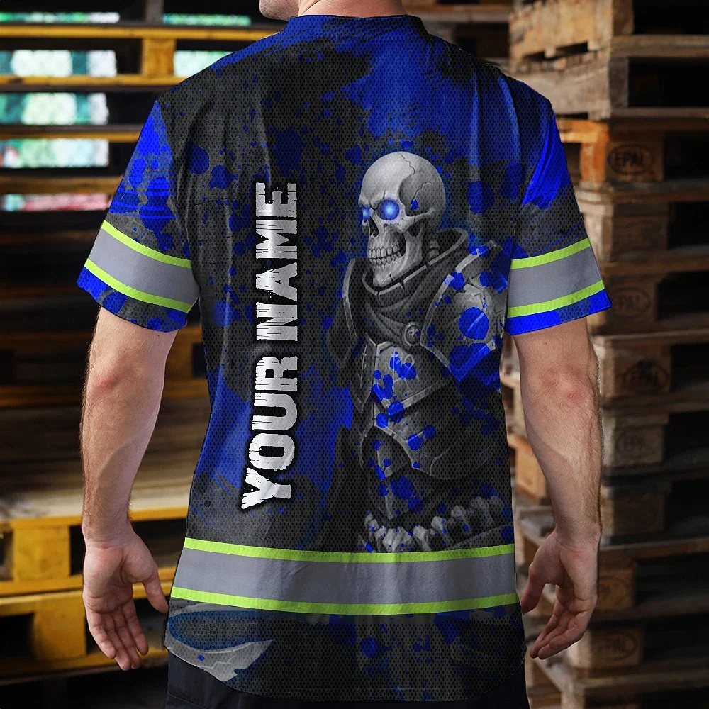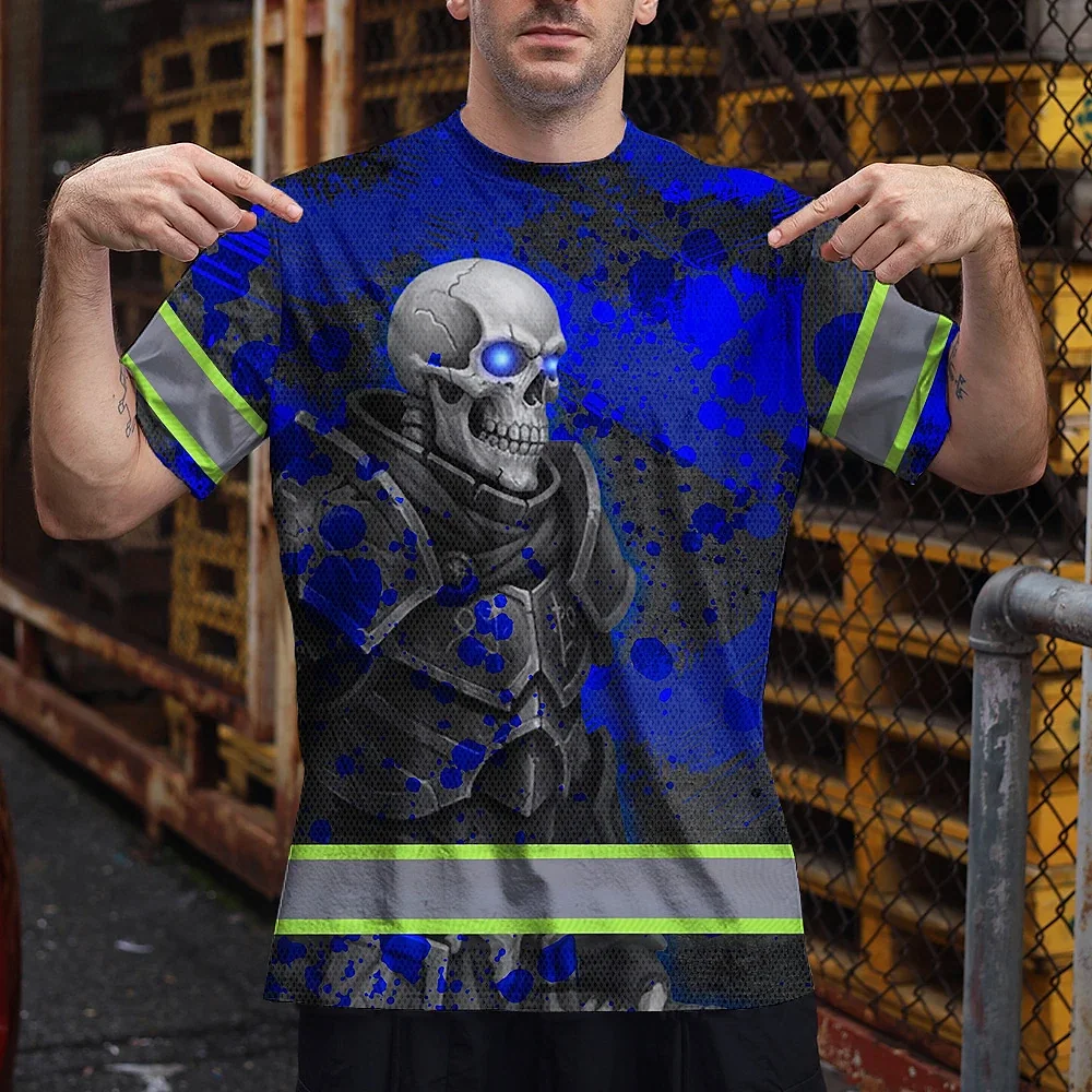 Hi Vis T Shirt Reflective Tapes Blue Grey Neon Skull Custom Name Safety Workwear For Workers, Truckers, Operators