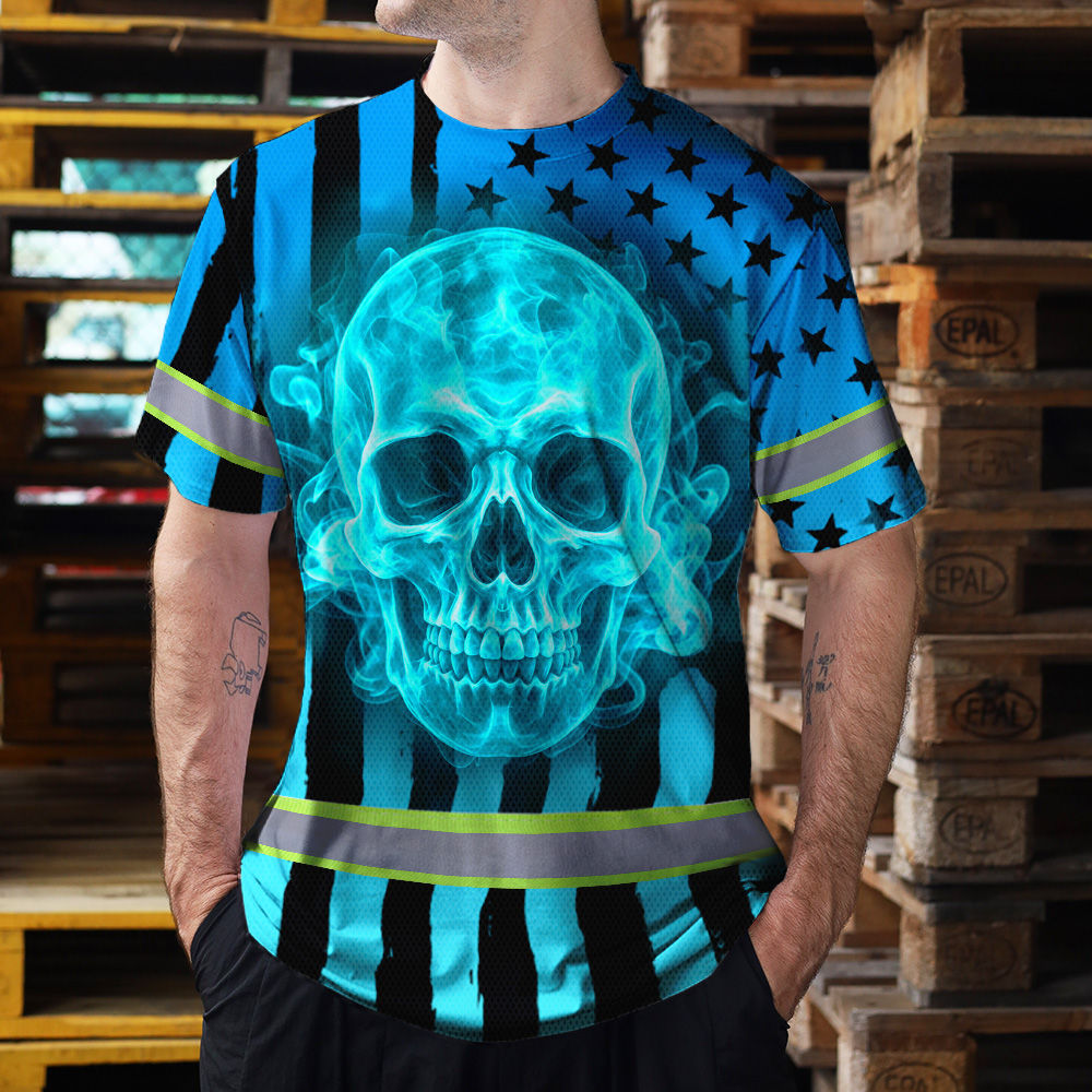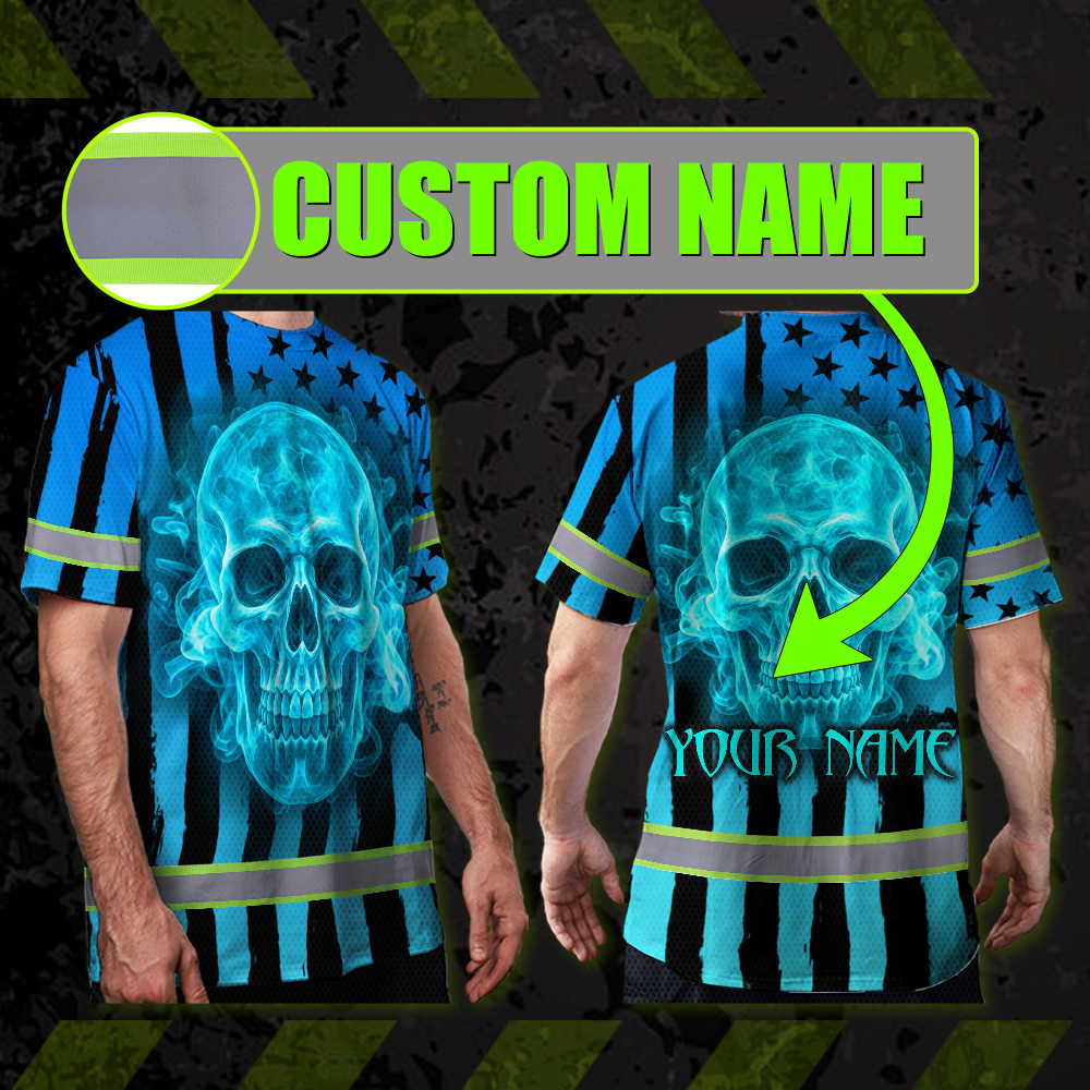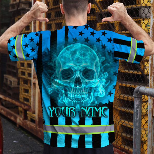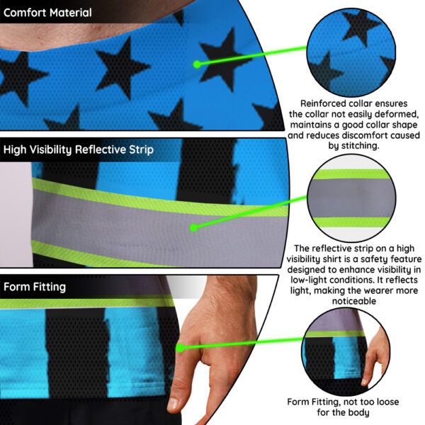 Hi Vis T Shirt Reflective Tapes Blue Neon US Flag Custom Name Safety Workwear For Workers, Truckers, Operators