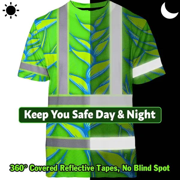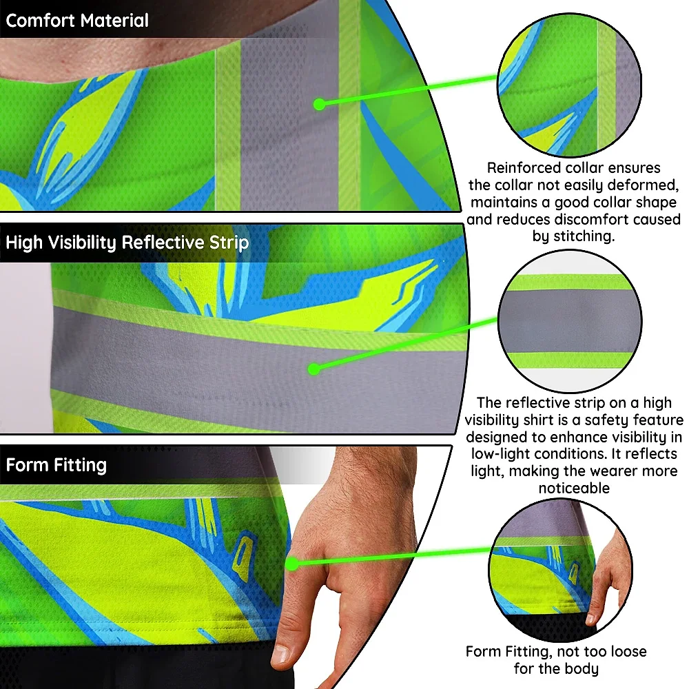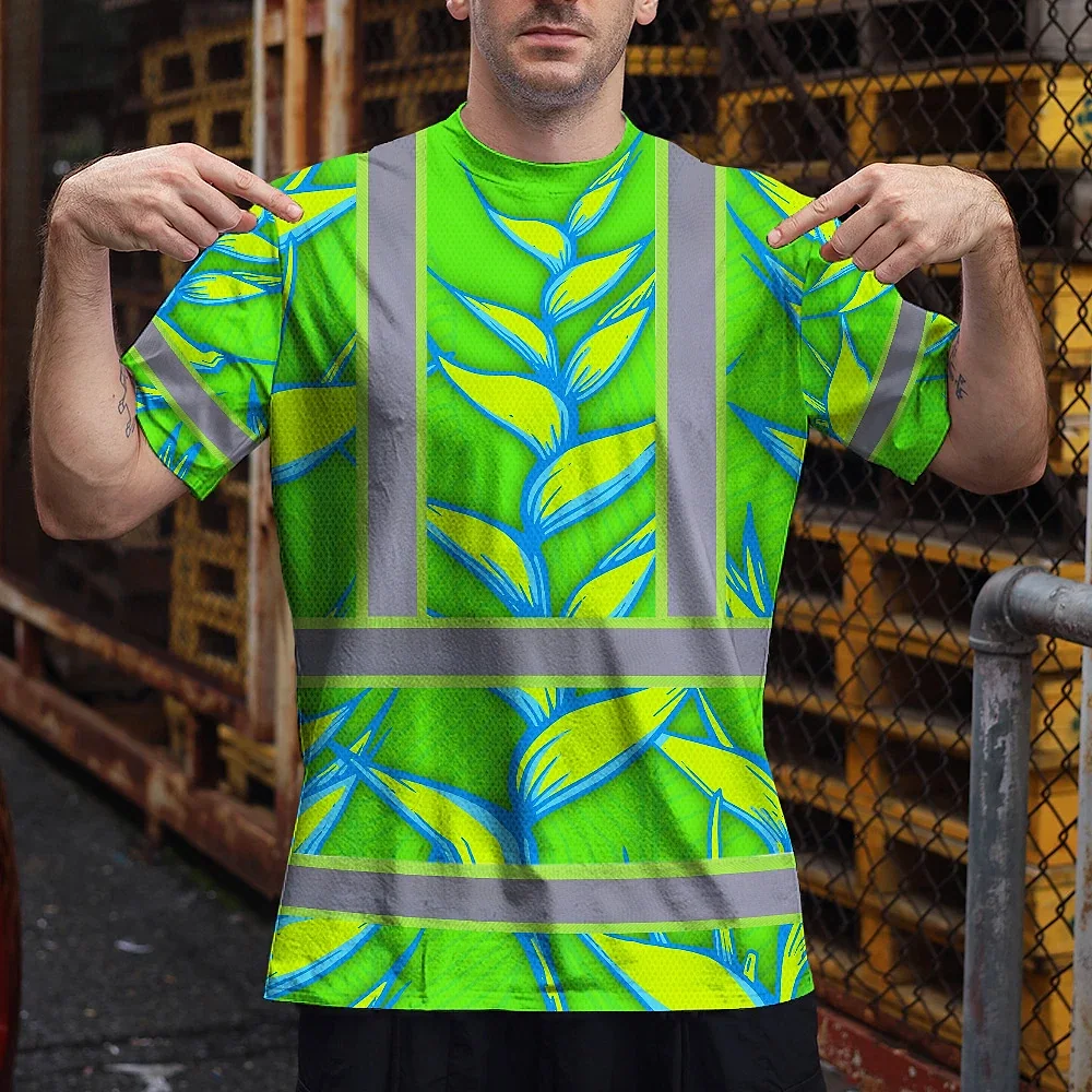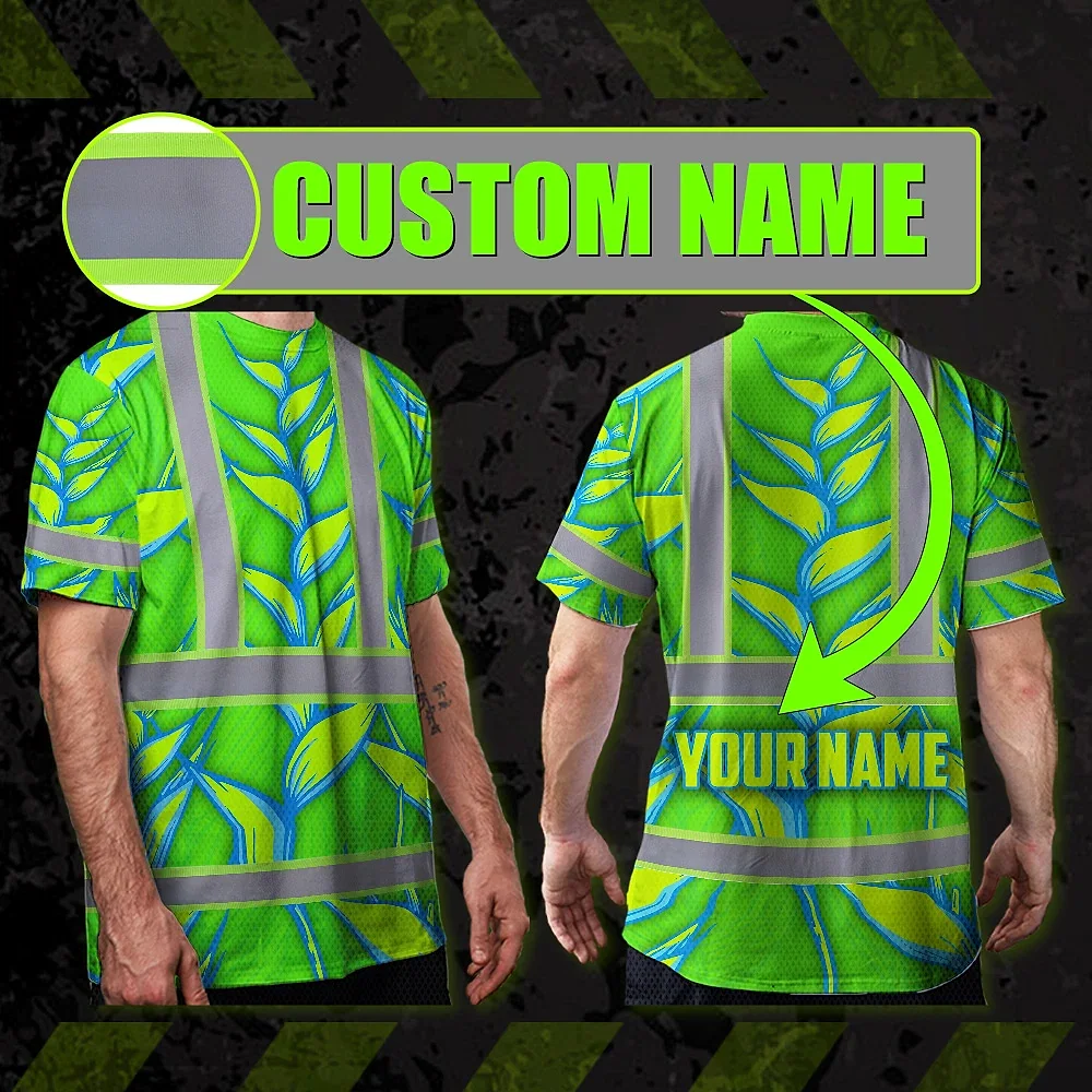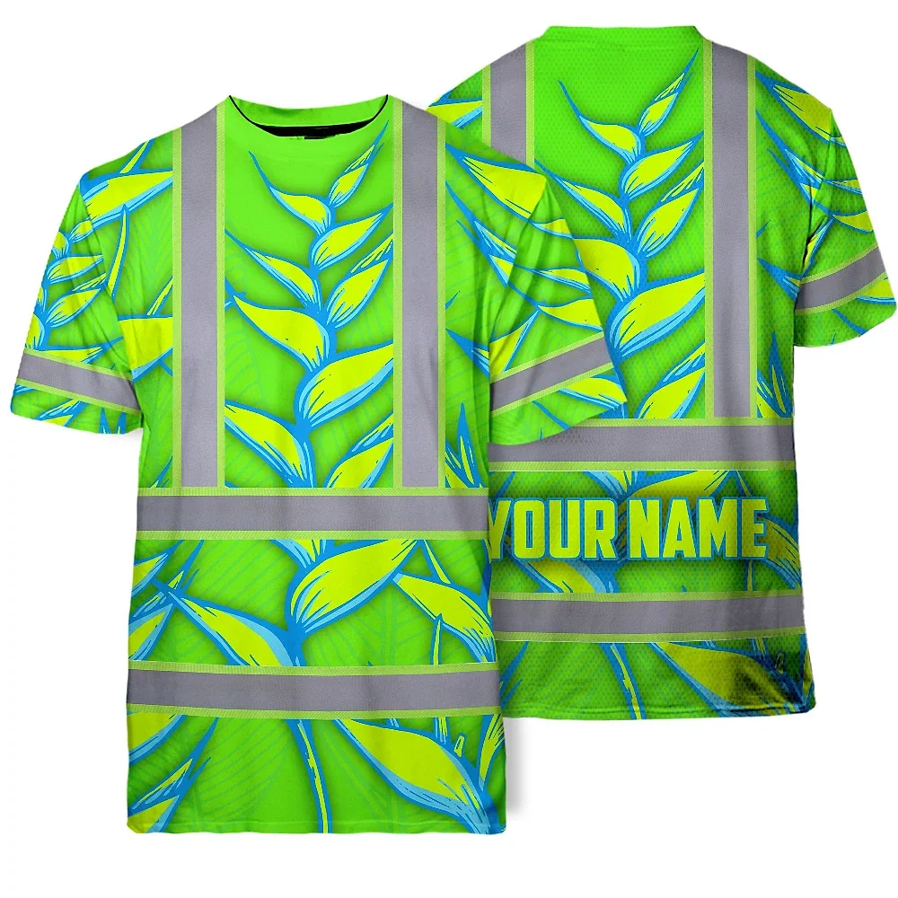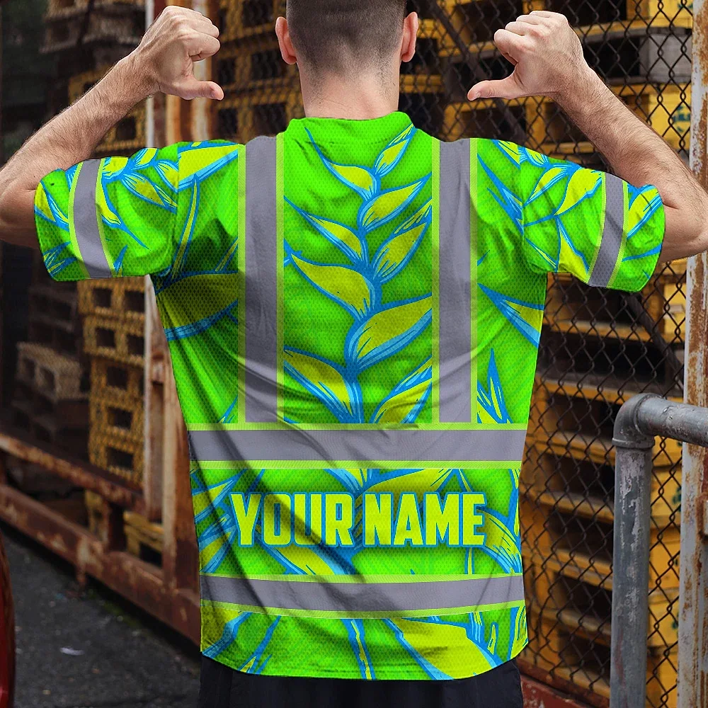 Hi Vis T Shirt Reflective Tapes Green Neon Blue Heliconia Custom Name Safety Workwear For Workers, Truckers, Operators