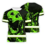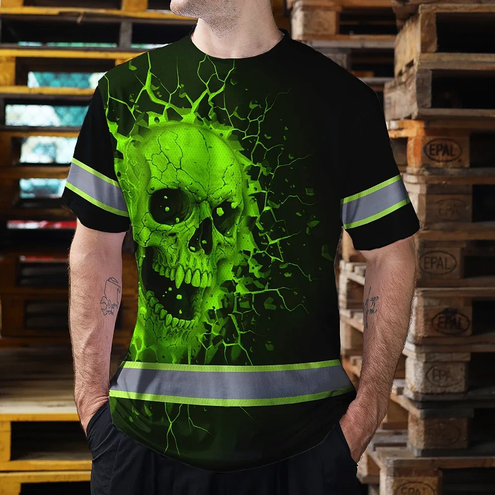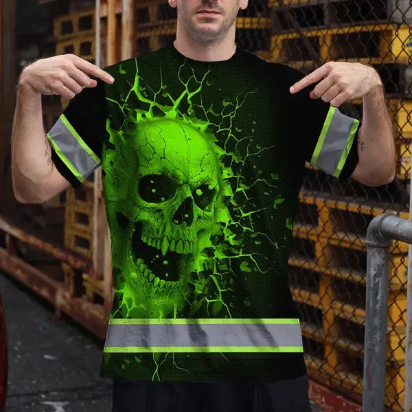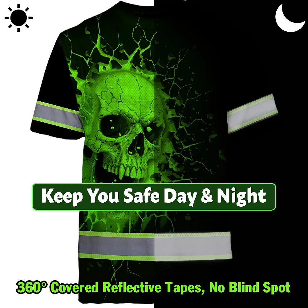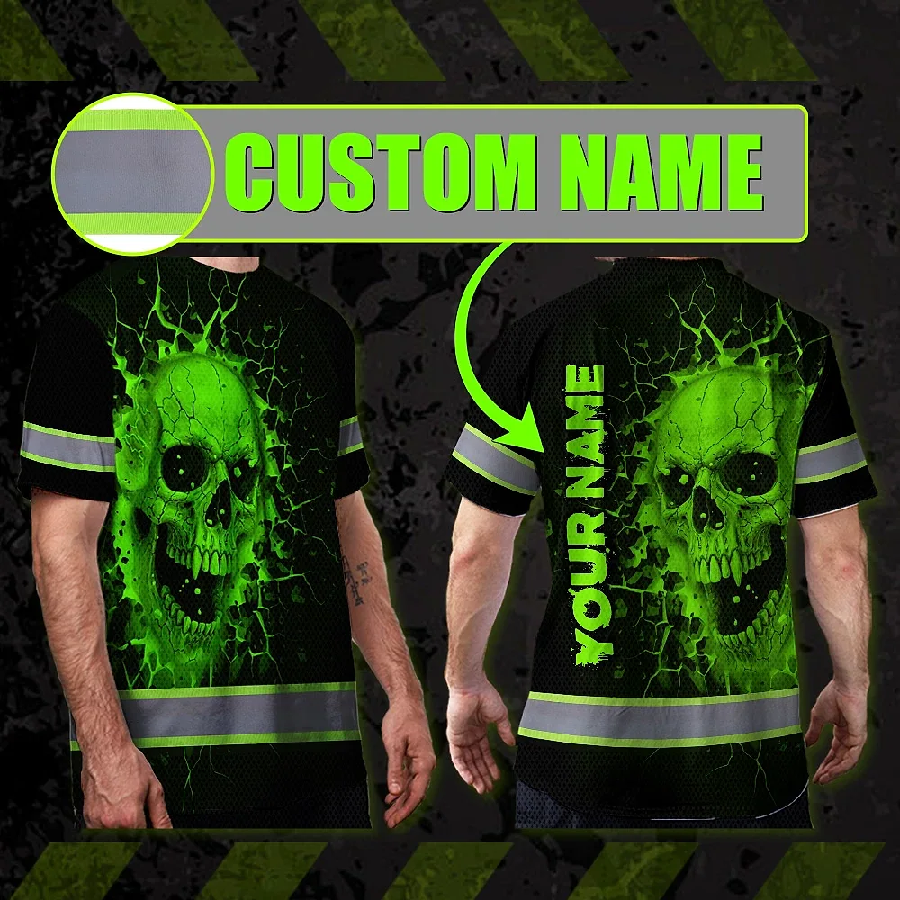 Hi Vis T Shirt Reflective Tapes Green Neon Break Skull Custom Name Safety Workwear For Workers, Truckers, Operators