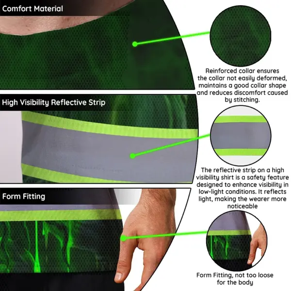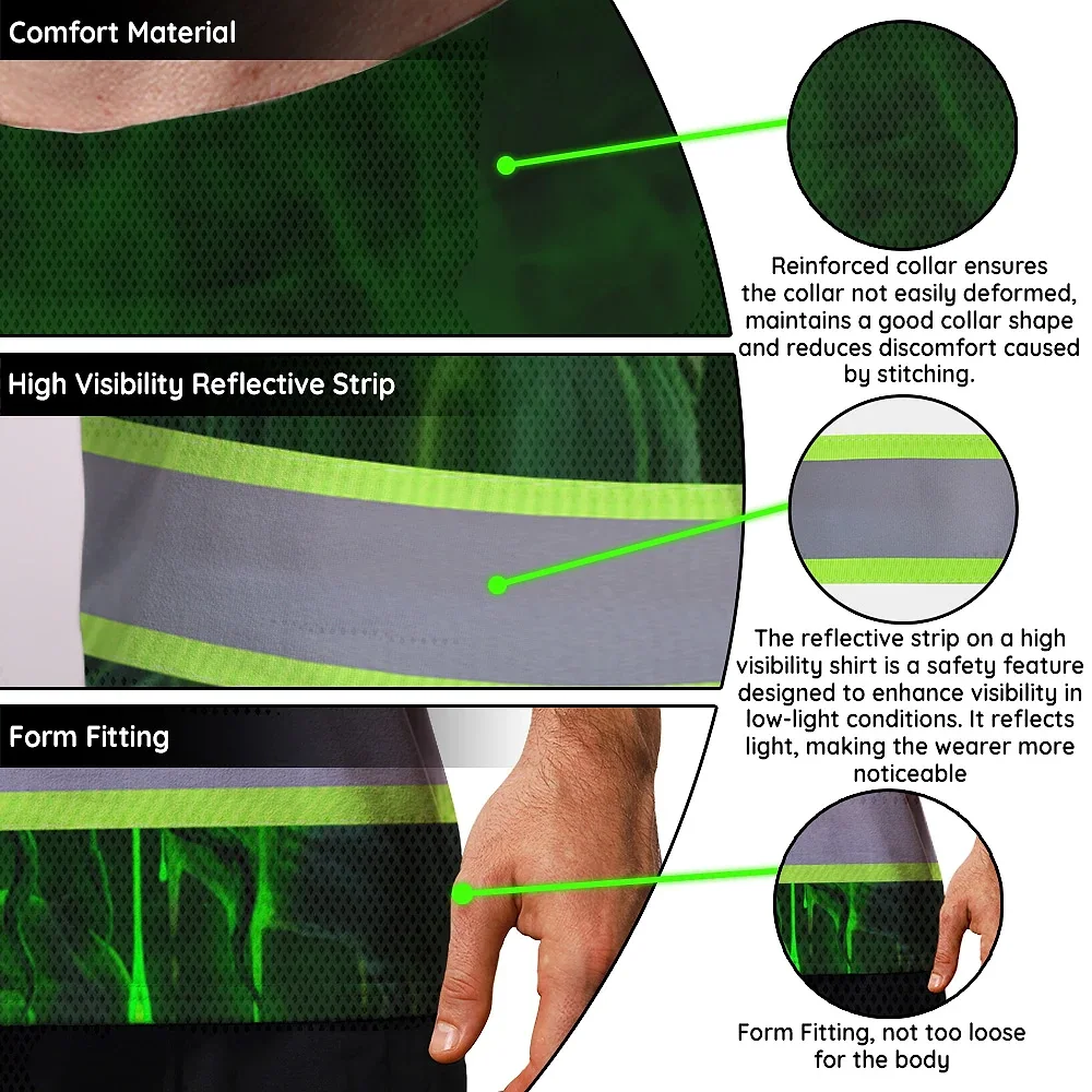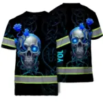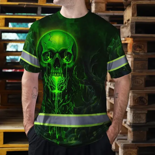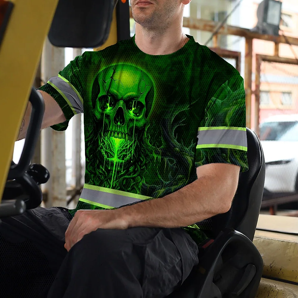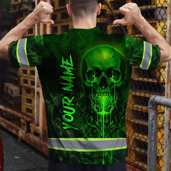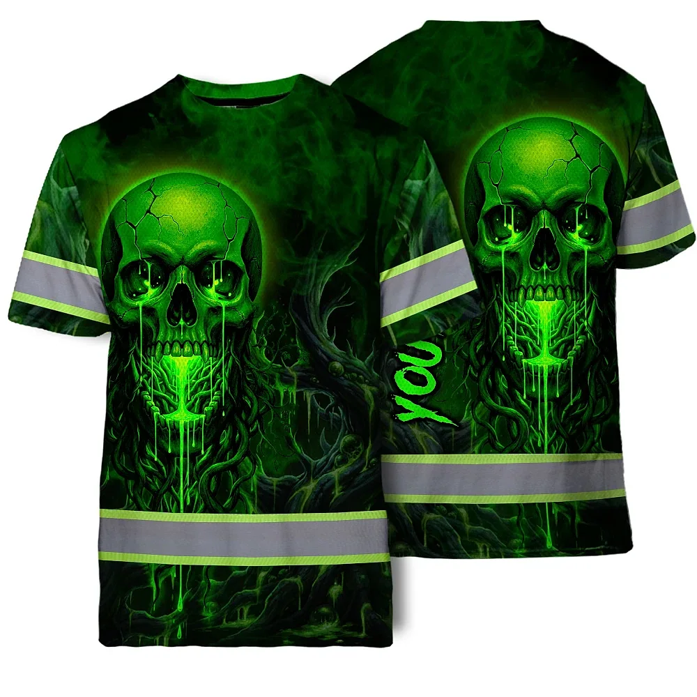 Hi Vis T Shirt Reflective Tapes Green Neon Skull 3 Custom Name Safety Workwear For Workers, Truckers, Operators