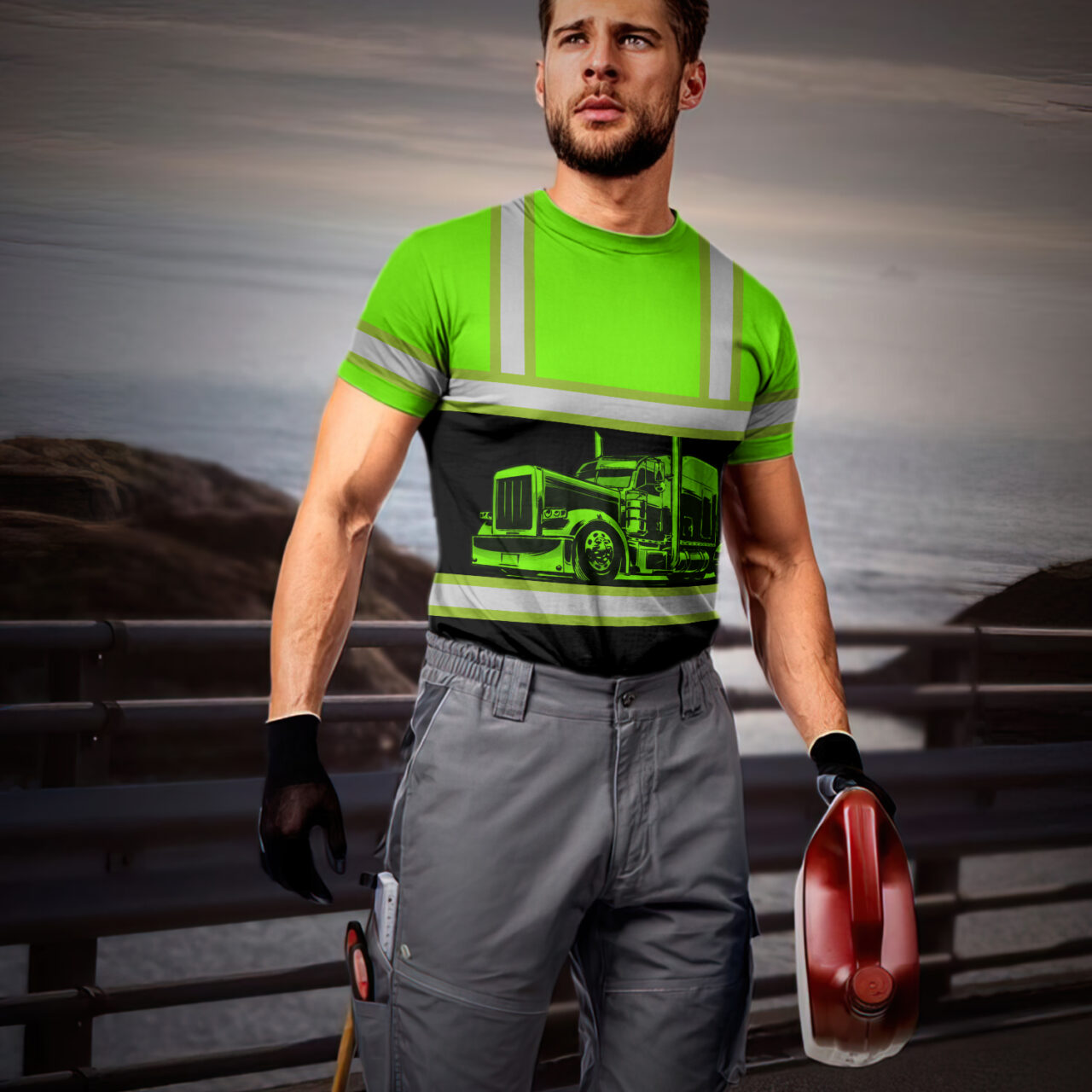 Hi Vis T Shirt Reflective Tapes Green Semi Truck Driver Custom Name Safety Workwear For Truckers, Patriotic