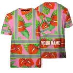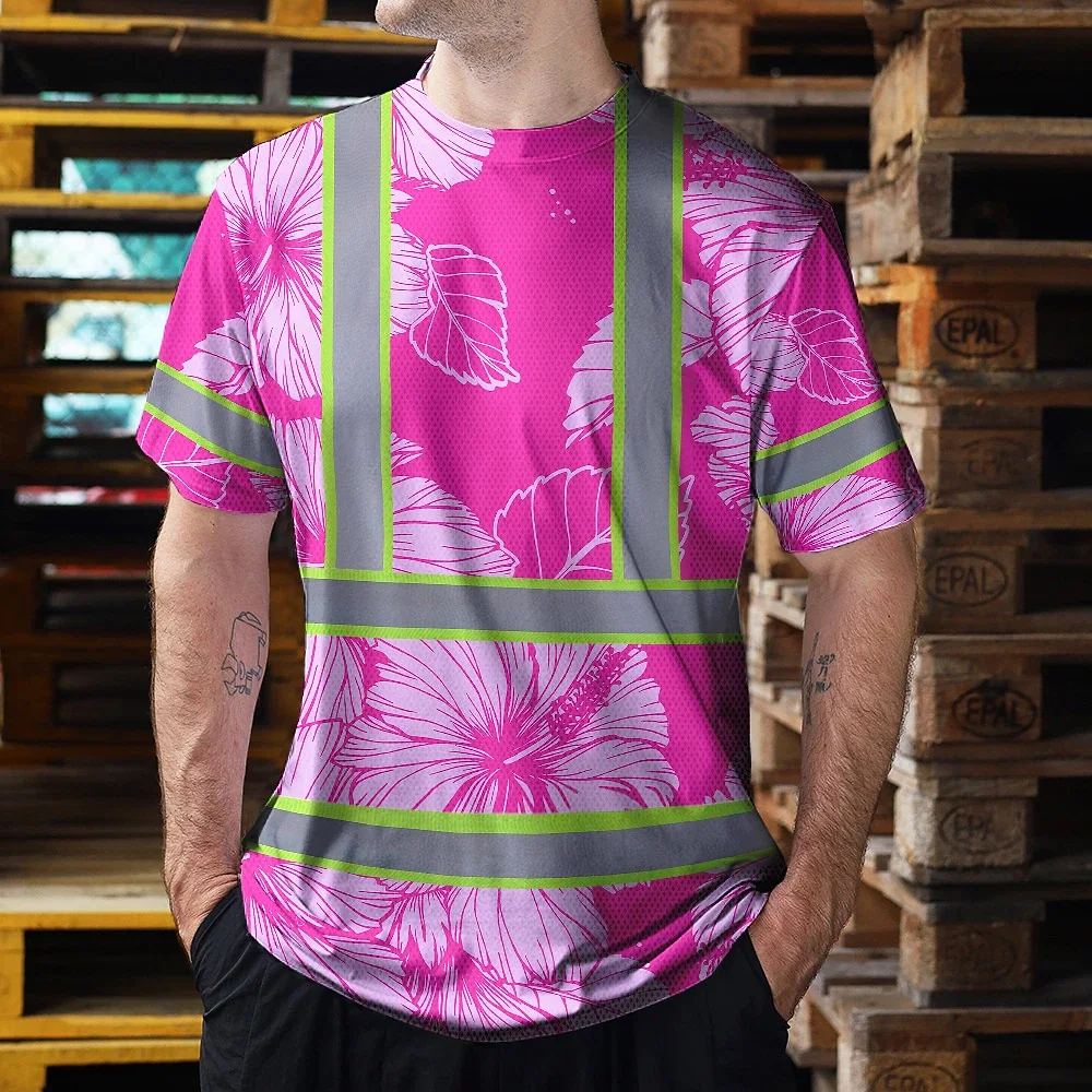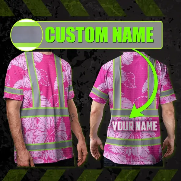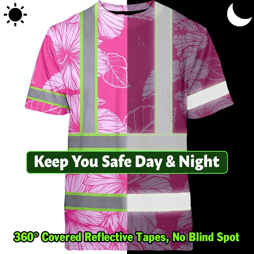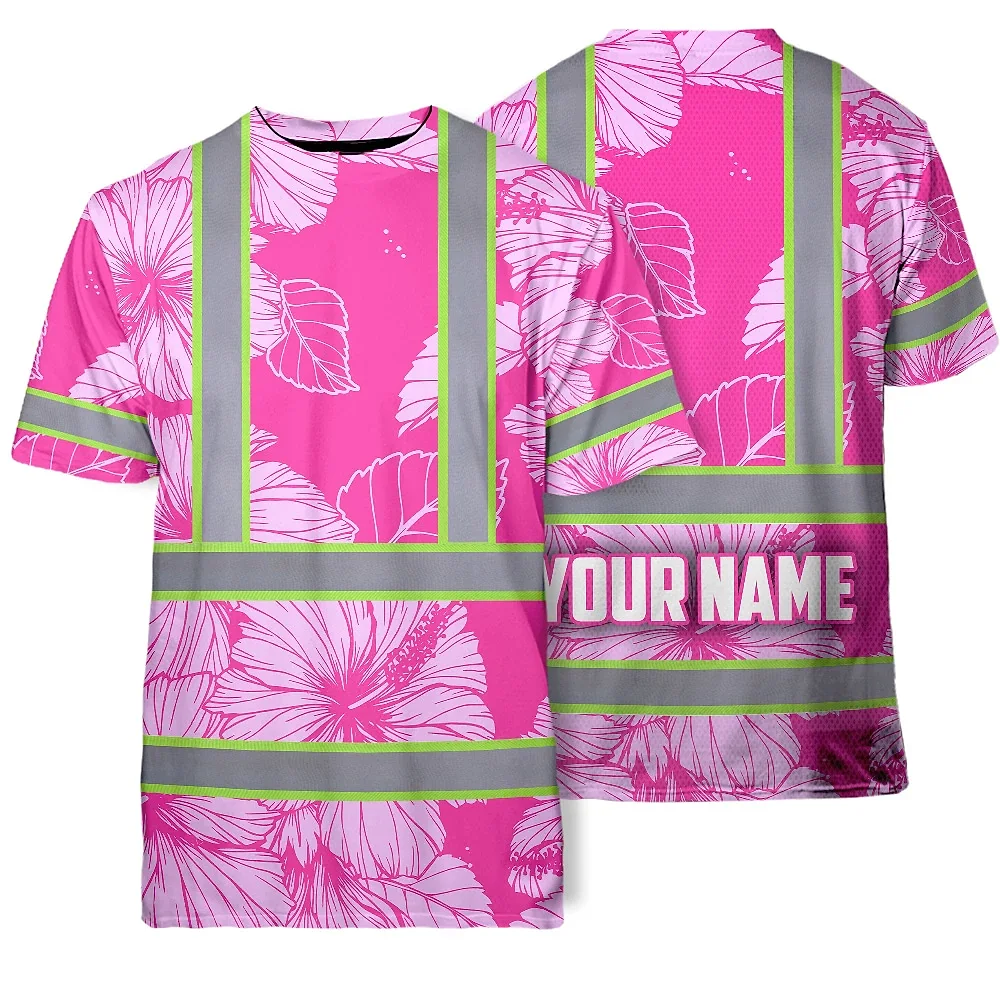 Hi Vis T Shirt Reflective Tapes Pink Neon Hibiscus Custom Name Safety Workwear For Workers, Truckers, Operators