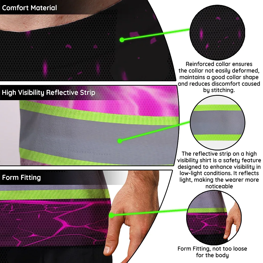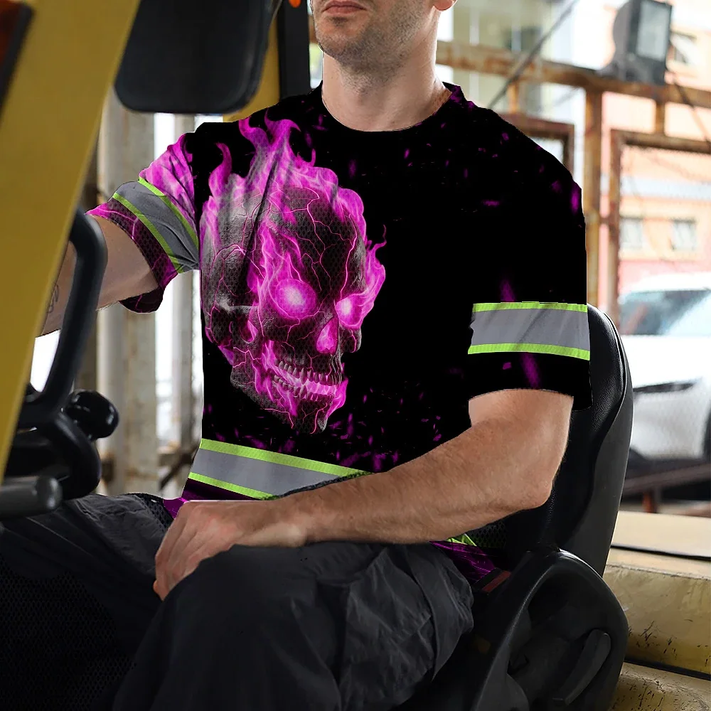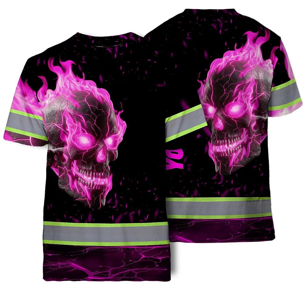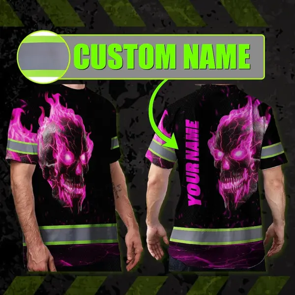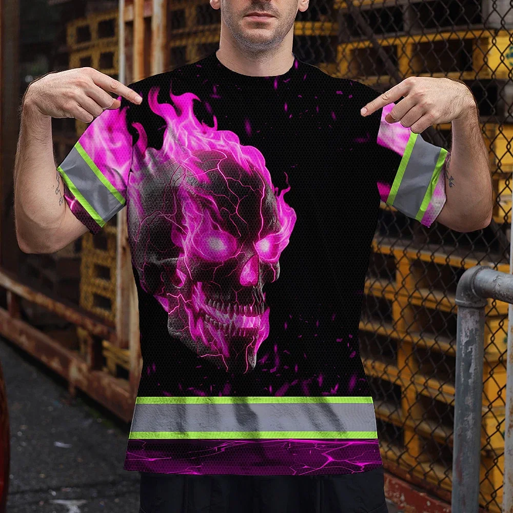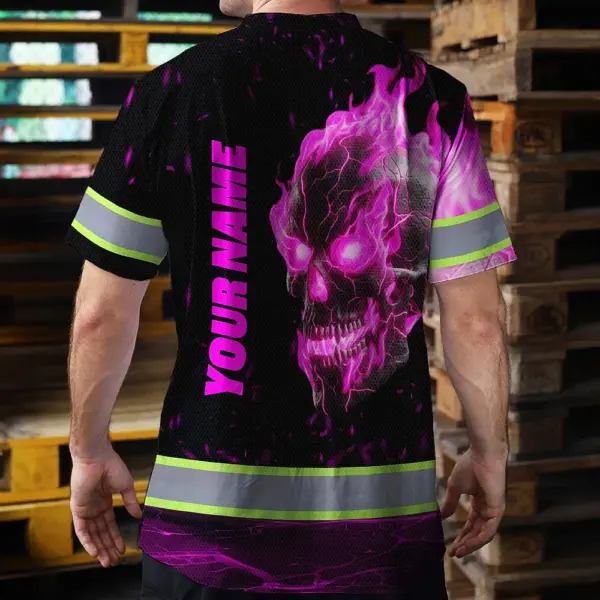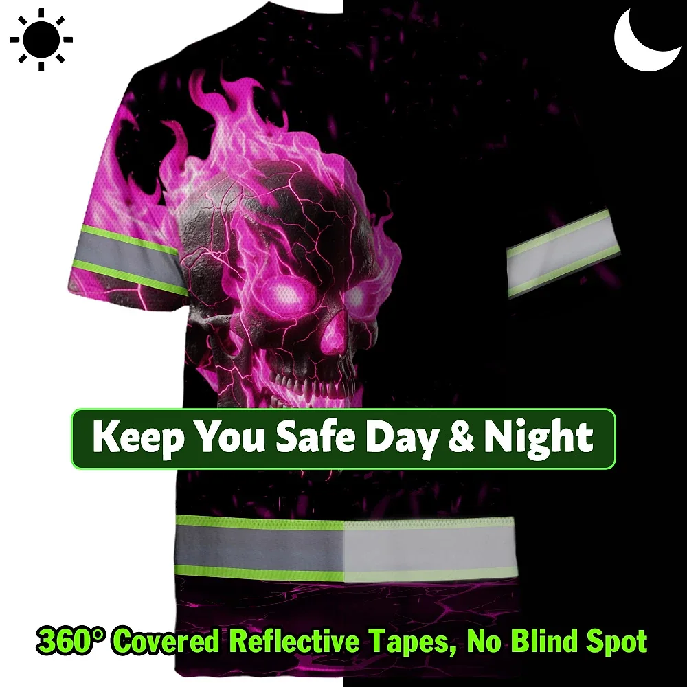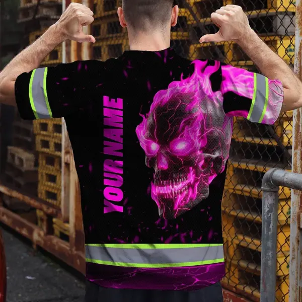 Hi Vis T Shirt Reflective Tapes Pink Neon Skull Custom Name Safety Workwear For Workers, Truckers, Operators