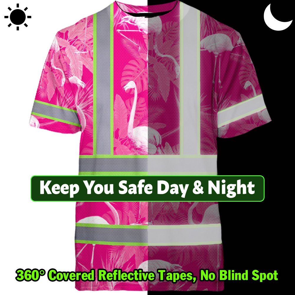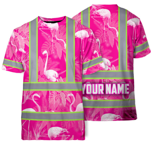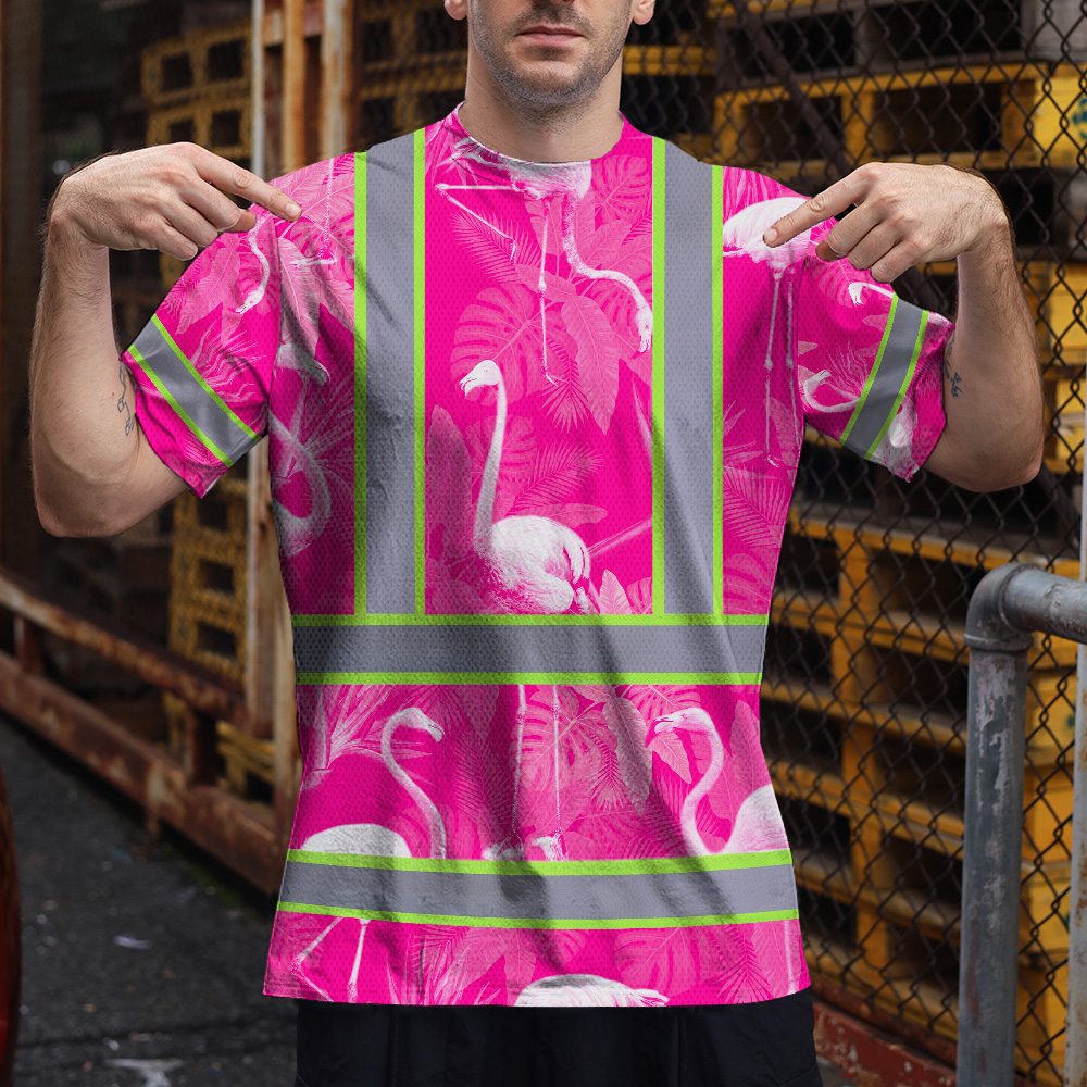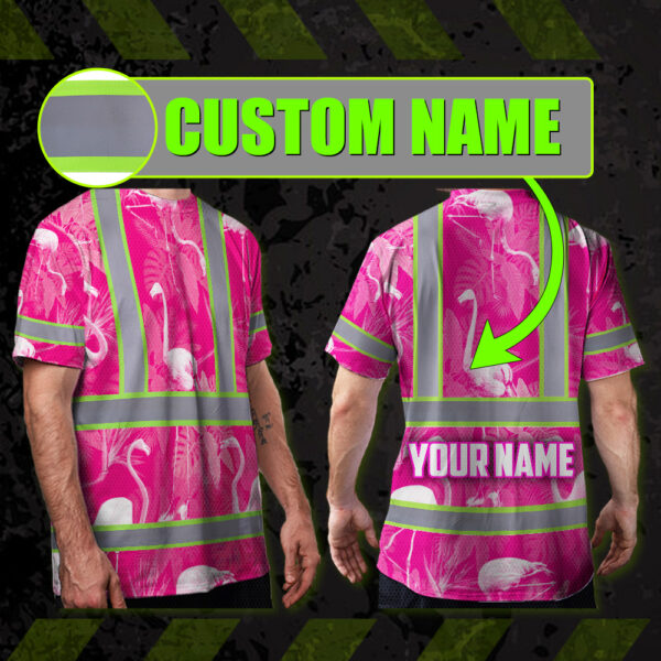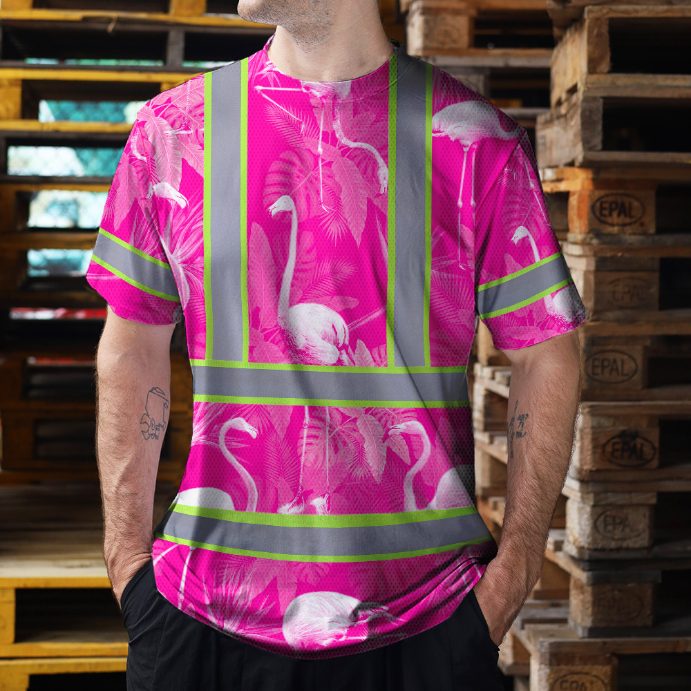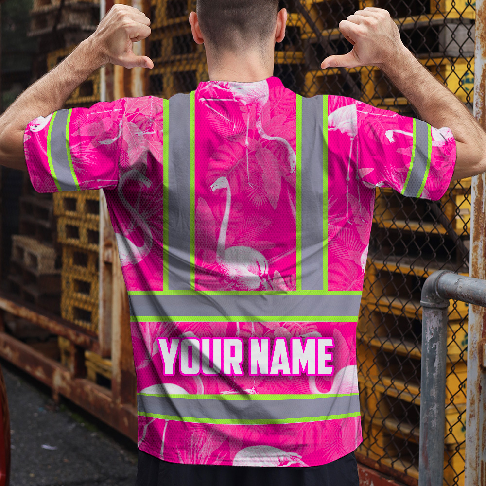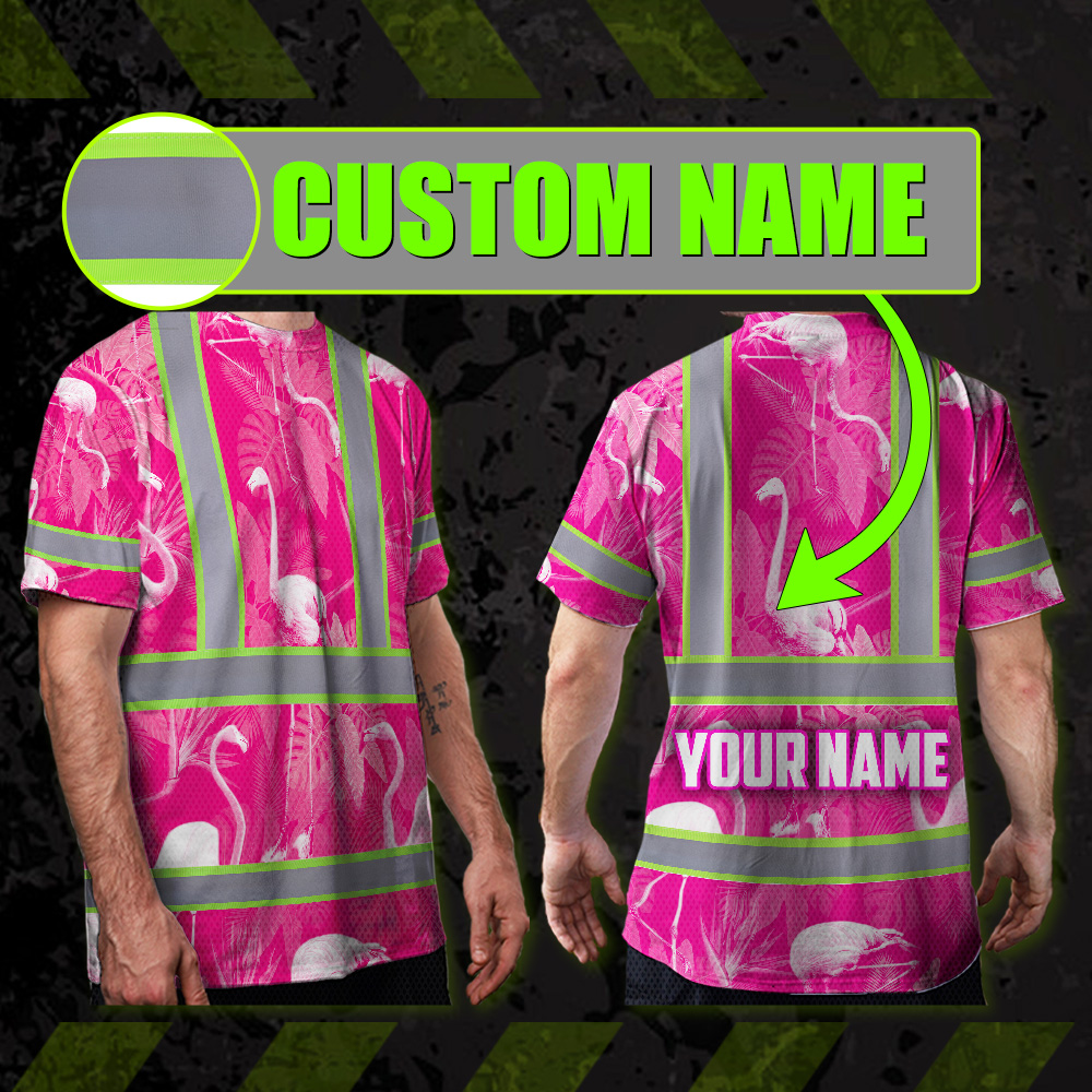 Hi Vis T Shirt Reflective Tapes Pink Neon White Flamingo Custom Name Safety Workwear For Workers, Truckers, Operators