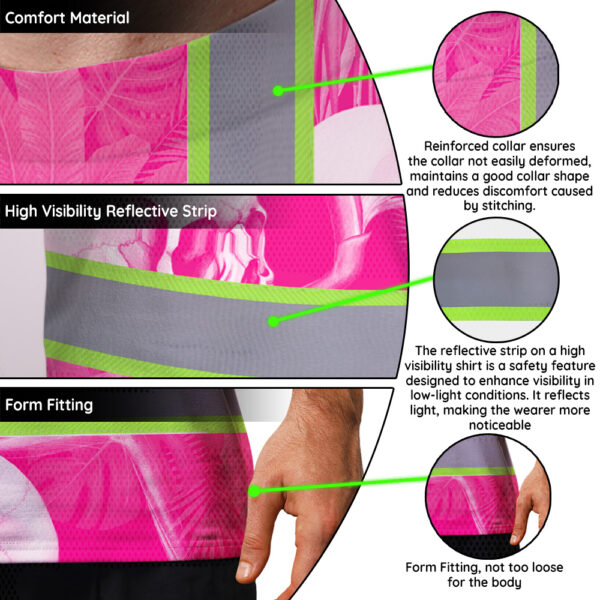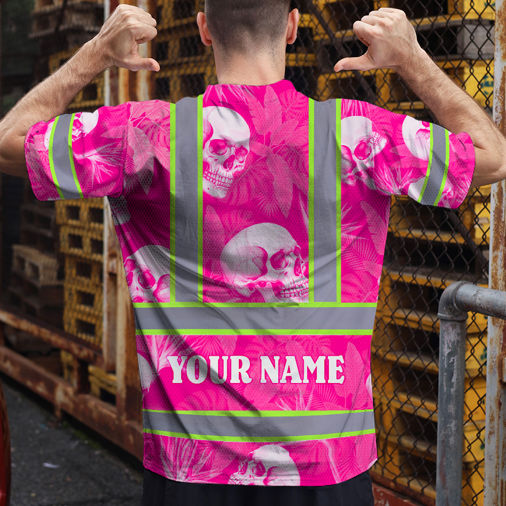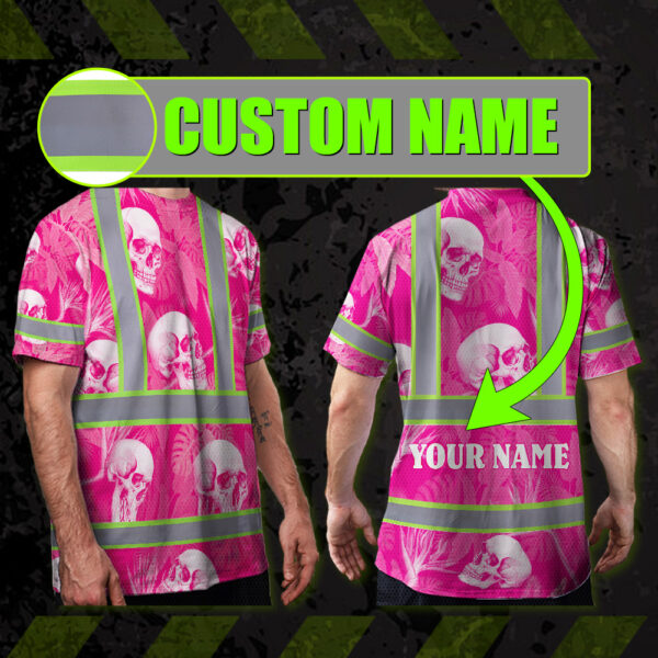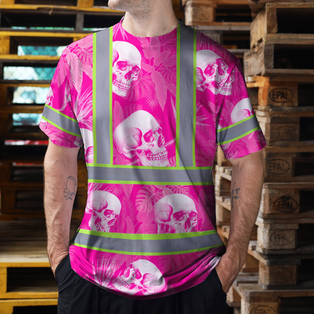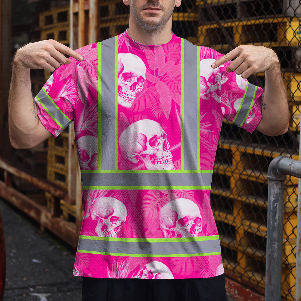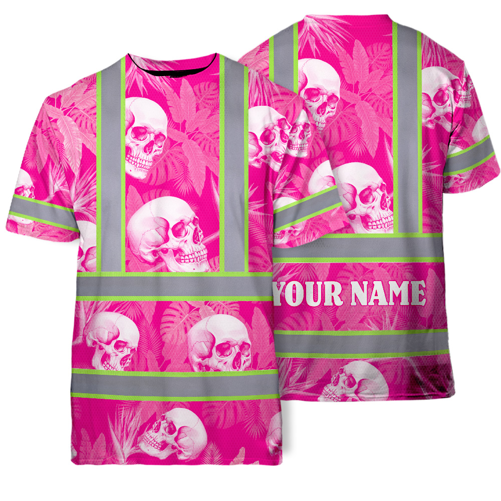 Hi Vis T Shirt Reflective Tapes Pink Neon White Skull Custom Name Safety Workwear For Workers, Truckers, Operators