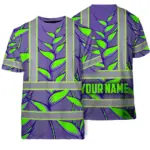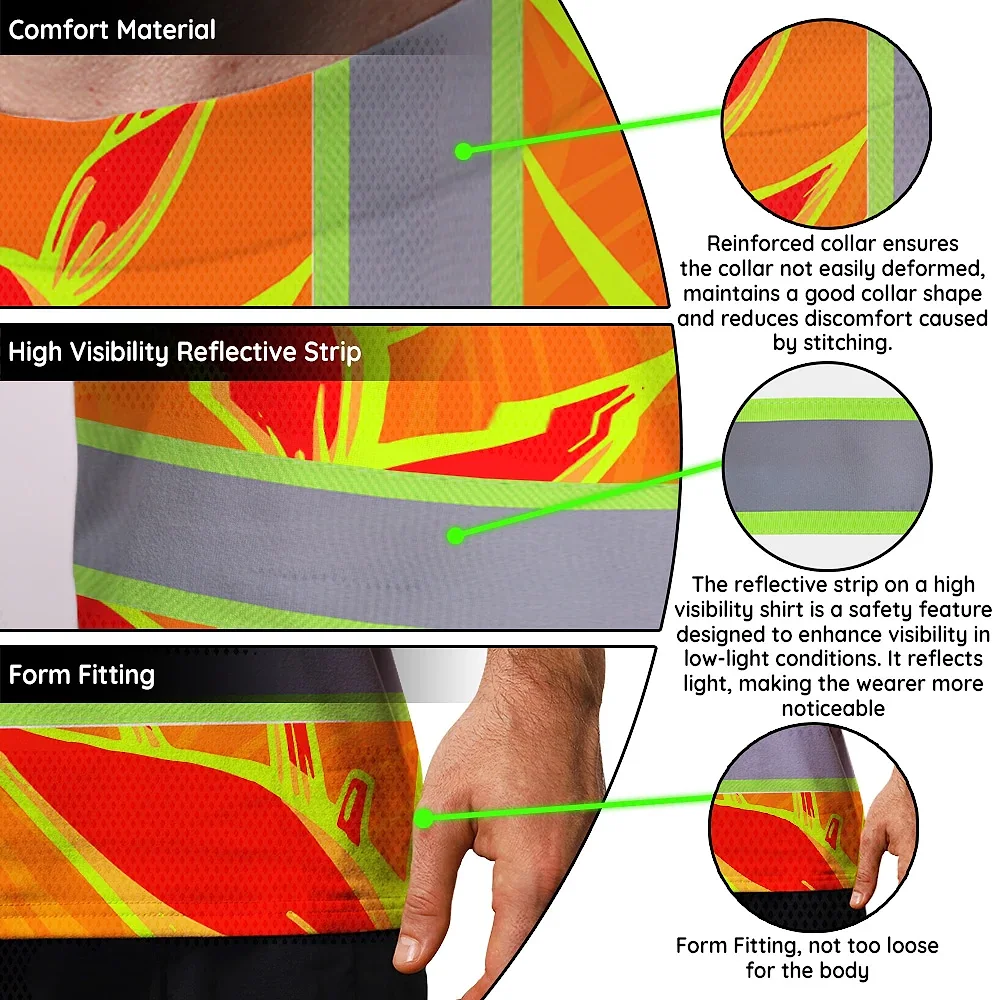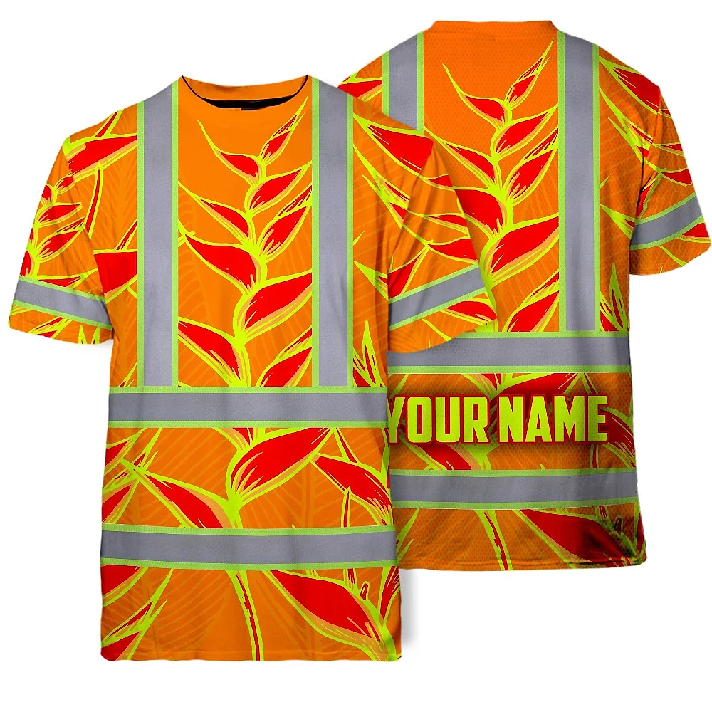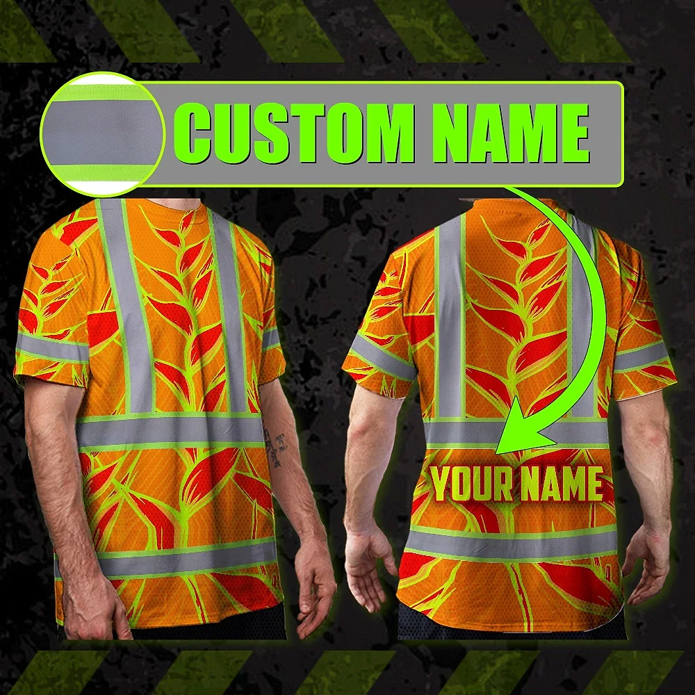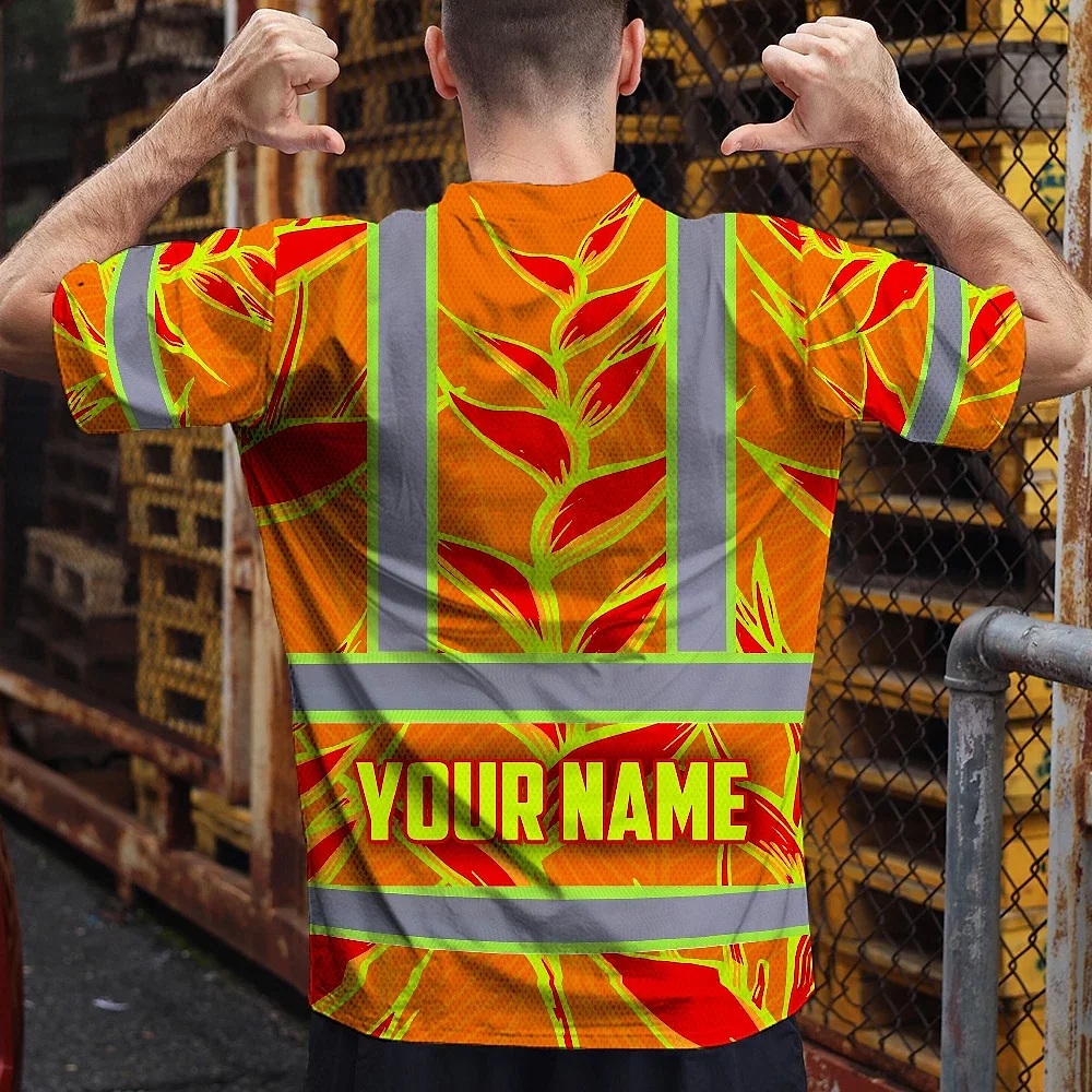 Hi Vis T Shirt Reflective Tapes Red Neon Lime Heliconia Custom Name Safety Workwear For Workers, Truckers, Operators