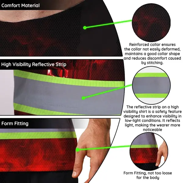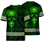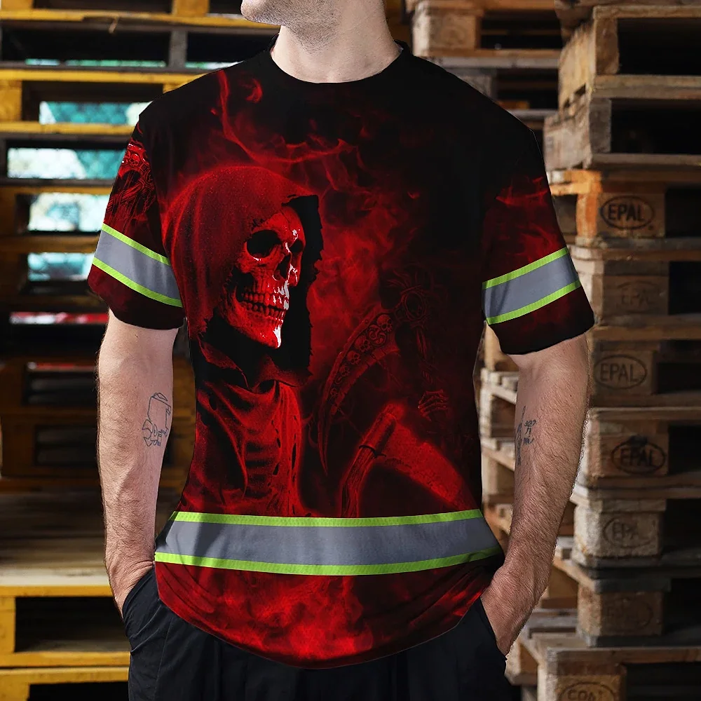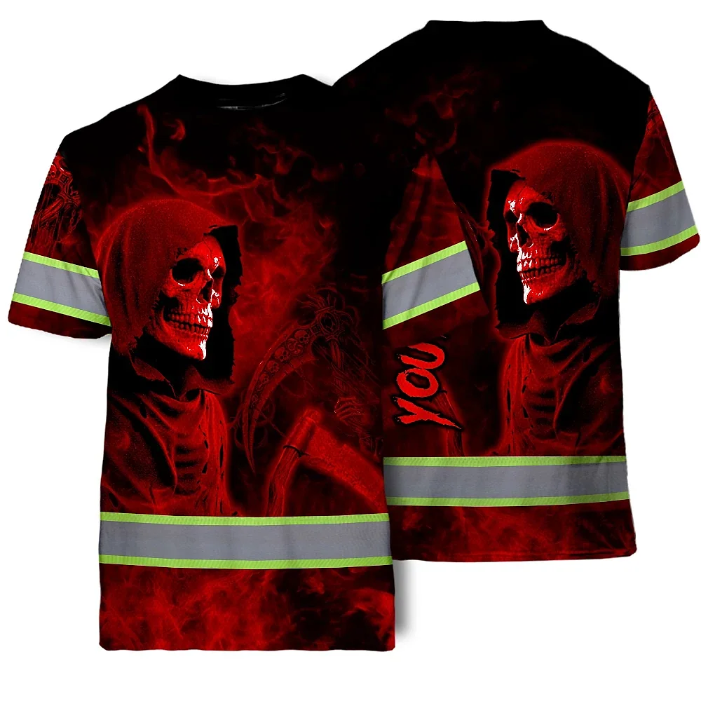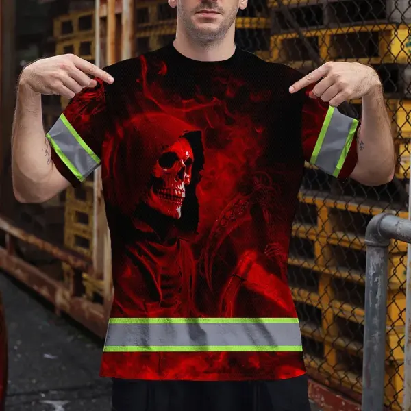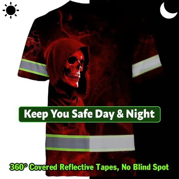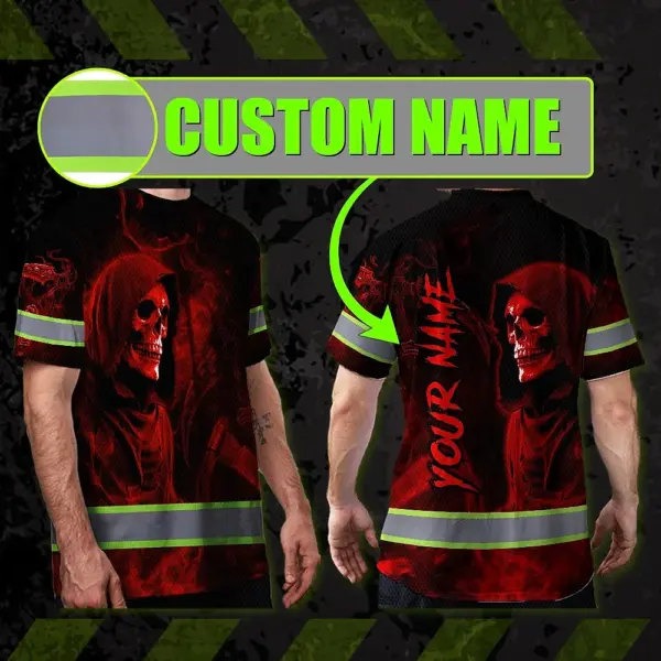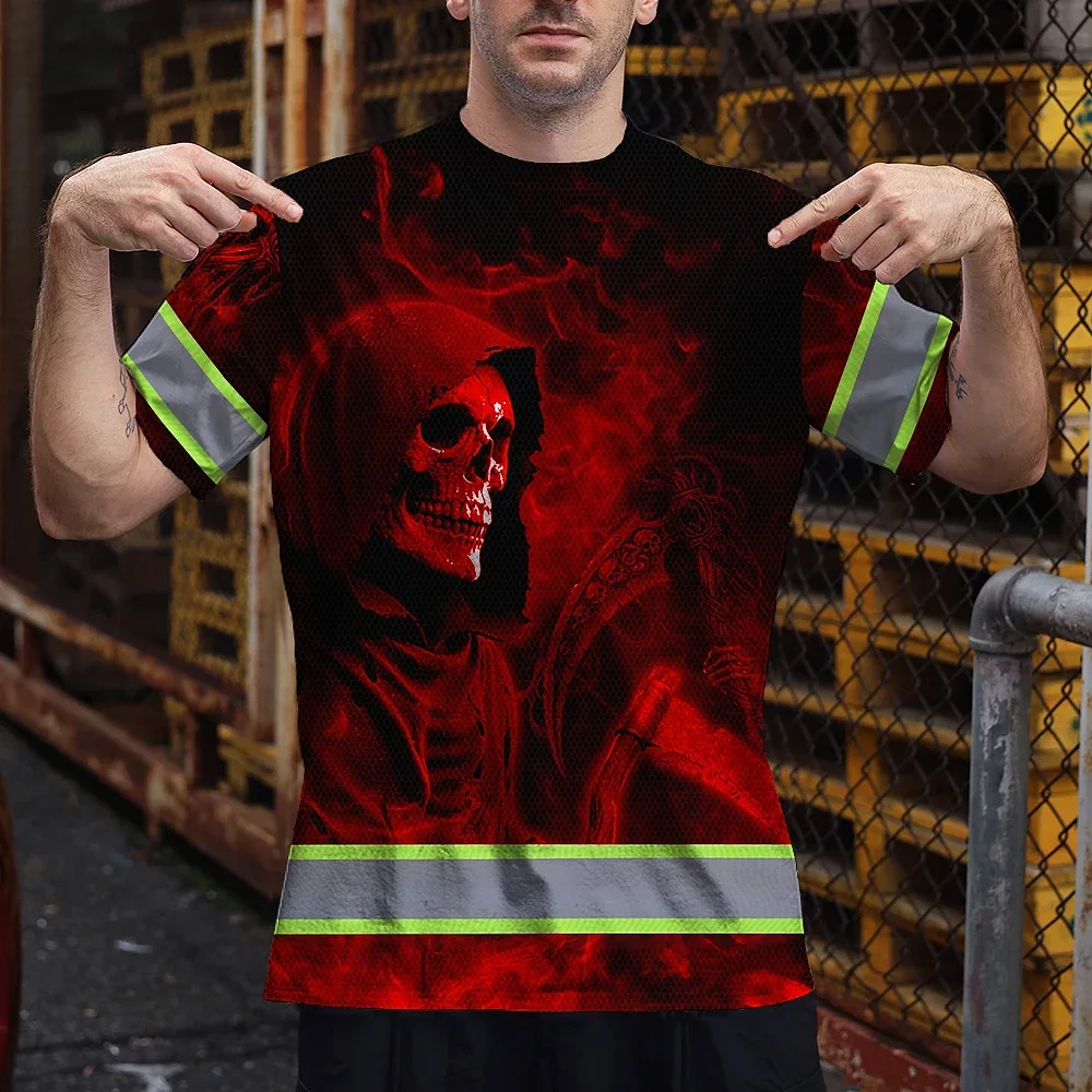 Hi Vis T Shirt Reflective Tapes Red Neon Skull Custom Name Safety Workwear For Workers, Truckers, Operators