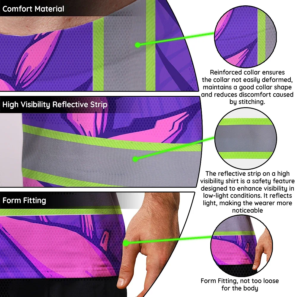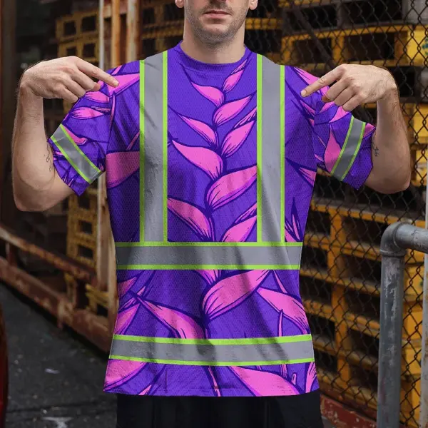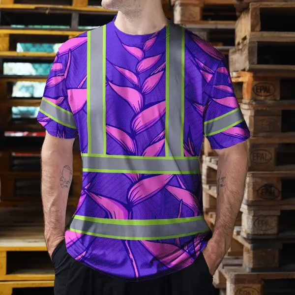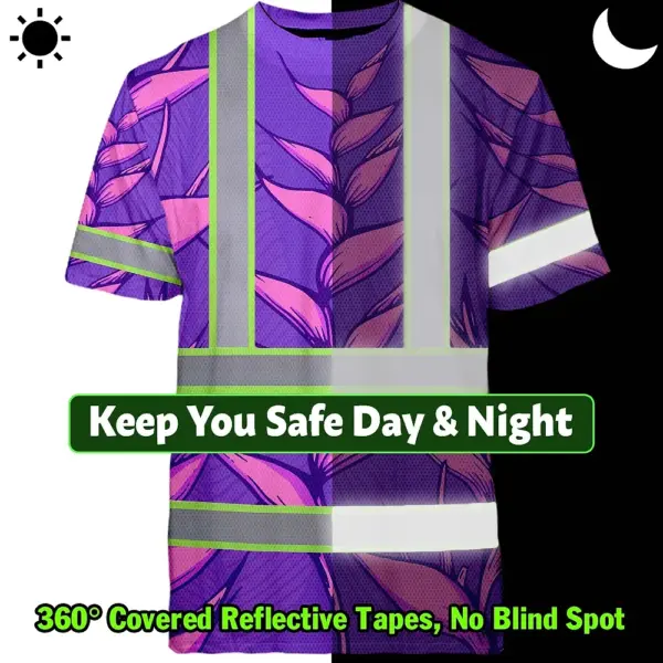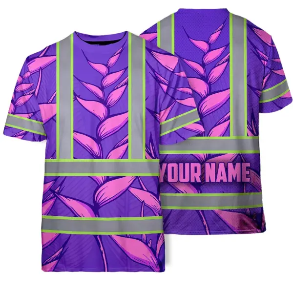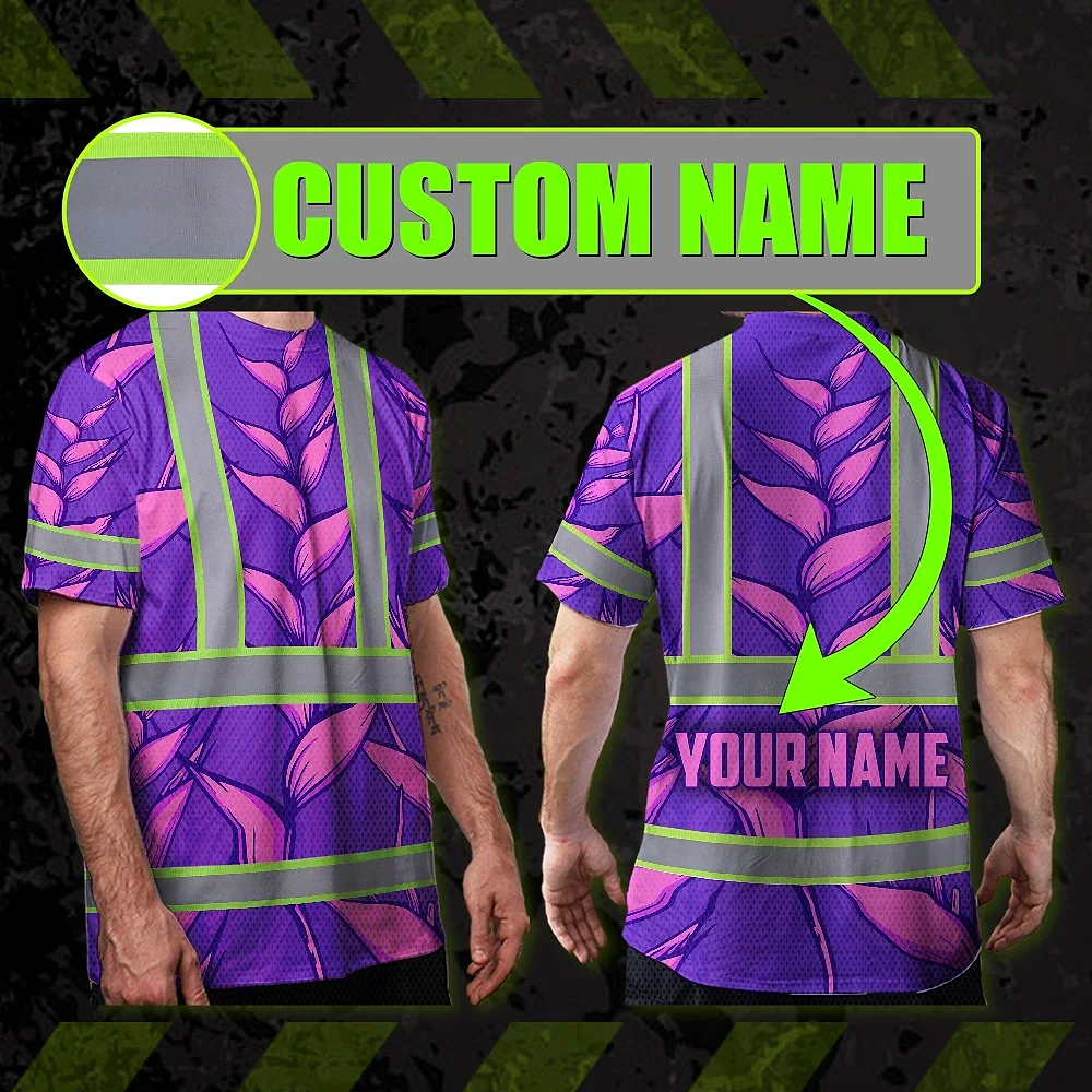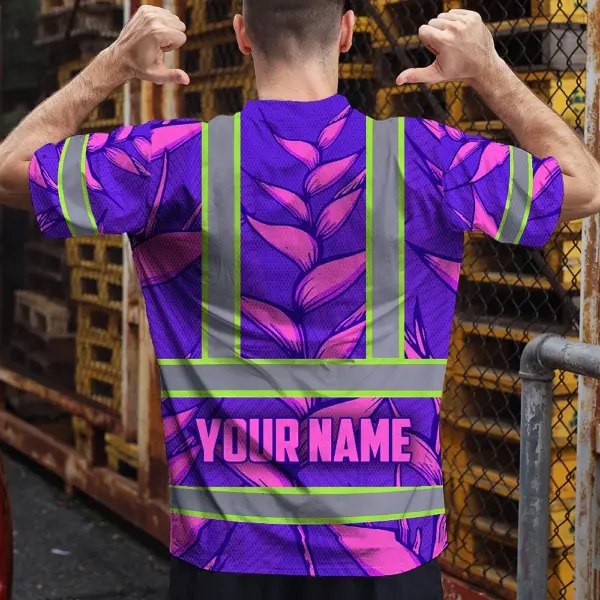 Hi Vis T Shirt Reflective Tapes Violet Neon Pink Heliconia Custom Name Safety Workwear For Workers, Truckers, Operators