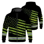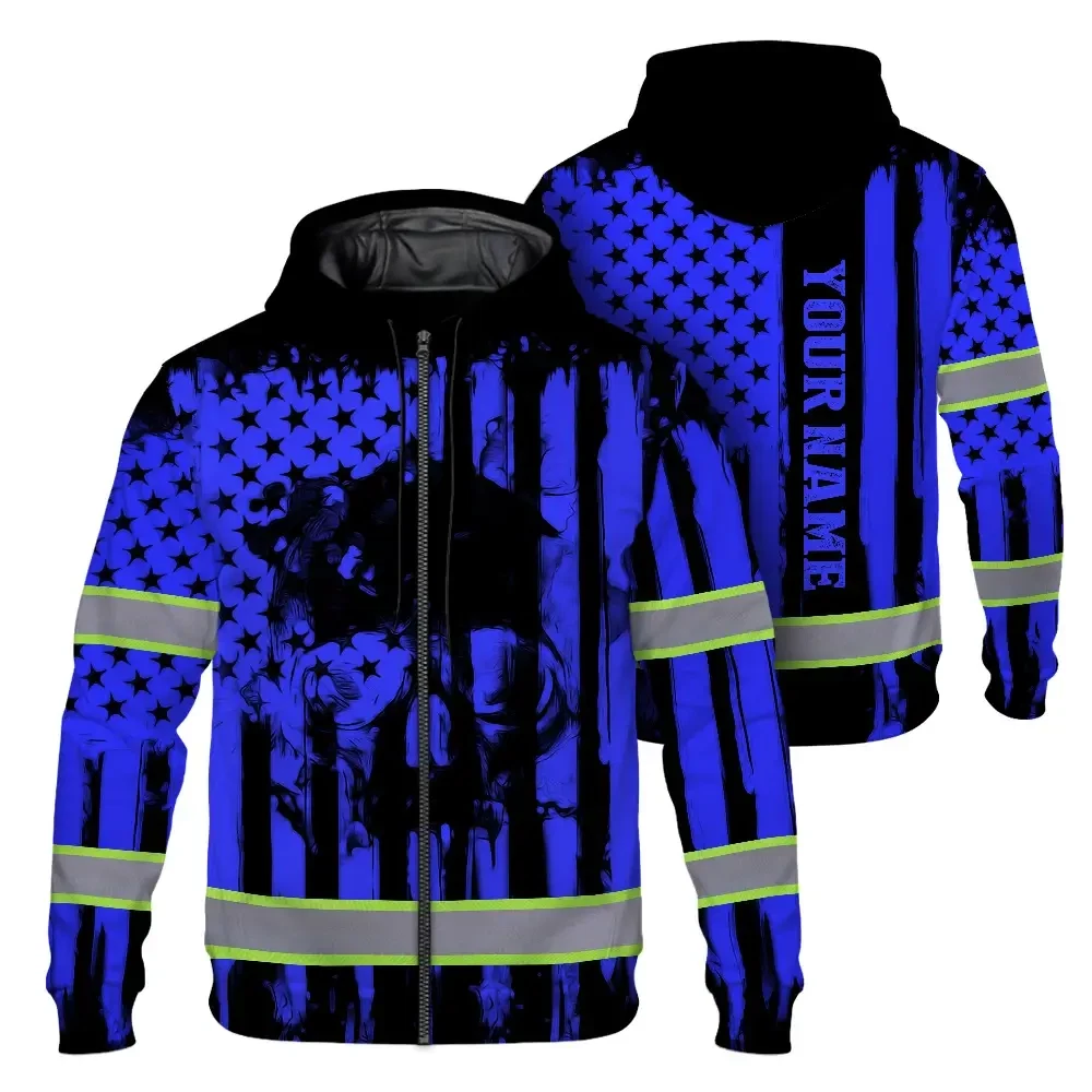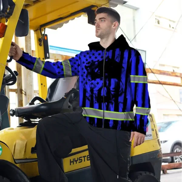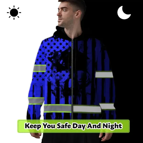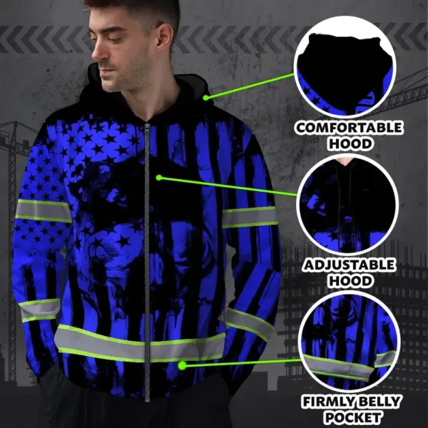 Hi Vis Zip Hoodie Reflective Skull Blue Neon US Flag Custom Name Safety Workwear