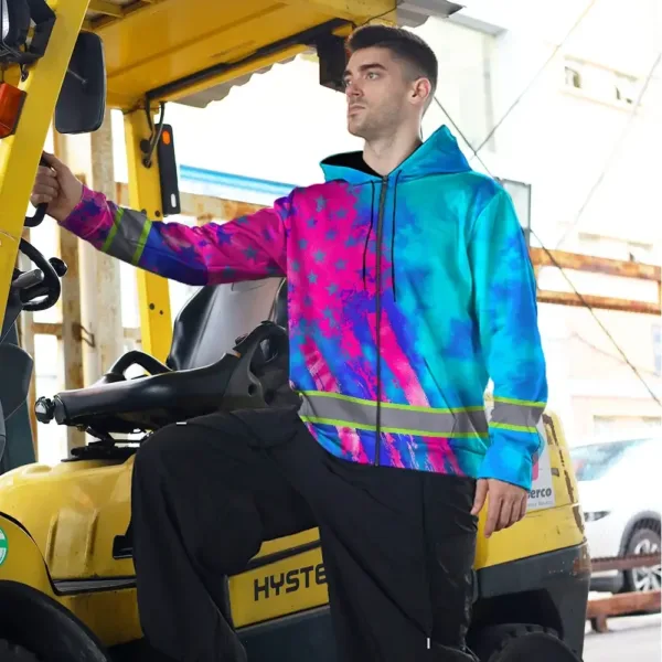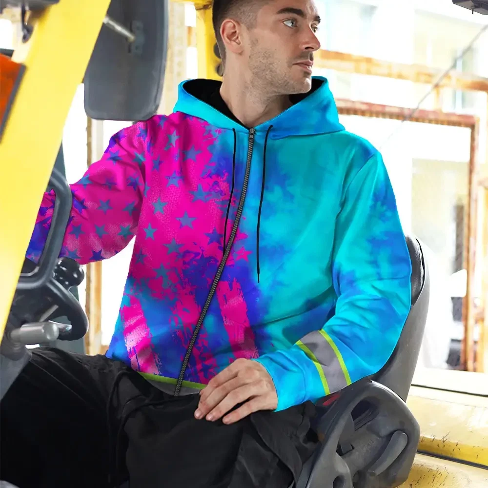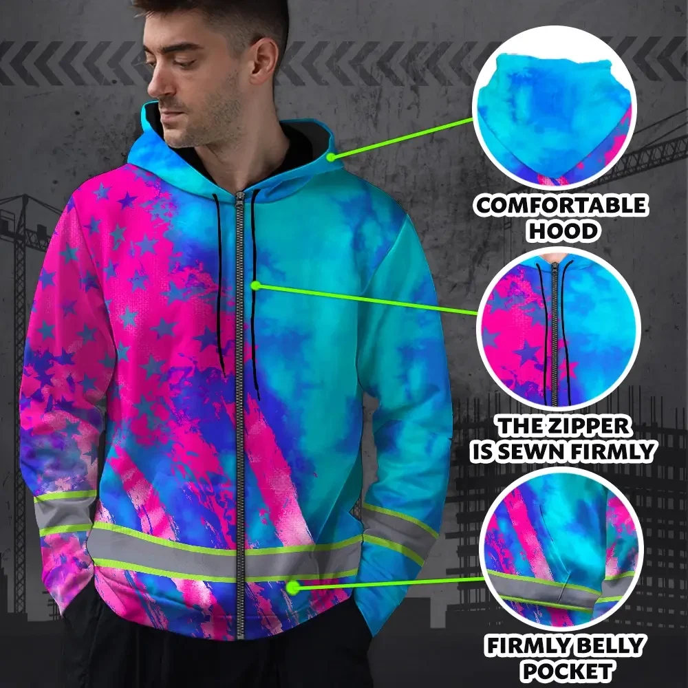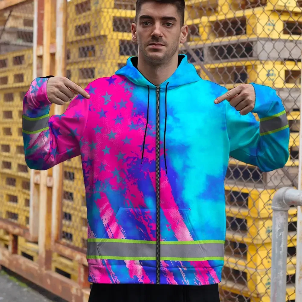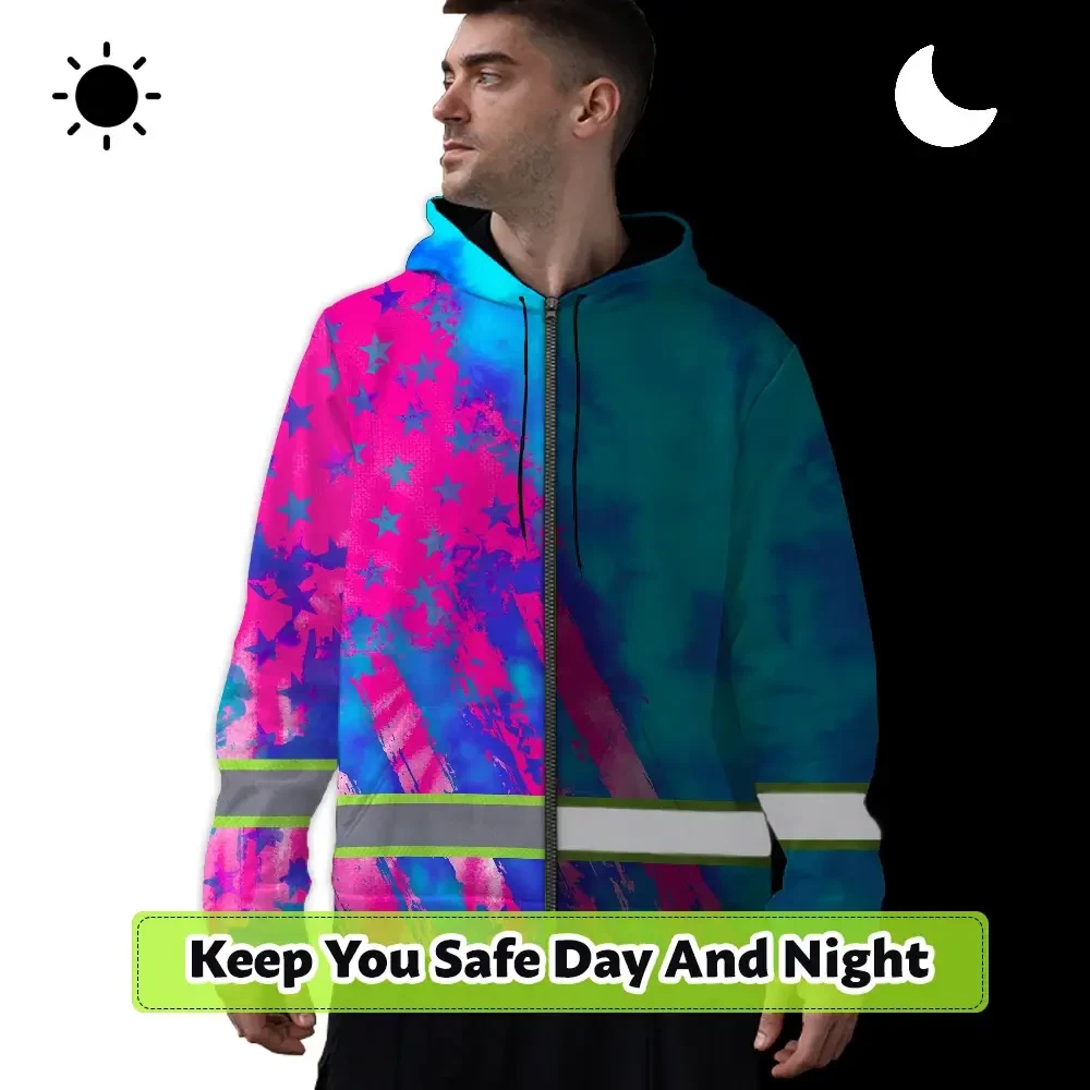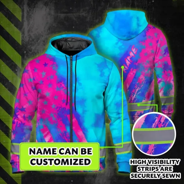 Hi Vis Zip Hoodie Reflective Tapes Blue Pink Flag Custom Name
