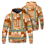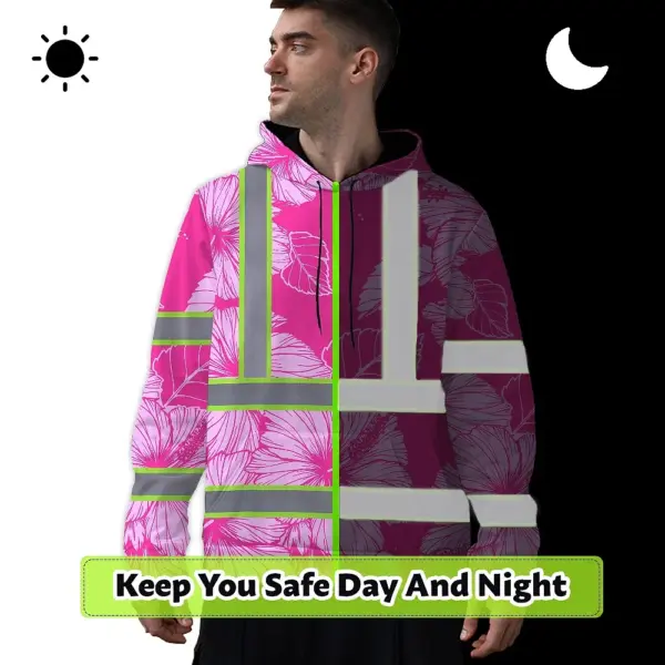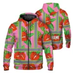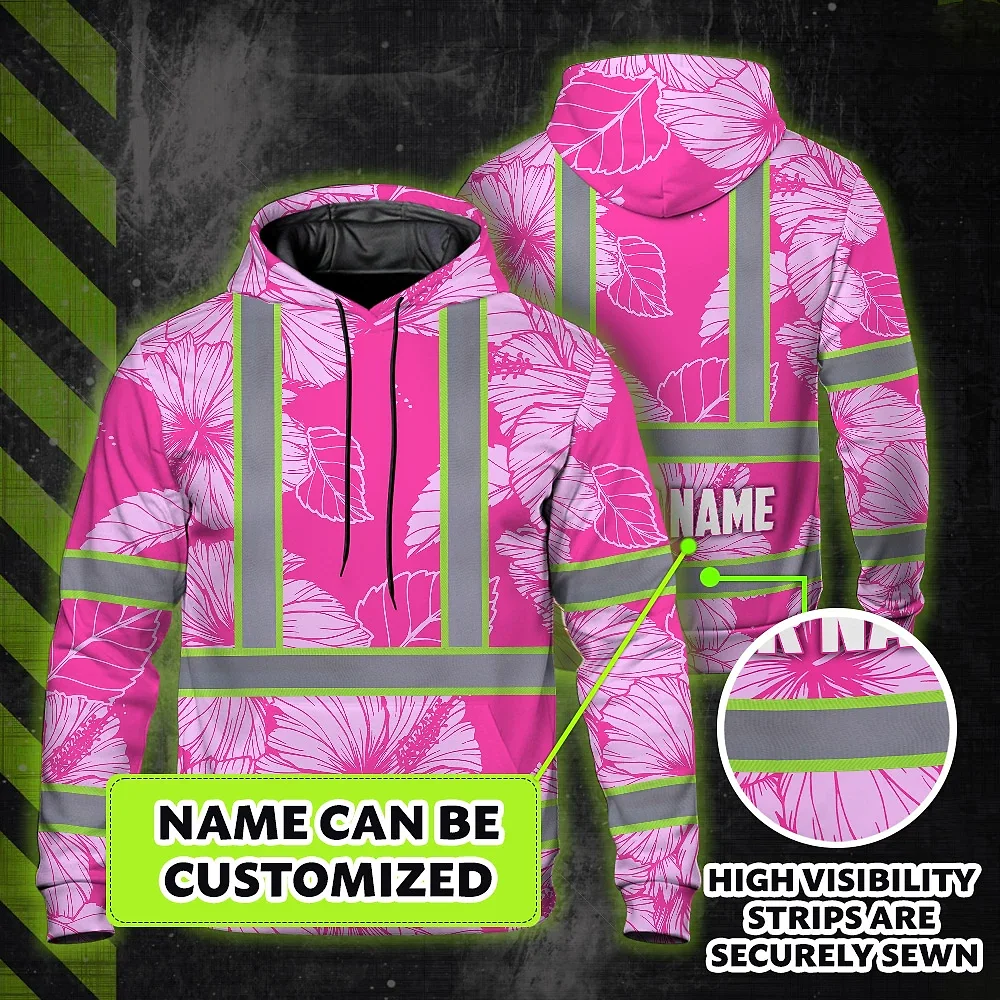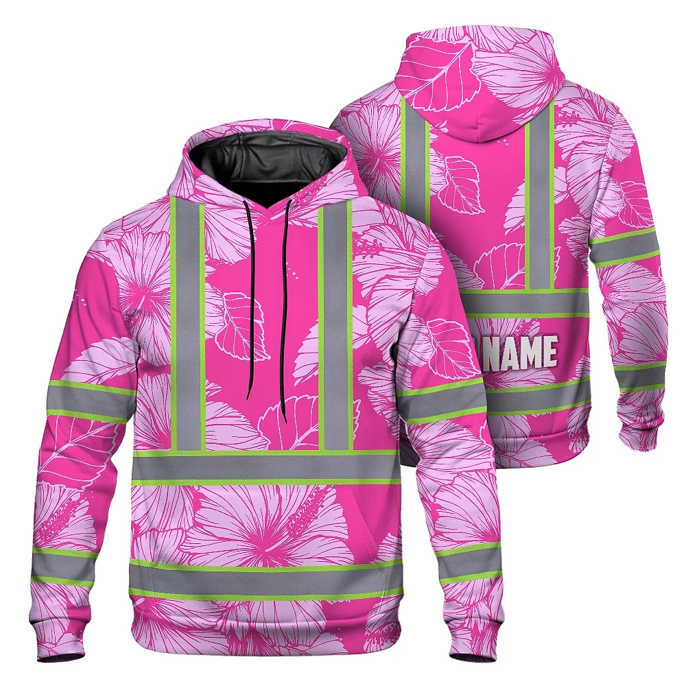 Hi Vis Zip Hoodie Reflective Tapes Pink Neon Hibiscus Custom Name Safety Workwear For Workers, Truckers, Operators