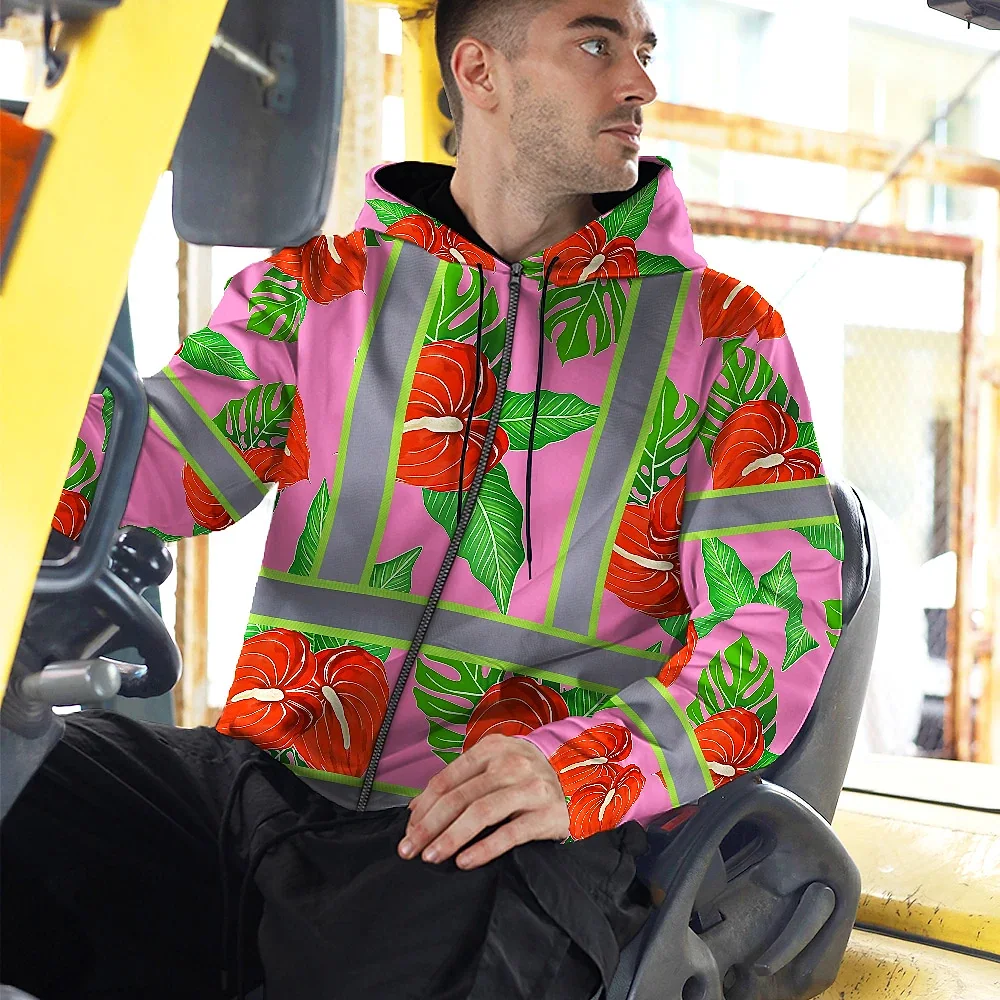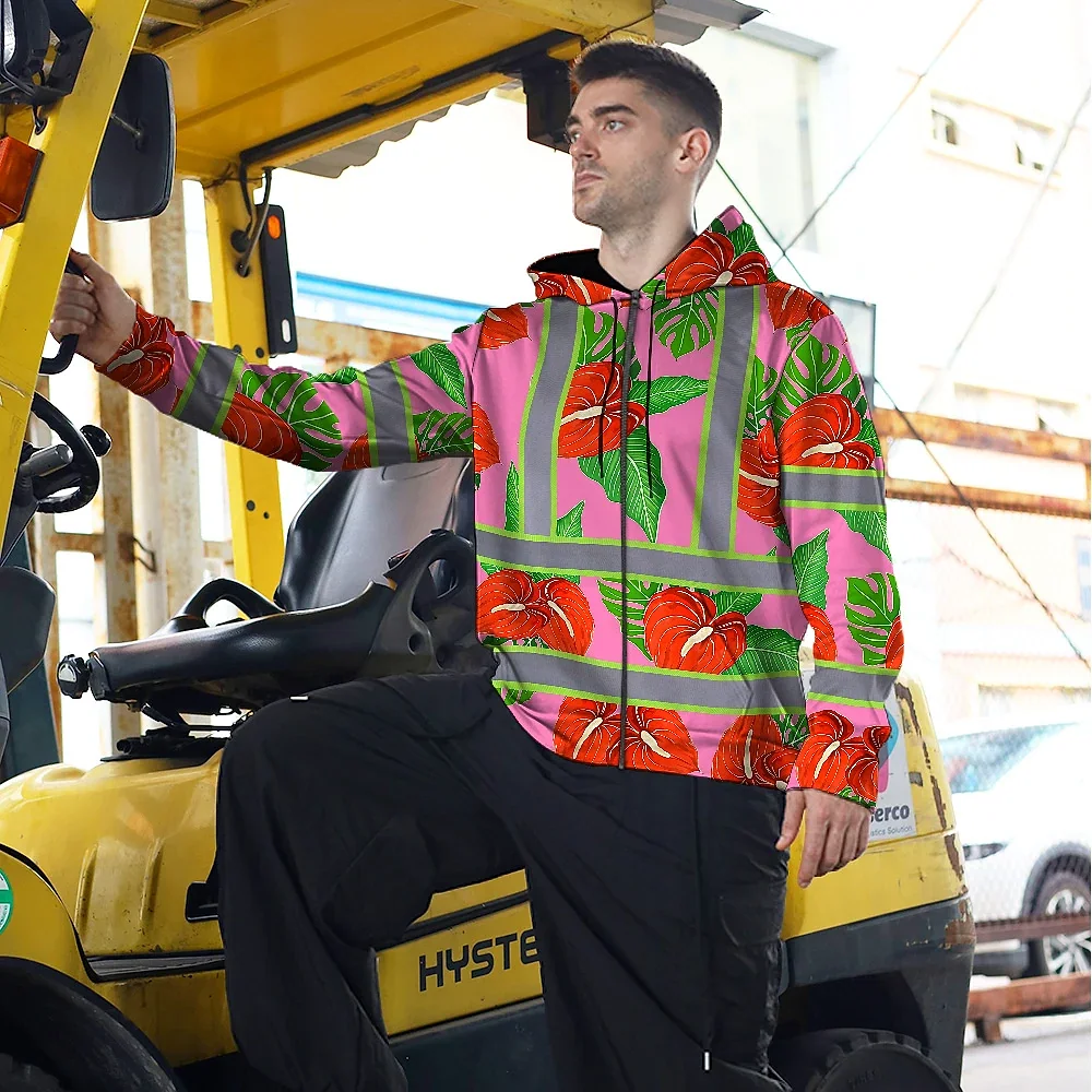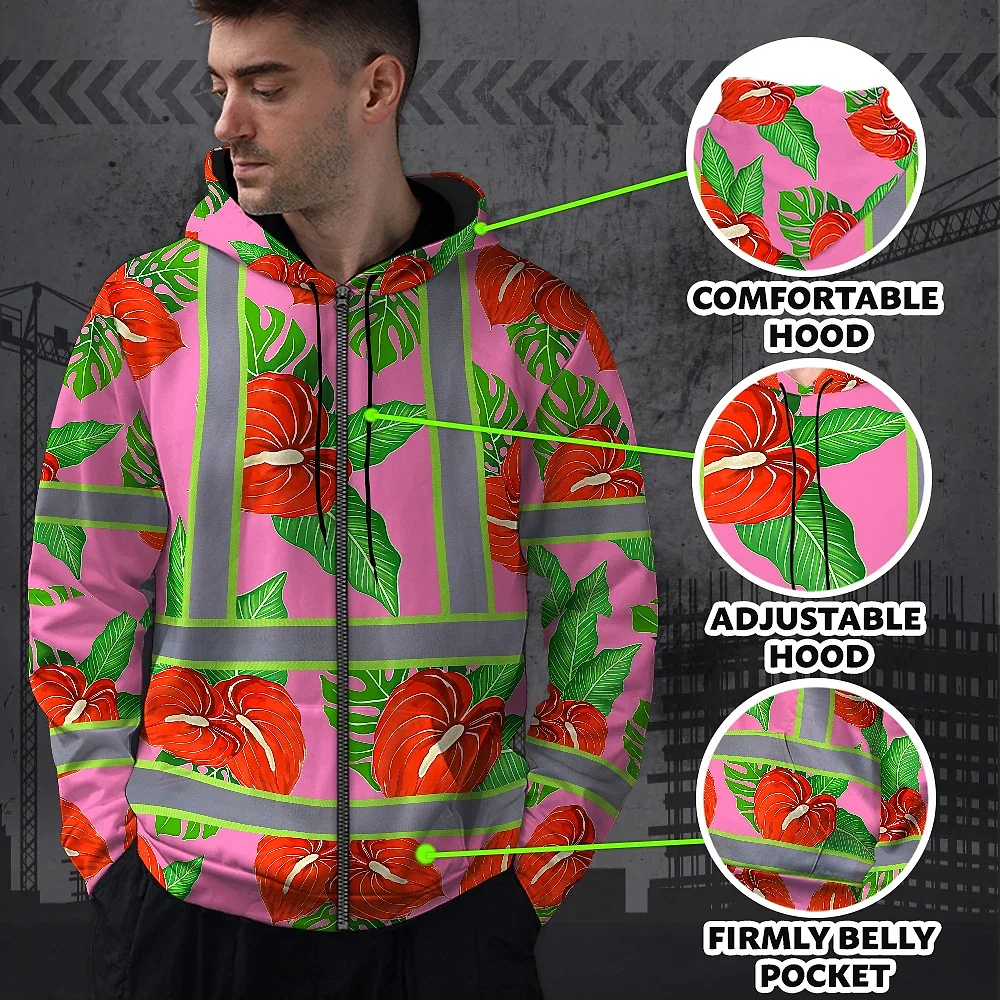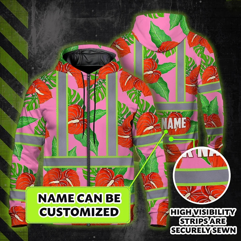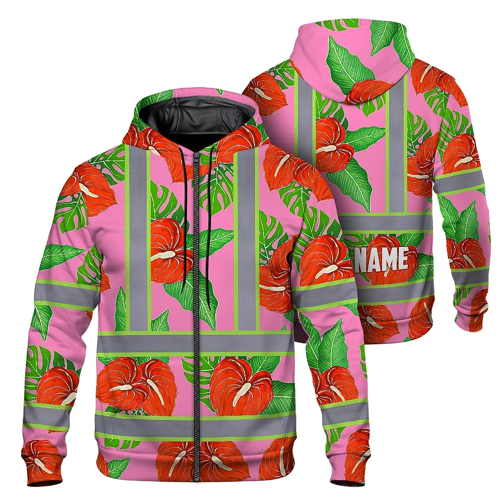 Hi Vis Zip Hoodie Reflective Tapes Pink Neon Red Anthurium Custom Name Safety Workwear For Workers, Truckers, Operators