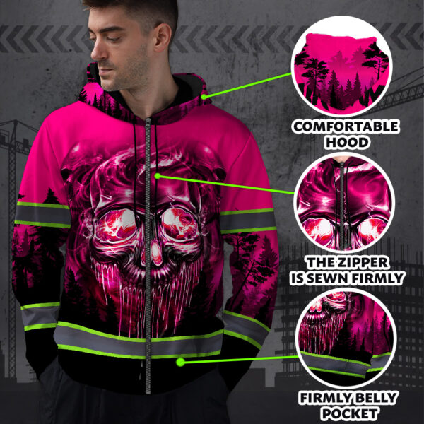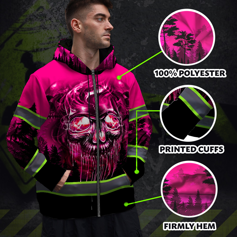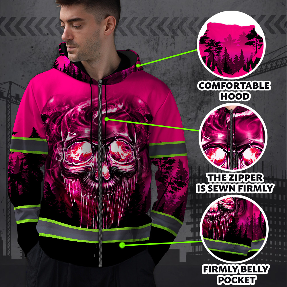 Hi Vis Zip Hoodie Reflective Tapes Skull Pink Neon Workwear Safety For Women Men Worker, Trucker, Operator, Skull Lovers, Drivers, Runners Key Features