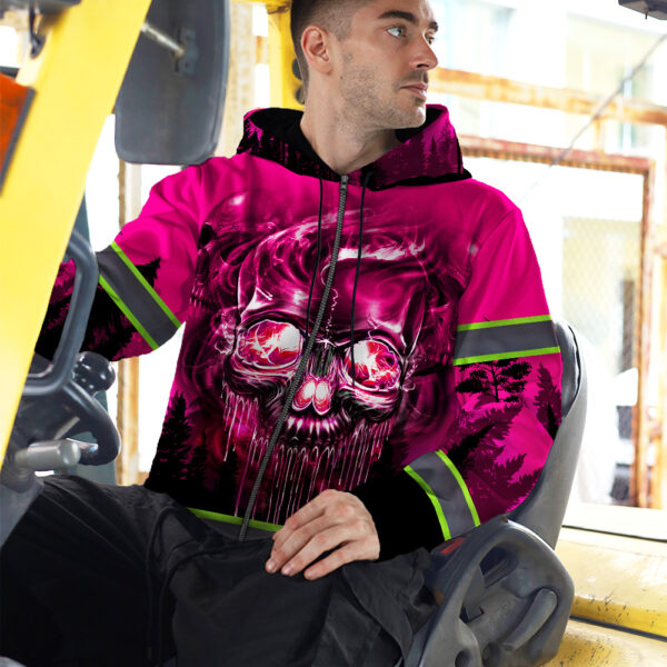 Hi Vis Zip Hoodie Reflective Tapes Skull Pink Neon Workwear Safety For Women Men Worker, Trucker, Operator, Skull Lovers, Drivers, Runners
