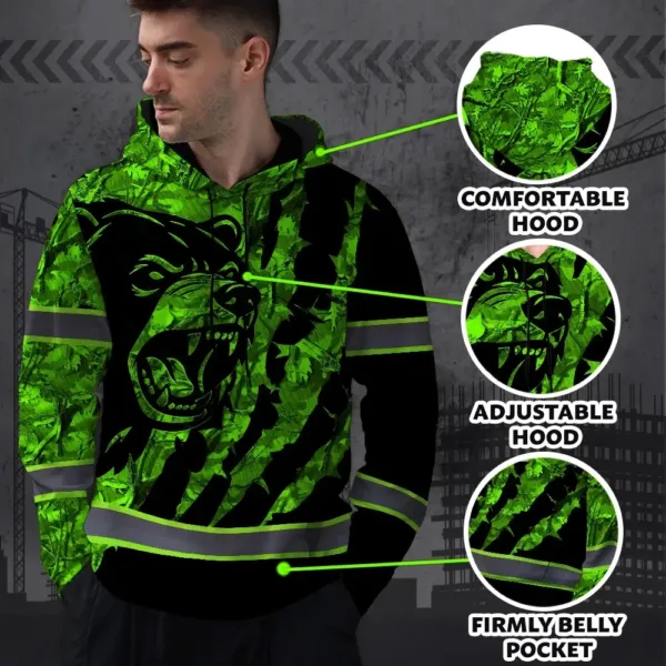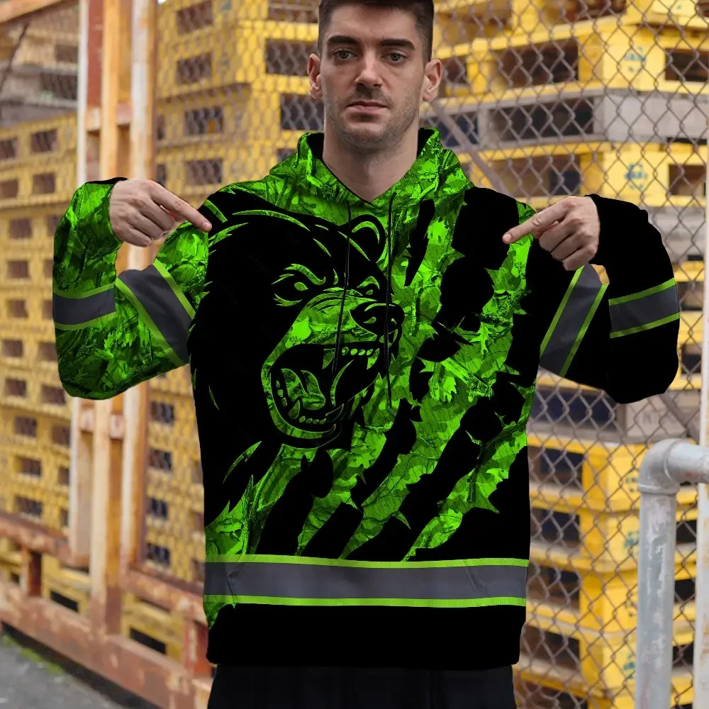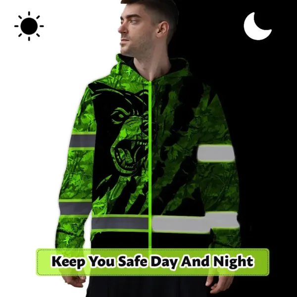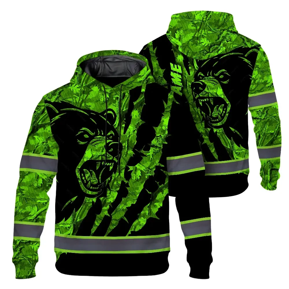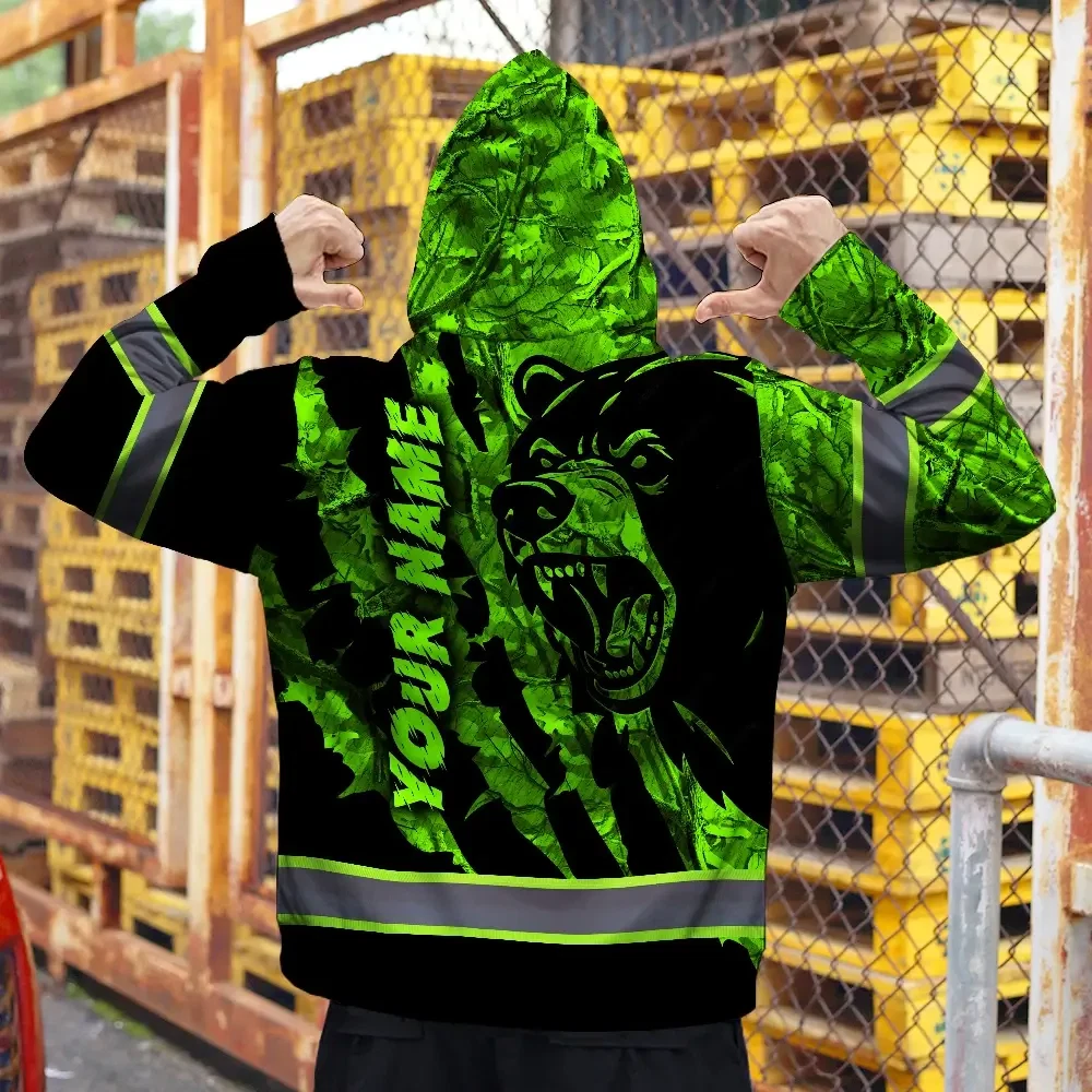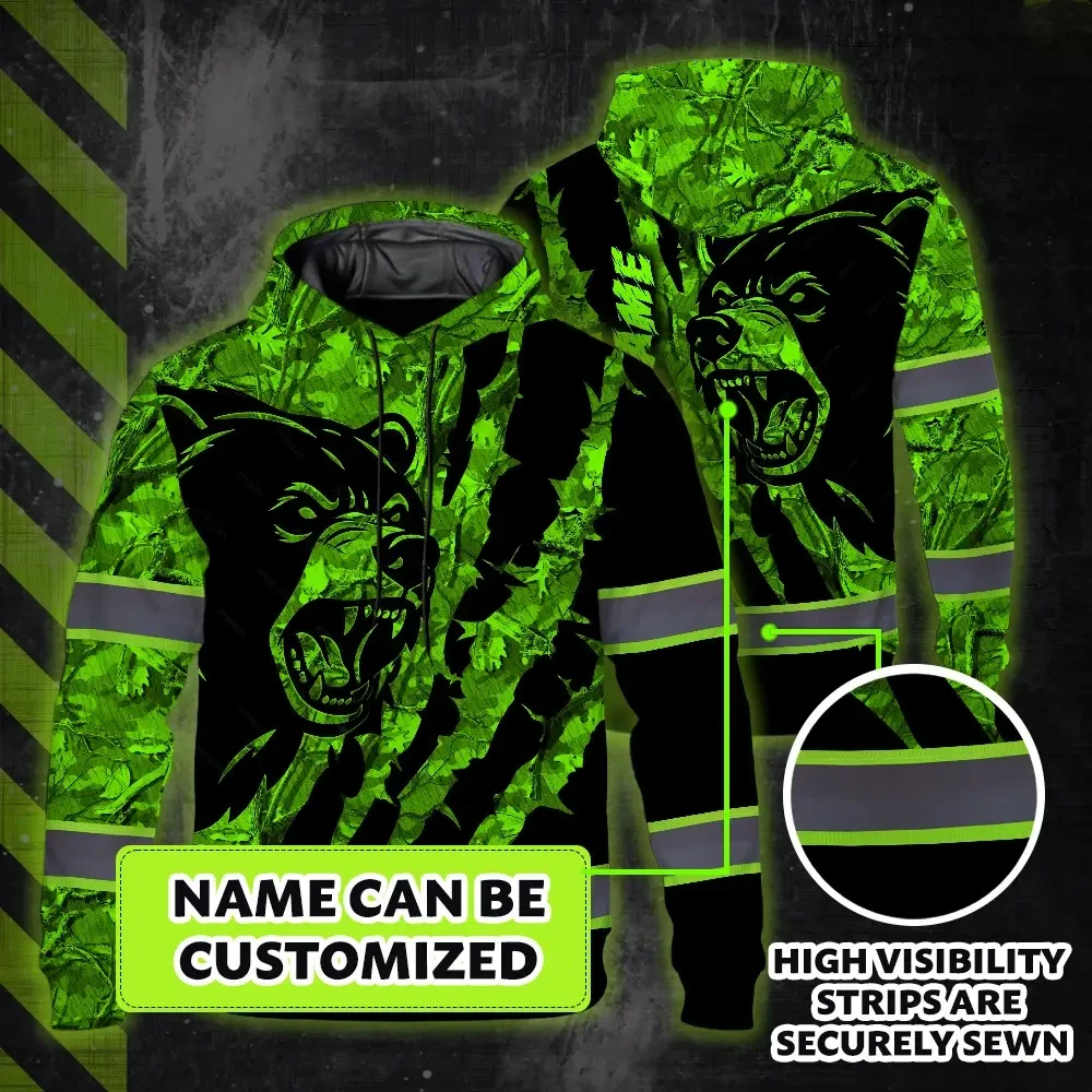 High Visibility Hoodie Bear Hunting Design, Reflective Hi Vis Custom Name Hoodie For Hunting Lover