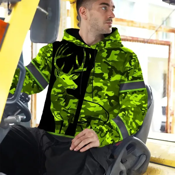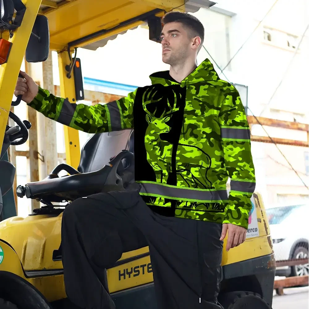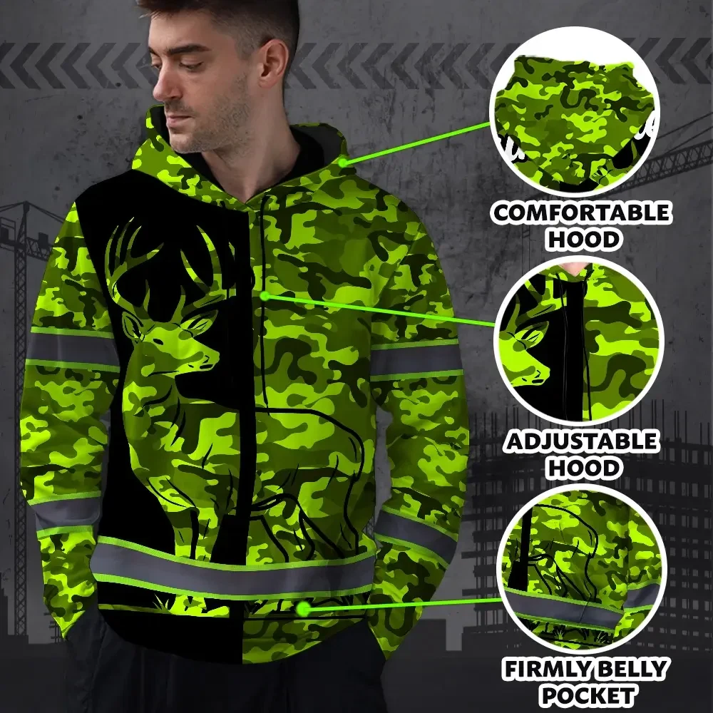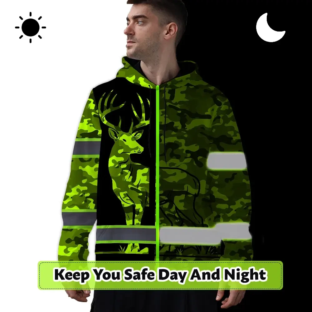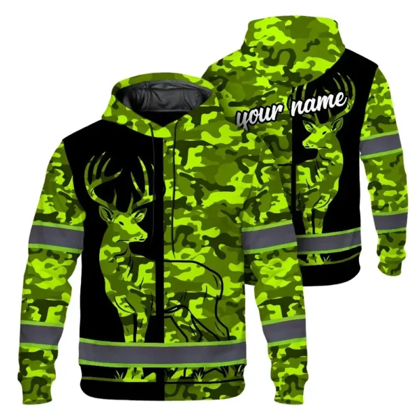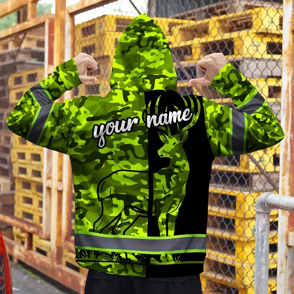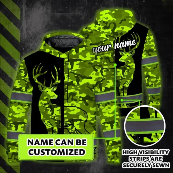 High Visibility Hoodie Camo Hunting Deer Design, Reflective Hi Vis Custom Name Hoodie For Hunting Lover