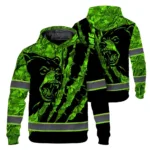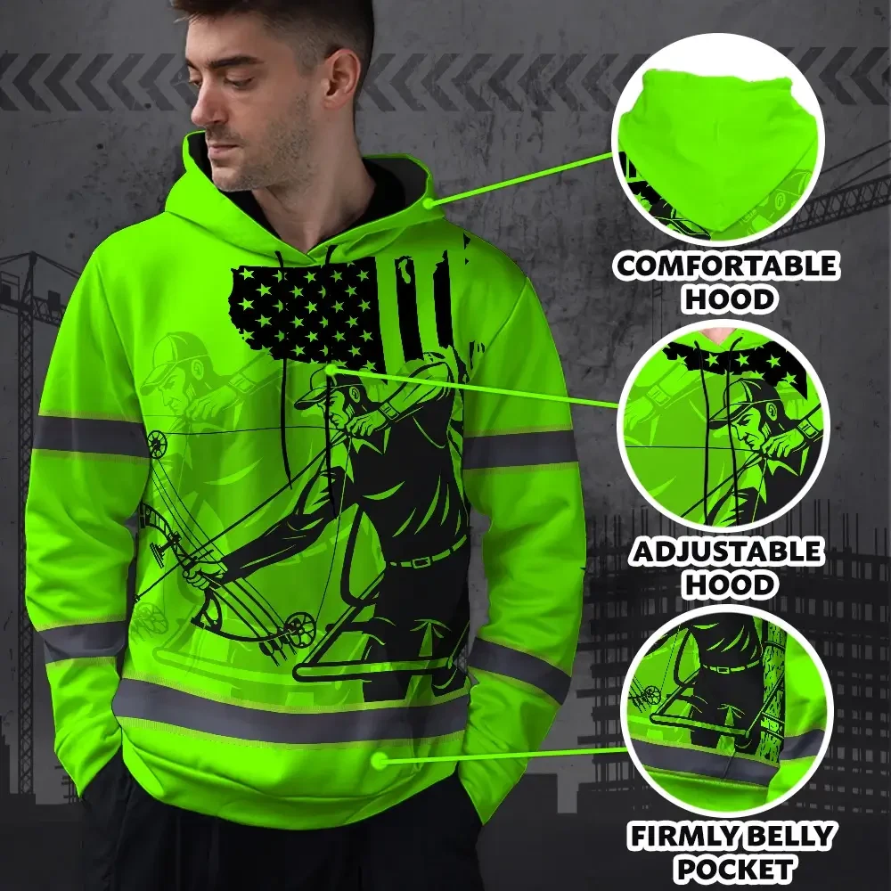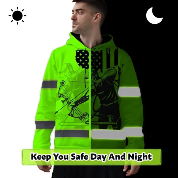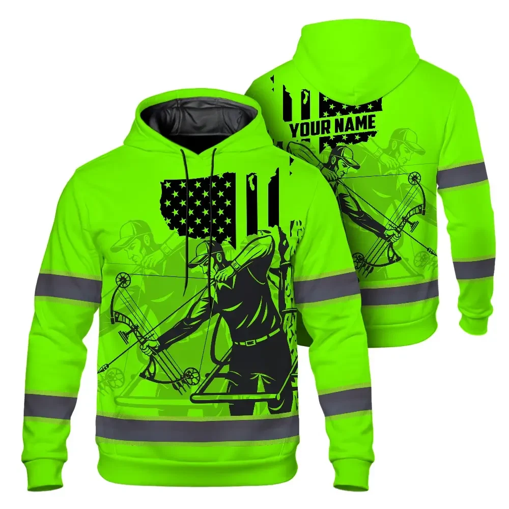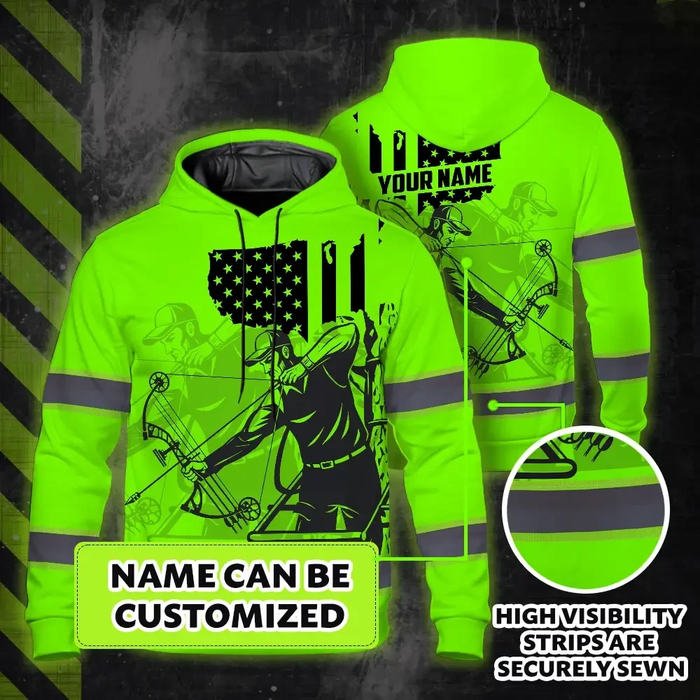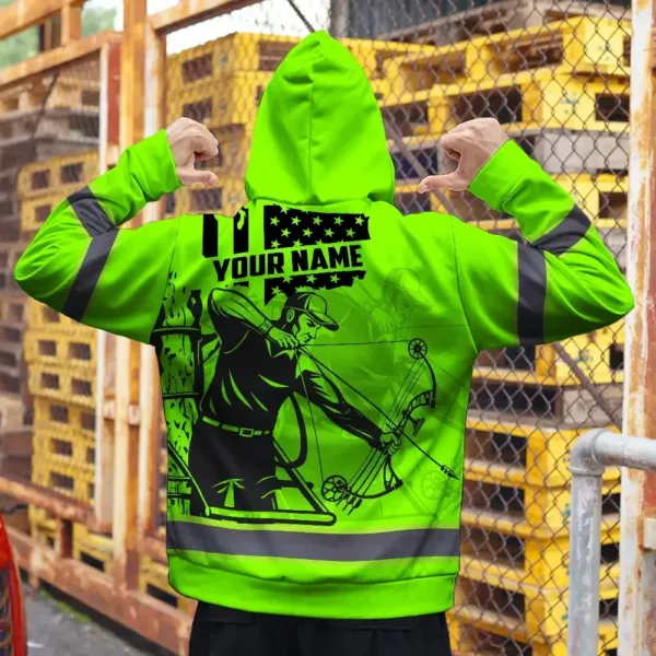 High Visibility Hoodie Green US Flag Hunting Design, Reflective Hi Vis Custom Name Hoodie For Hunting Lover