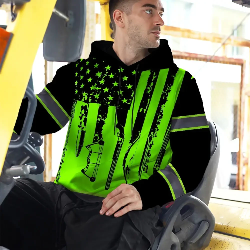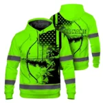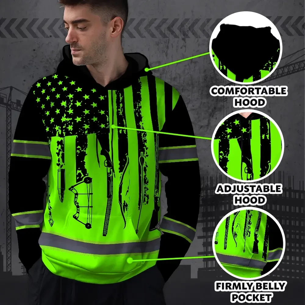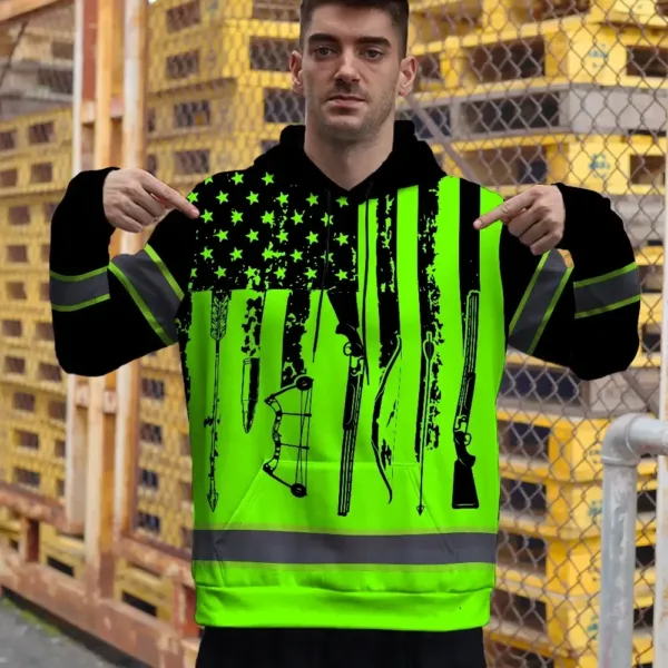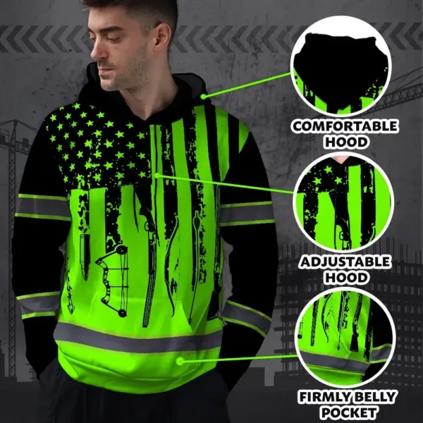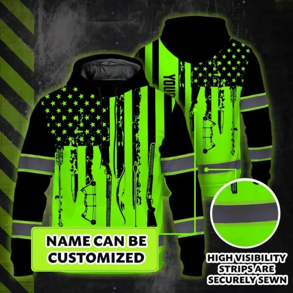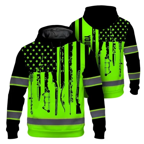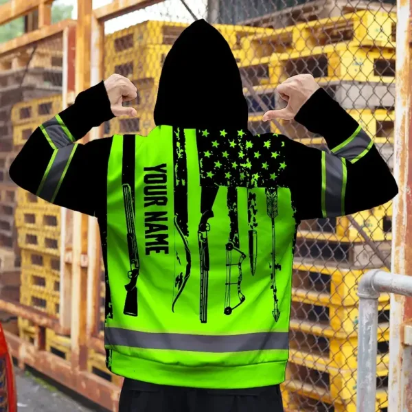 High Visibility Hoodie US Flag Hunting Design, Reflective Hi Vis Custom Name Hoodie For Hunting Lover