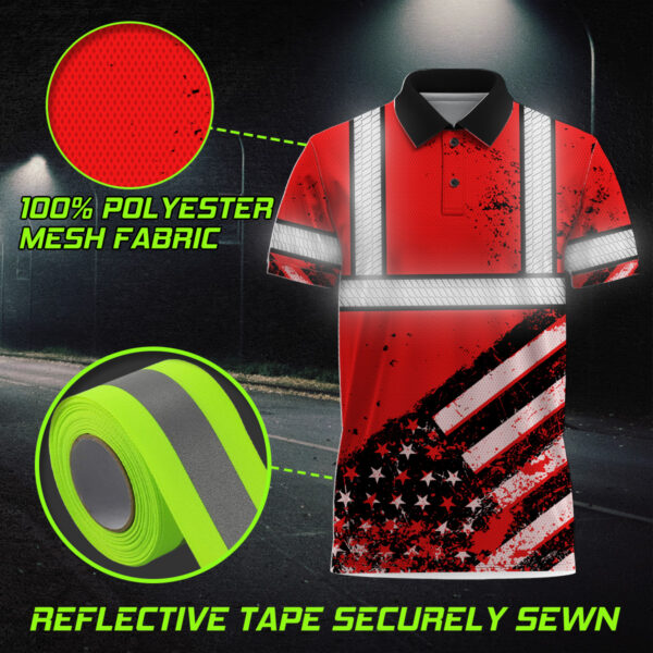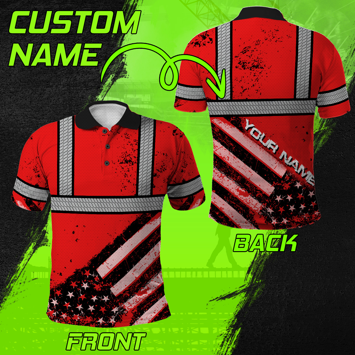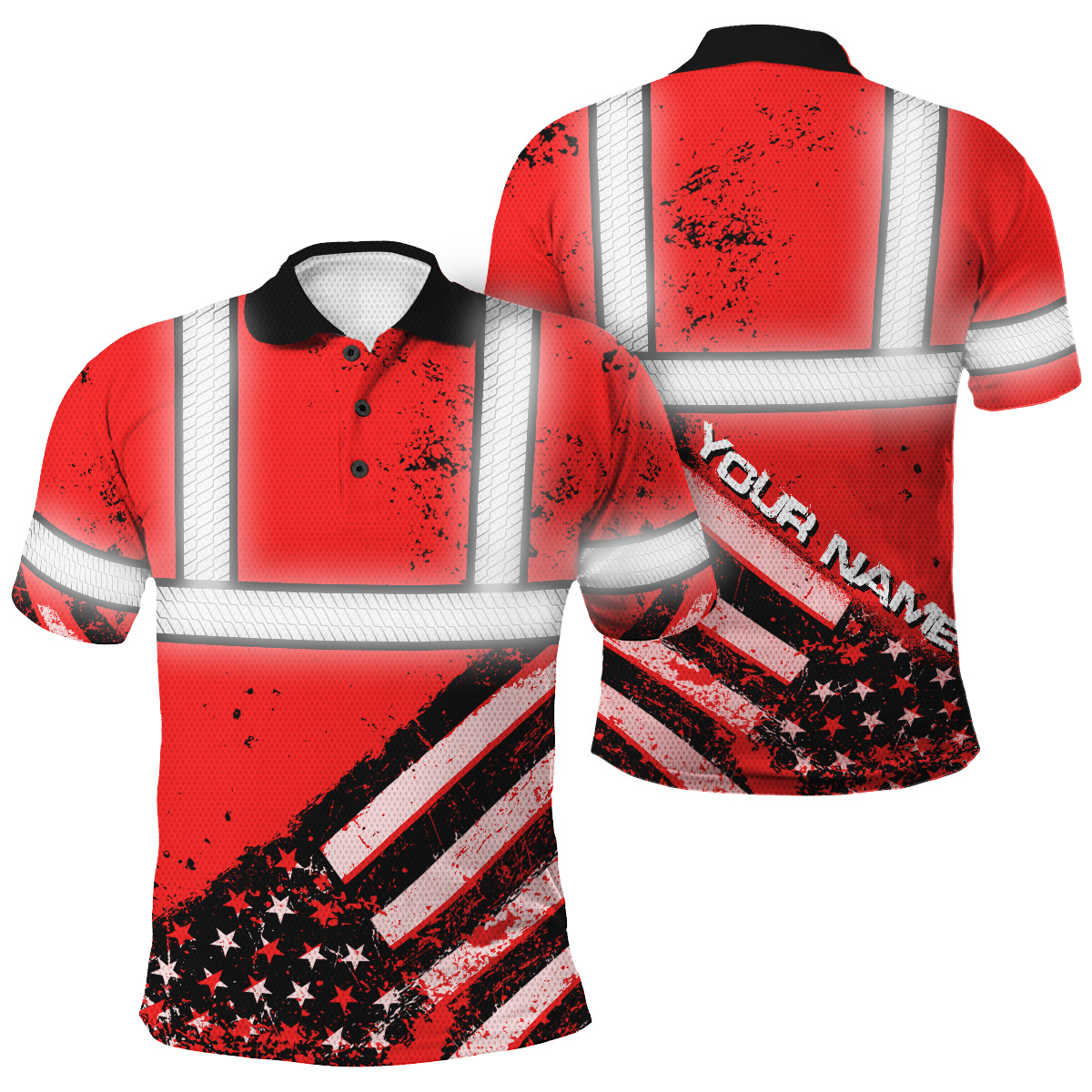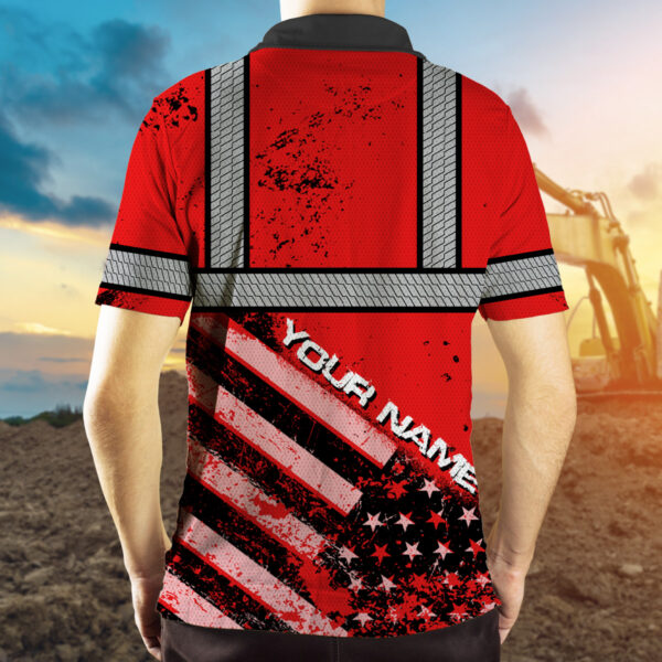 High Visibility Red Polo Shirt Featuring Painted American Flag And Custom Name