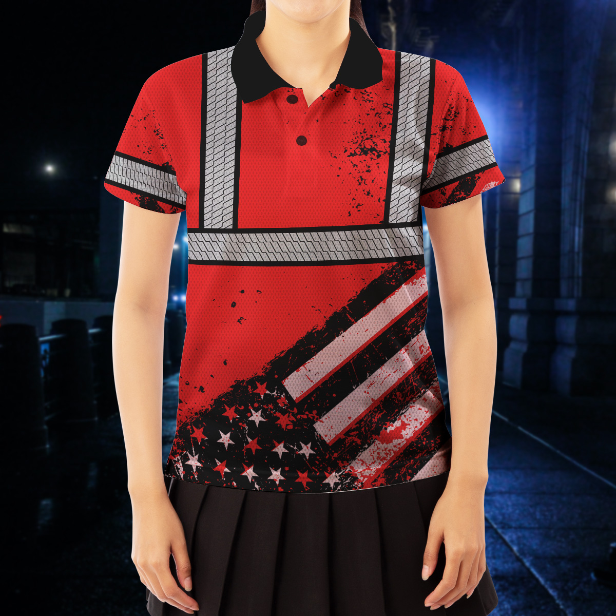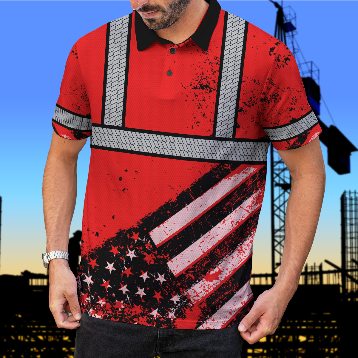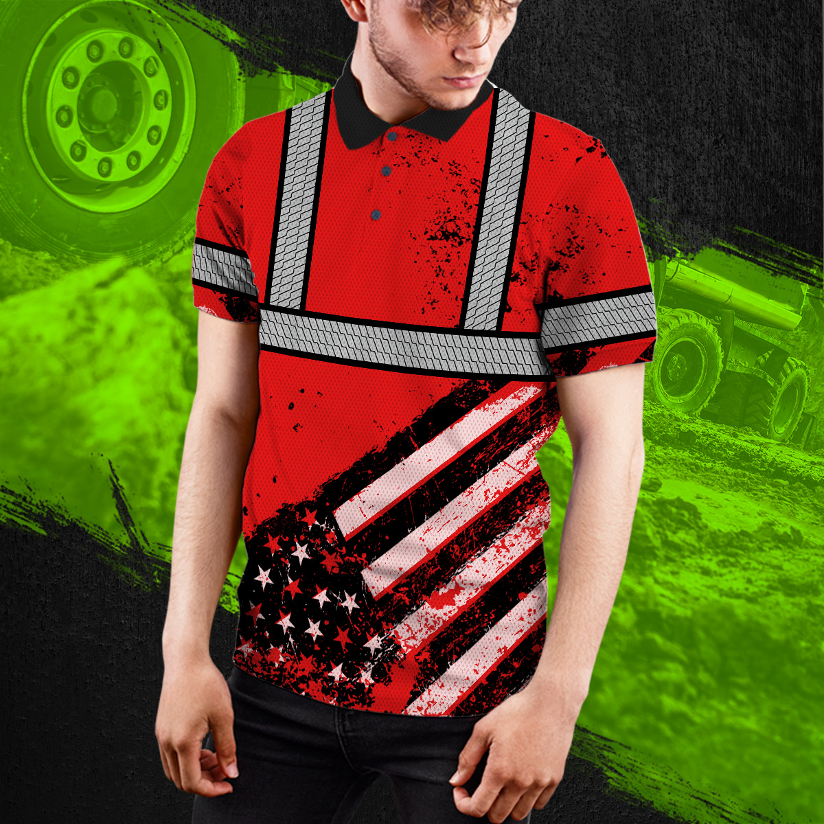 High Visibility Red Polo Shirt Featuring Painted American Flag And Custom Name