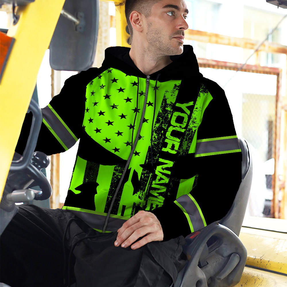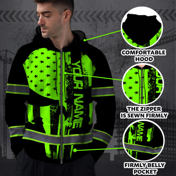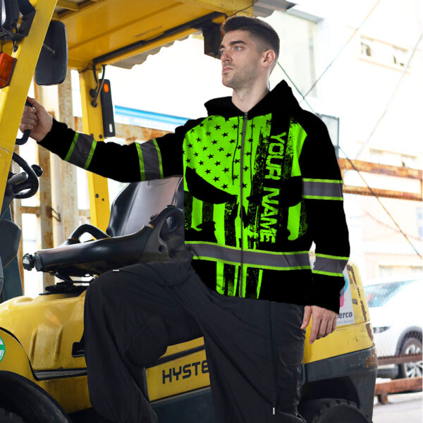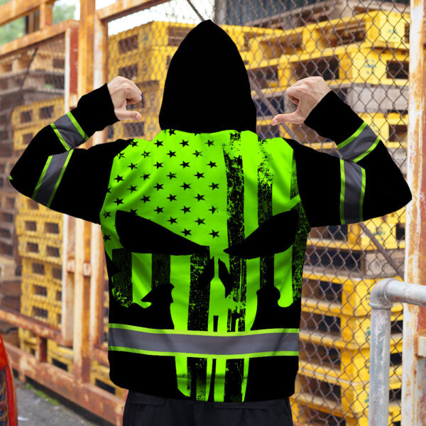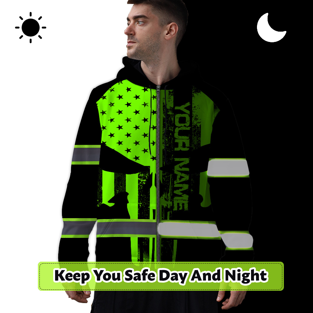 High Visibility Zip Hoodie Green Neon Skull America Flag Custom Name Safety Workwear For Skull Lover Key Features