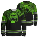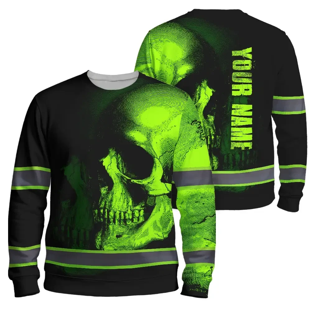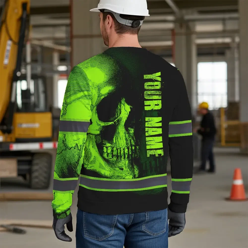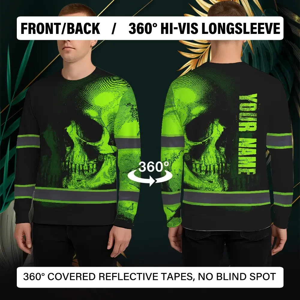 Neon Green Skull Hi Vis Long Sleeve Shirt With Custom Name Designed For Runners, Truckers, And Skull Lovers