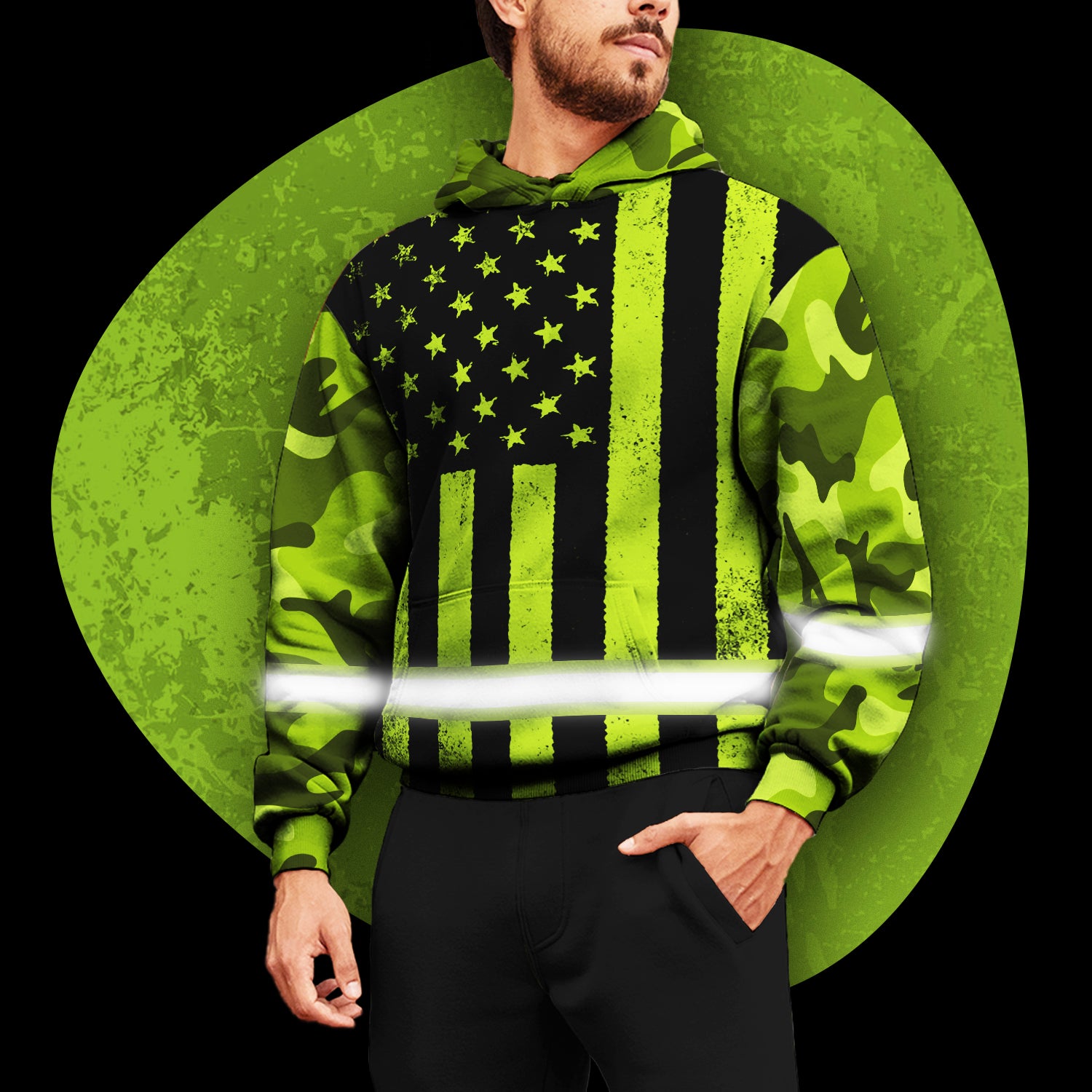 Select options This product has multiple variants. The options may be chosen on the product pageHi Vis Hoodie Patriotic Collection, Hi Vis Hoodies, Hi Vis Patriotic Products, Hi Vis Shirts, Reflective Safety HoodieHi Vis Hoodie Reflective Black Lime USA Flag Safety Workwear For Workers, Runners, Cyclists